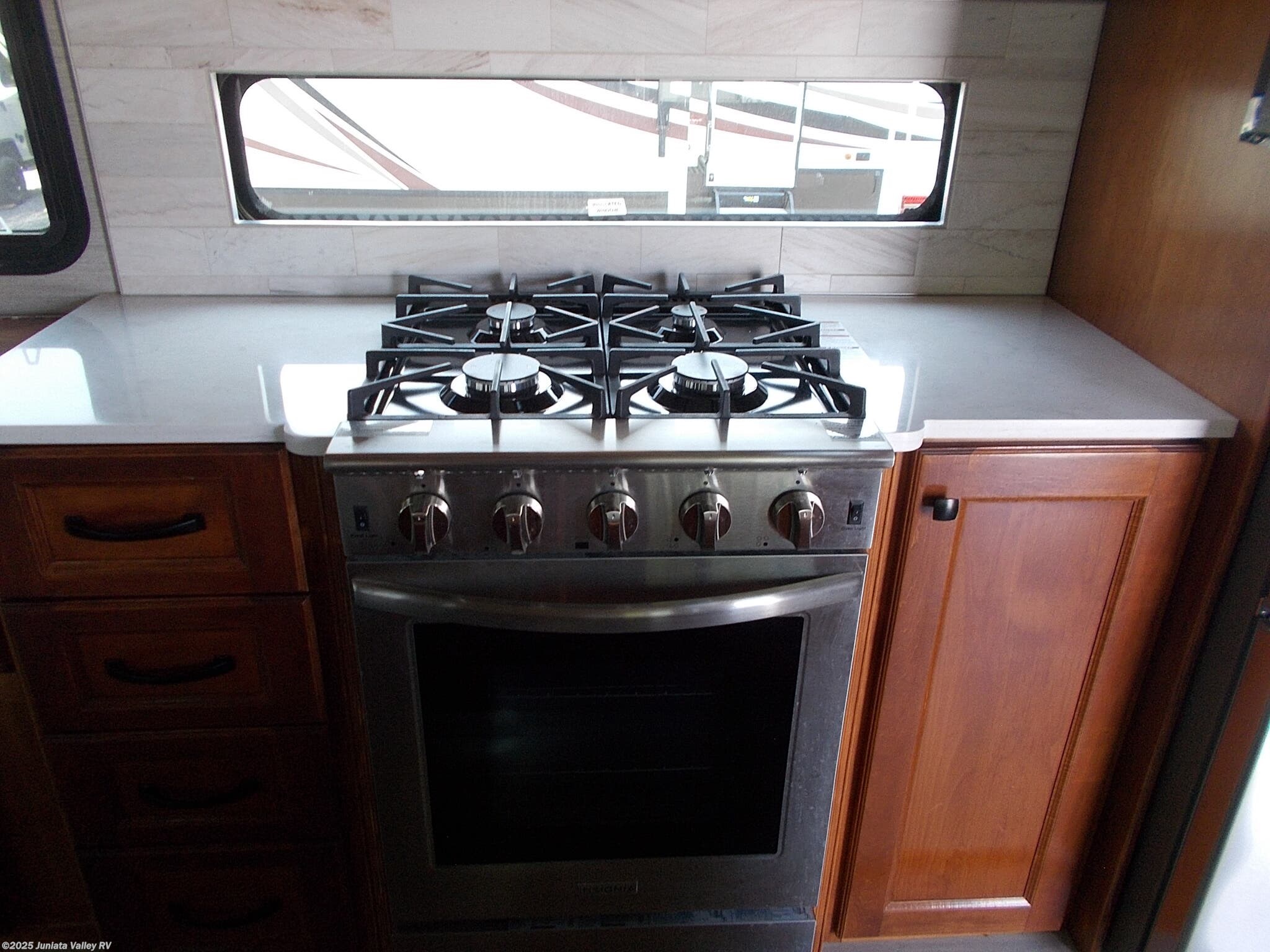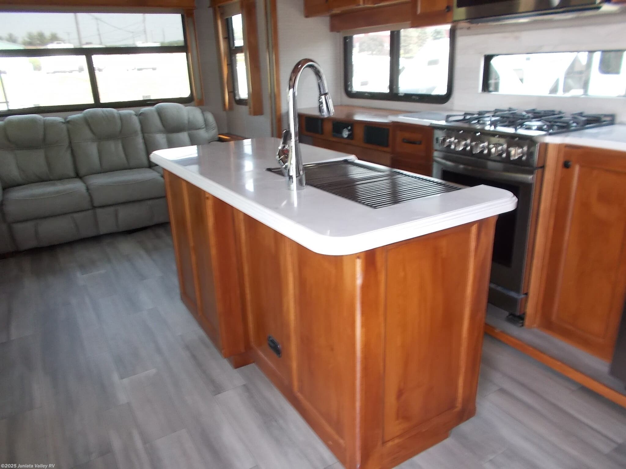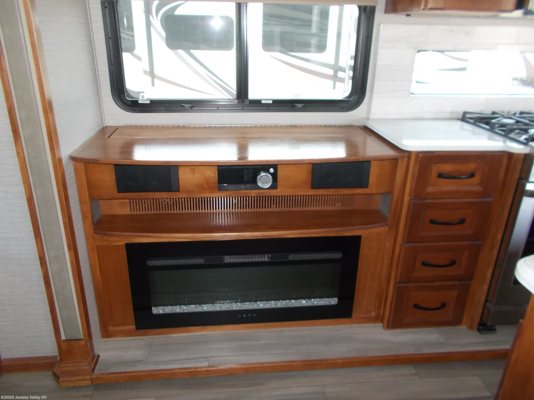 This luxury RV is equipped with a king-size bed, providing restful nights after your adventures, and features separate spaces for relaxation, including plush rocker recliners and a cozy fireplace. The interior is designed to maximize comfort with features like a ceiling fan, skylight, and well-insulated walls to maintain ideal temperatures. Essential kitchen appliances—microwave, oven, refrigerator, and stove top burner—are included for preparing delicious meals on the go.