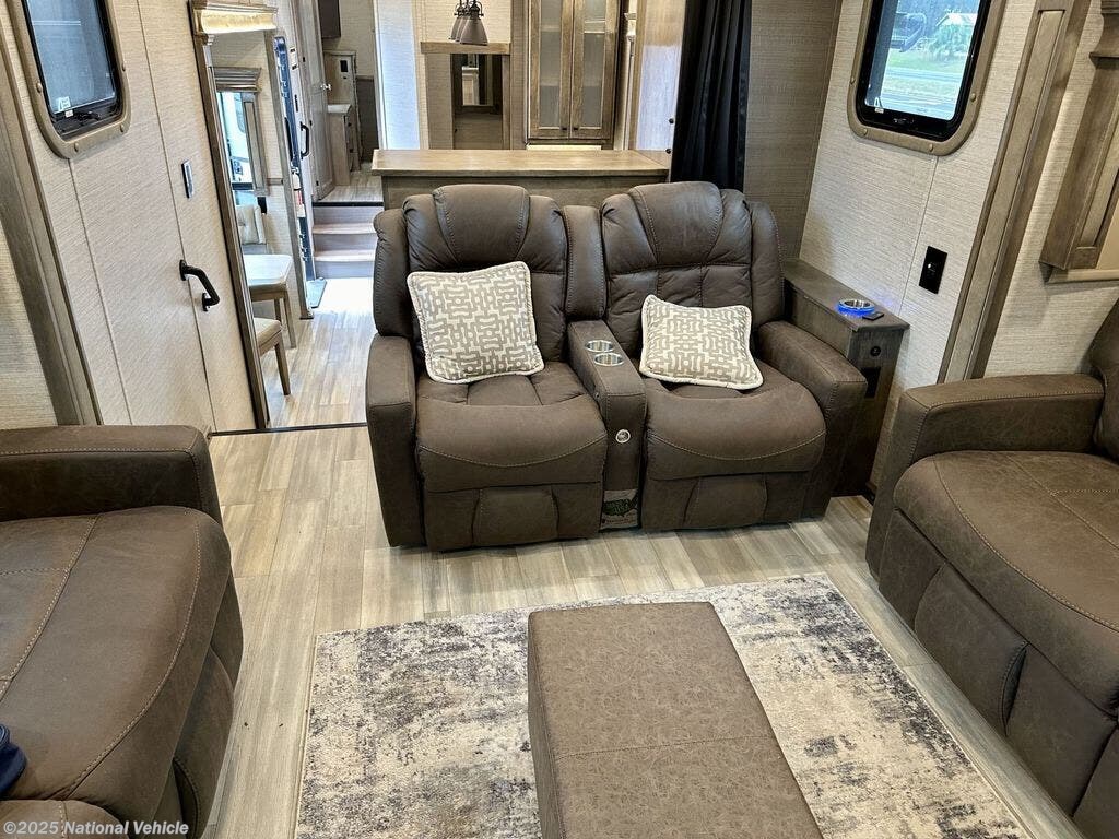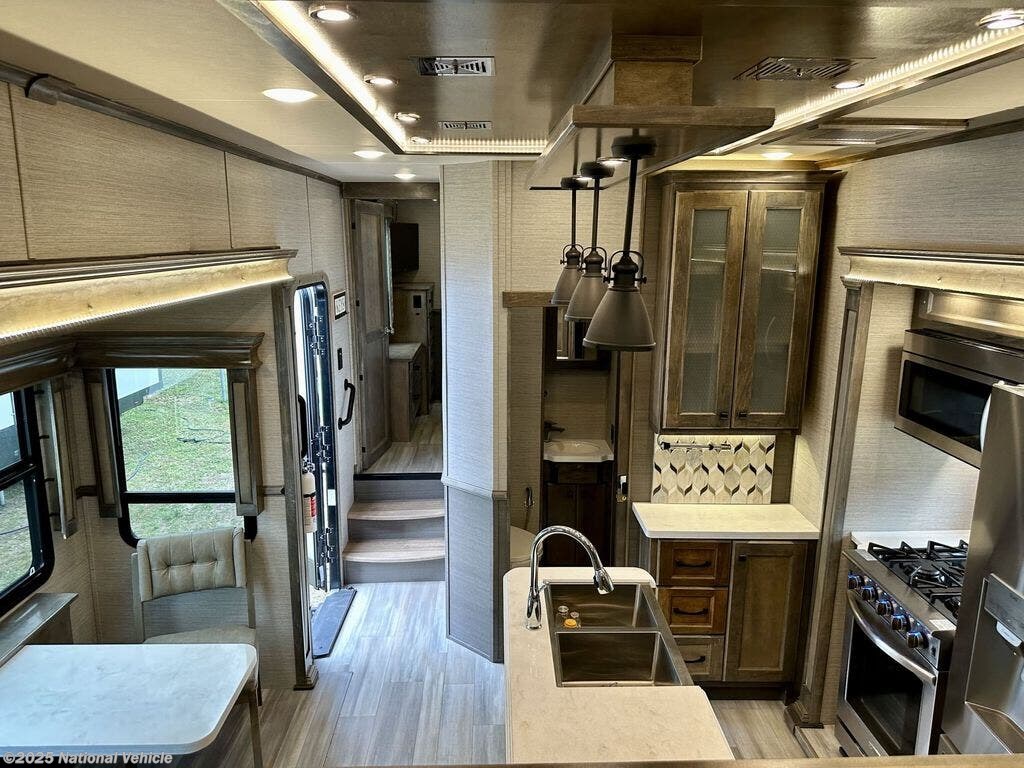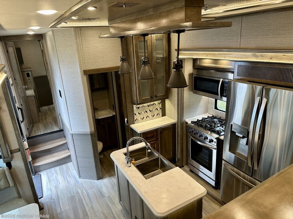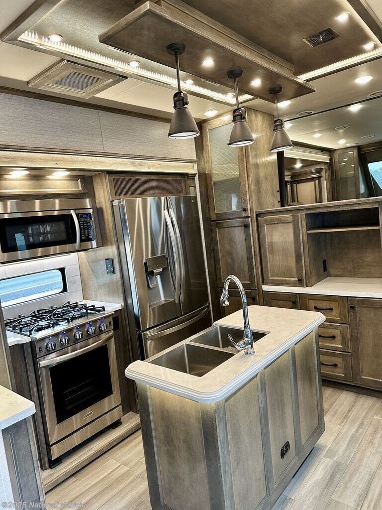 The front living room sets the stage for relaxation, featuring opposing tri-fold sofas, power theater seating, and a large entertainment center with a fireplace and LED TV. The midship kitchen is a gourmet?s dream, offering a residential refrigerator, solid-surface countertops, high-end appliances, and an island that makes cooking and entertaining a pleasure.