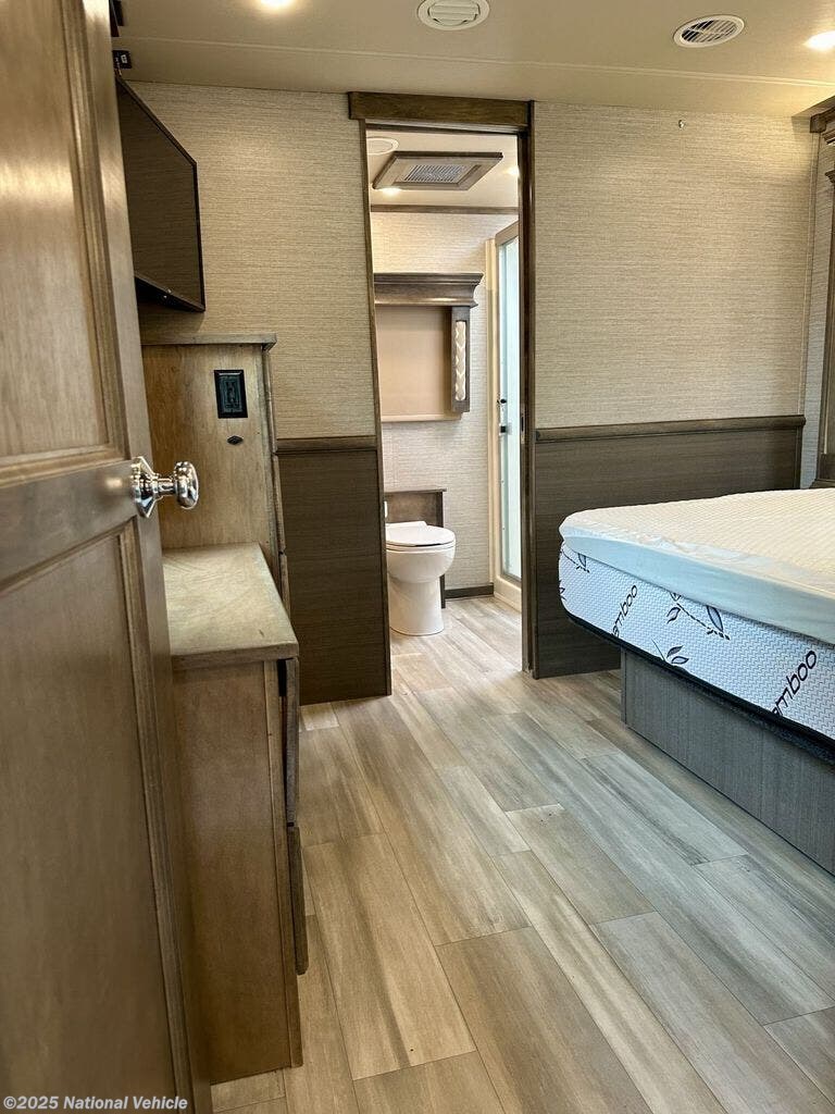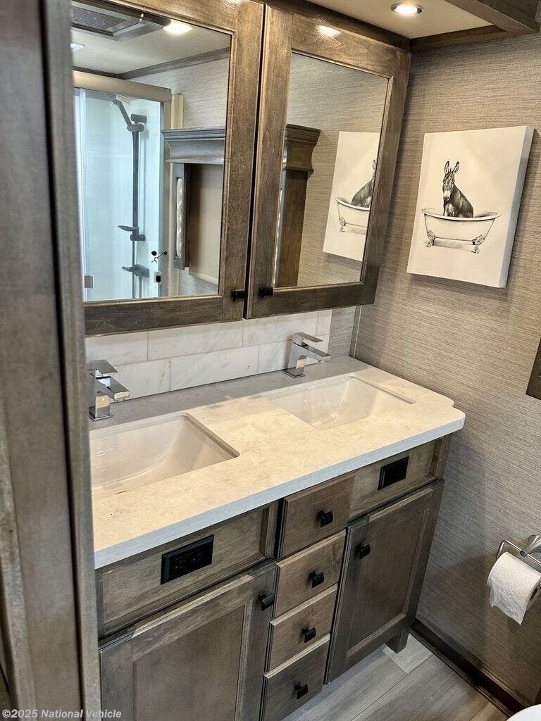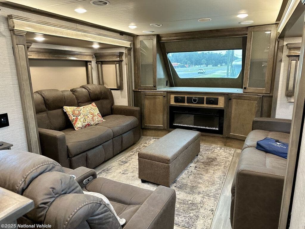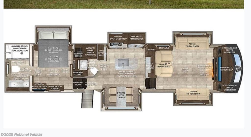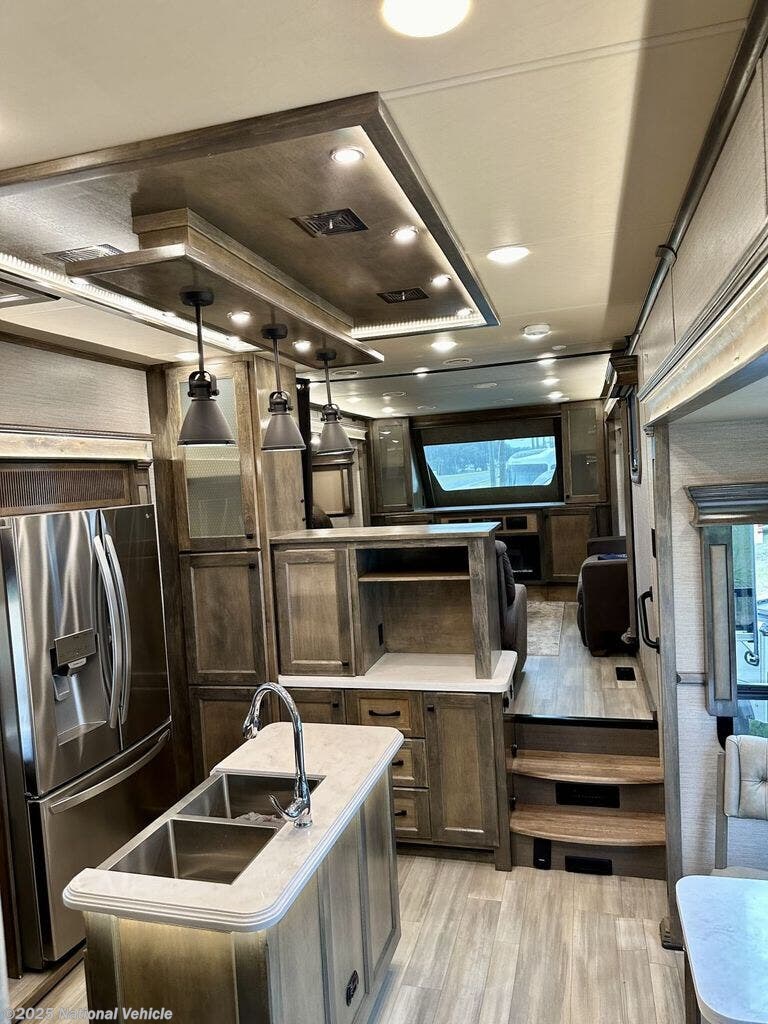 The front living room sets the stage for relaxation, featuring opposing tri-fold sofas, power theater seating, and a large entertainment center with a fireplace and LED TV. The midship kitchen is a gourmet?s dream, offering a residential refrigerator, solid-surface countertops, high-end appliances, and an island that makes cooking and entertaining a pleasure.