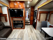 Your family vacations just got a whole lot sweeter in this fifth wheel that can sleep four people each night. Once you arrive at the campground, put out the four slides, then enjoy lunch on the dinette with chairs. The dual opposing slides here will let the kids play a board game on the floor if they want, and you and your spouse can relax on the theater sofa. Prep and cook all your meals in the rear kitchen that includes ample counter space, an Insignia oven and cooktop, plus an optional dishwasher to make cleaning up easier than ever. The master bedroom includes sliding doors to save on space, a king bed, plus a bedroom fireplace for a cozy evening indoors. You will love the front bath with its dual bath sinks, spacious shower with a Teak Wood seat, plus a large front closet with tons of storage space. This model also includes a convenient half bath for your guests, now that's what I call luxury!