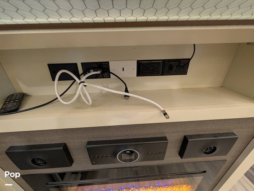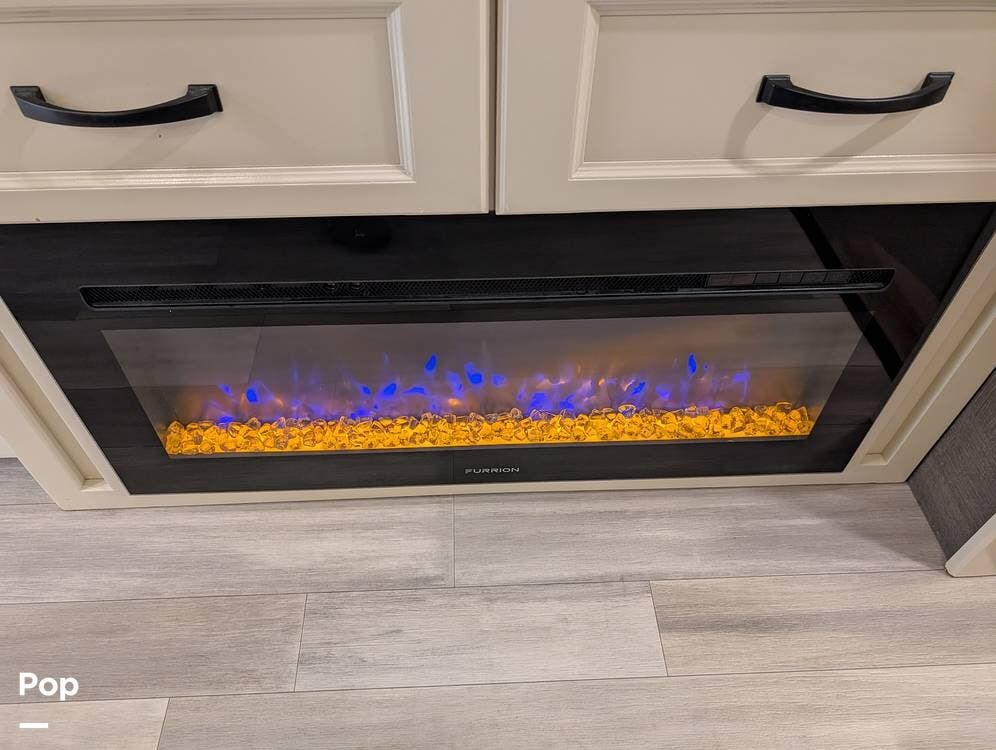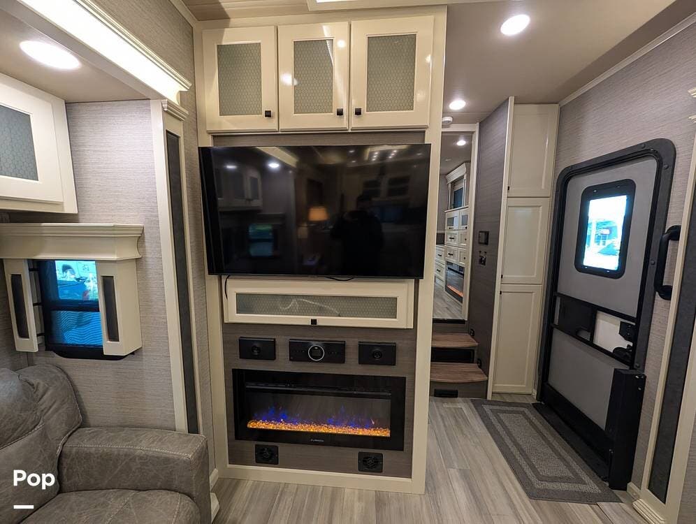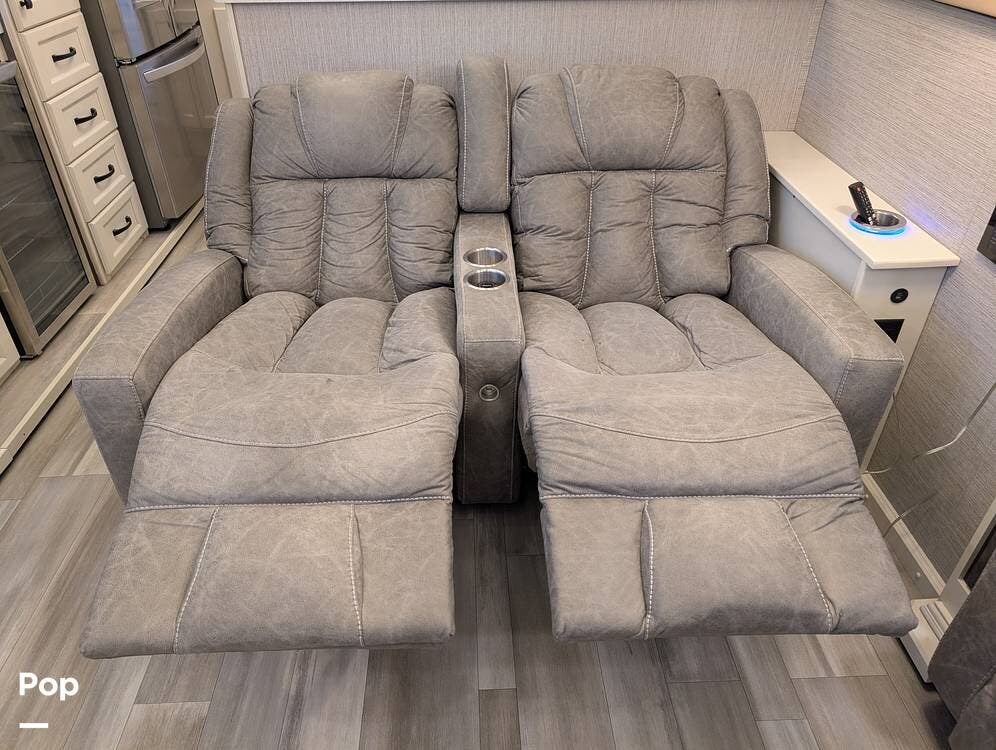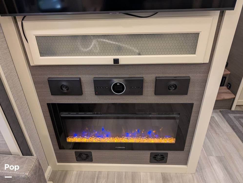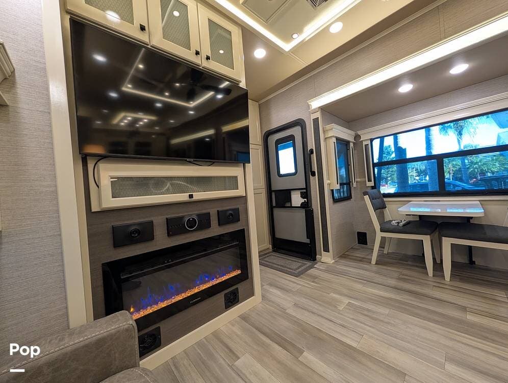 The mid living area is warm and inviting, centered around a fireplace with a large 42-inch TV and integrated sound system. Seating includes a plush power-reclining loveseat, a sleeper sofa for guests, and a freestanding dinette, creating a comfortable space for relaxing or entertaining. Conveniently located in the center of the coach is a dedicated half bath for guests, offering privacy and ease of use without entering the master suite. An exterior entertainment center further enhances the living experience, featuring an outdoor TV, stereo, and speakers--perfect for enjoying evenings outside.
