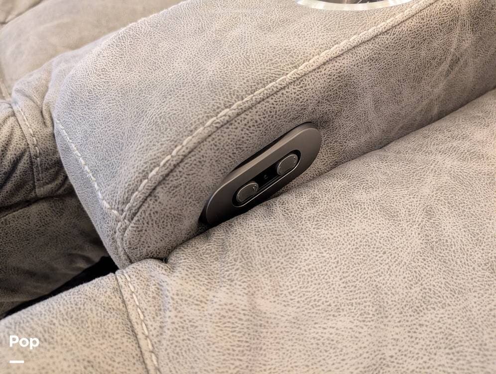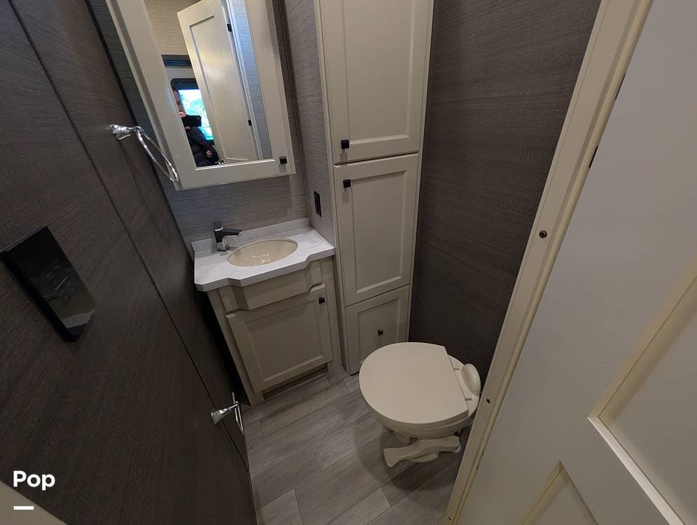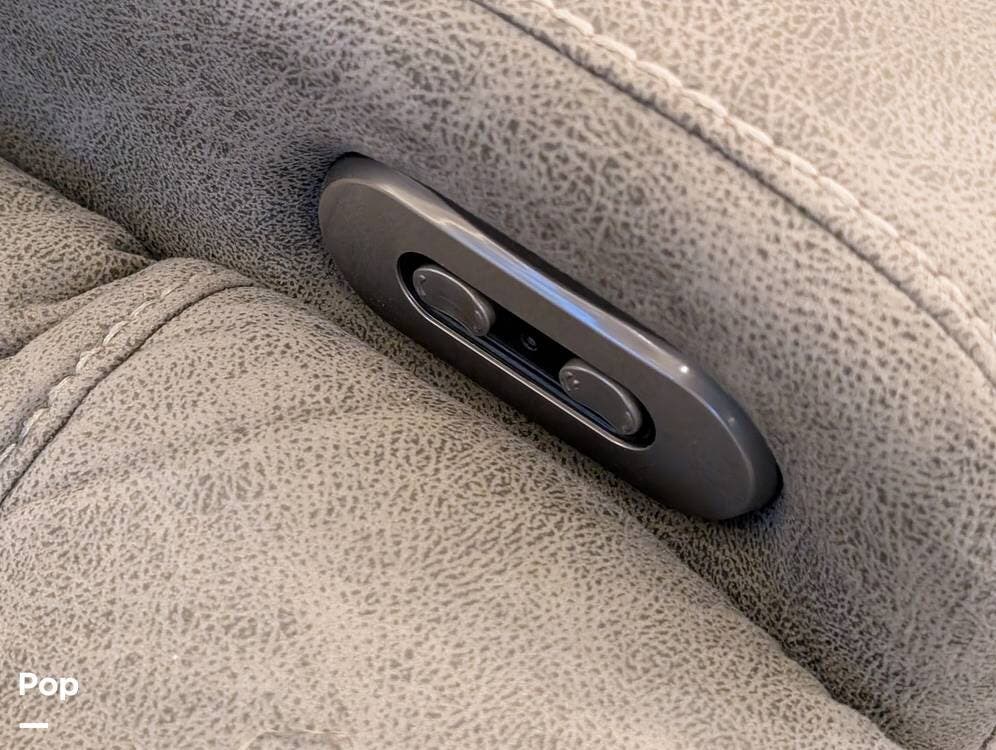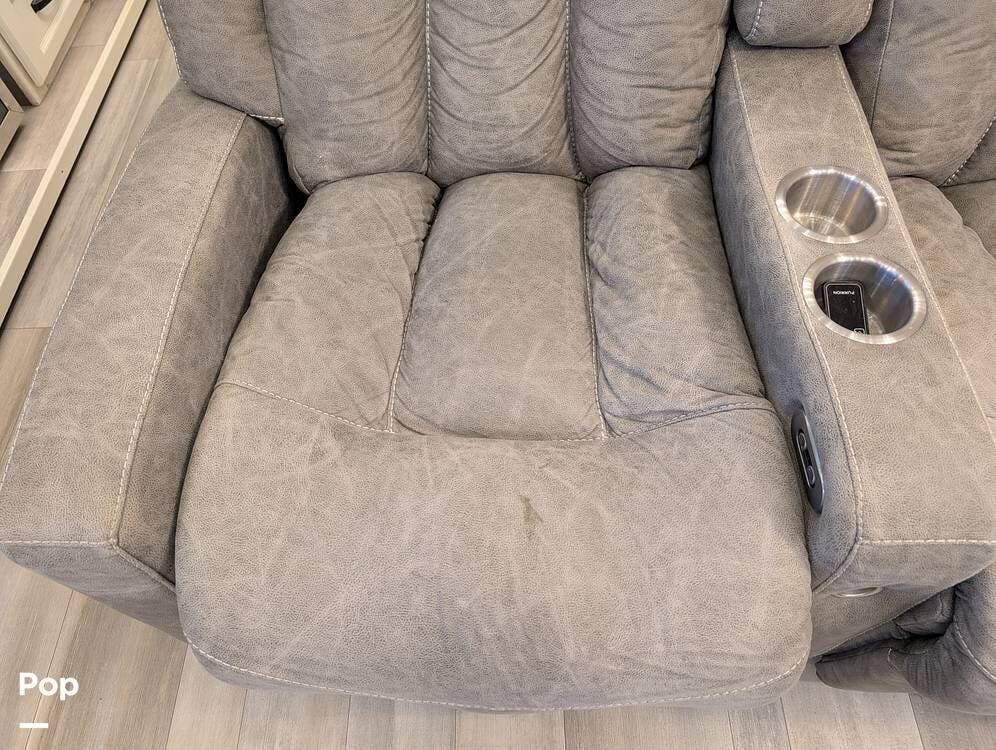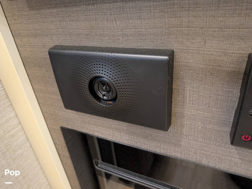 The mid living area is warm and inviting, centered around a fireplace with a large 42-inch TV and integrated sound system. Seating includes a plush power-reclining loveseat, a sleeper sofa for guests, and a freestanding dinette, creating a comfortable space for relaxing or entertaining. Conveniently located in the center of the coach is a dedicated half bath for guests, offering privacy and ease of use without entering the master suite. An exterior entertainment center further enhances the living experience, featuring an outdoor TV, stereo, and speakers--perfect for enjoying evenings outside.