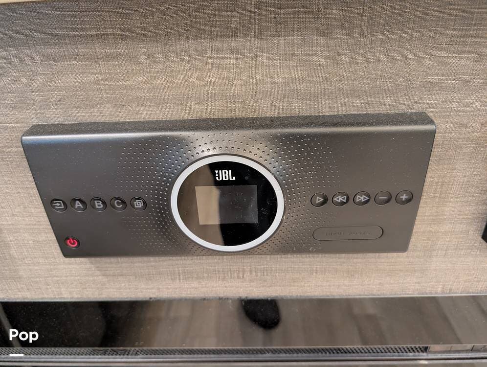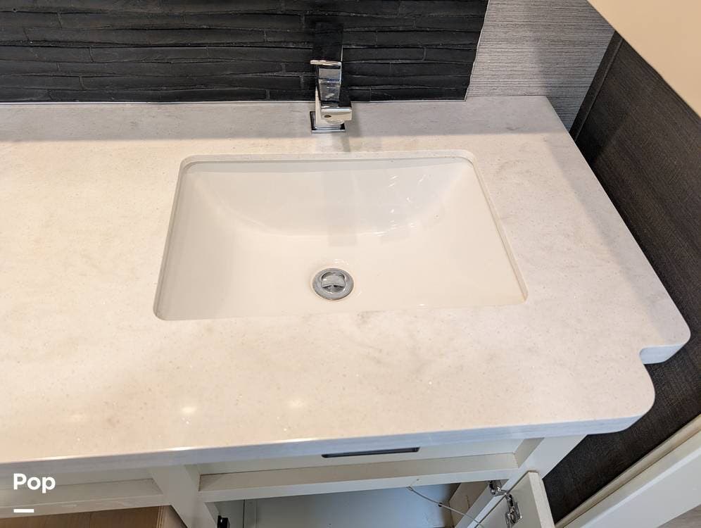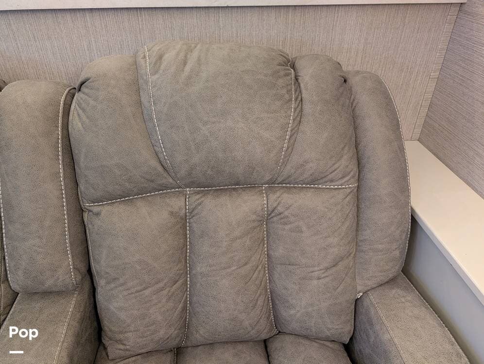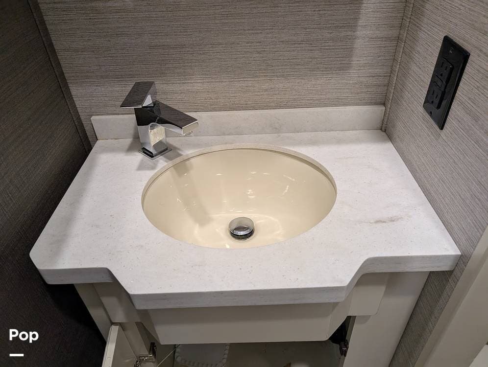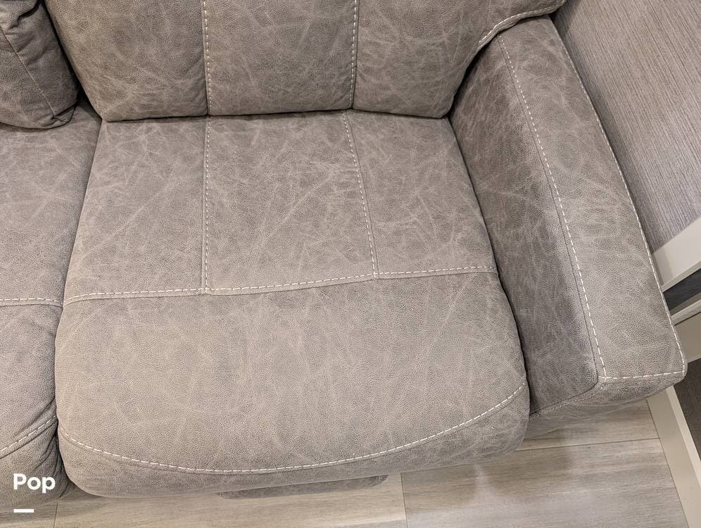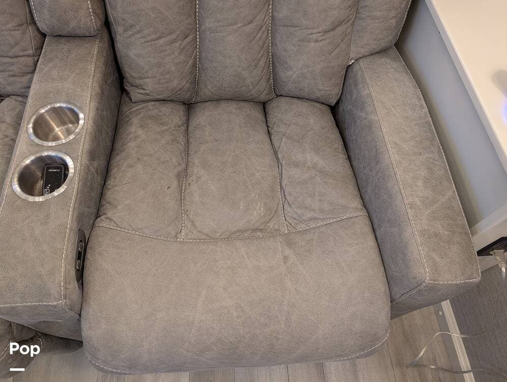 The mid living area is warm and inviting, centered around a fireplace with a large 42-inch TV and integrated sound system. Seating includes a plush power-reclining loveseat, a sleeper sofa for guests, and a freestanding dinette, creating a comfortable space for relaxing or entertaining. Conveniently located in the center of the coach is a dedicated half bath for guests, offering privacy and ease of use without entering the master suite. An exterior entertainment center further enhances the living experience, featuring an outdoor TV, stereo, and speakers--perfect for enjoying evenings outside.