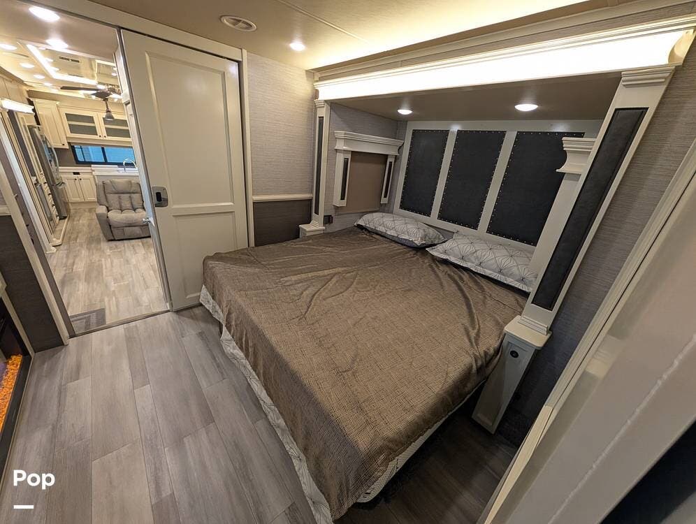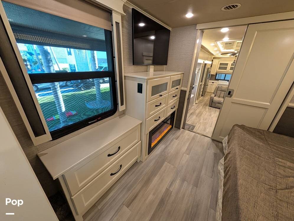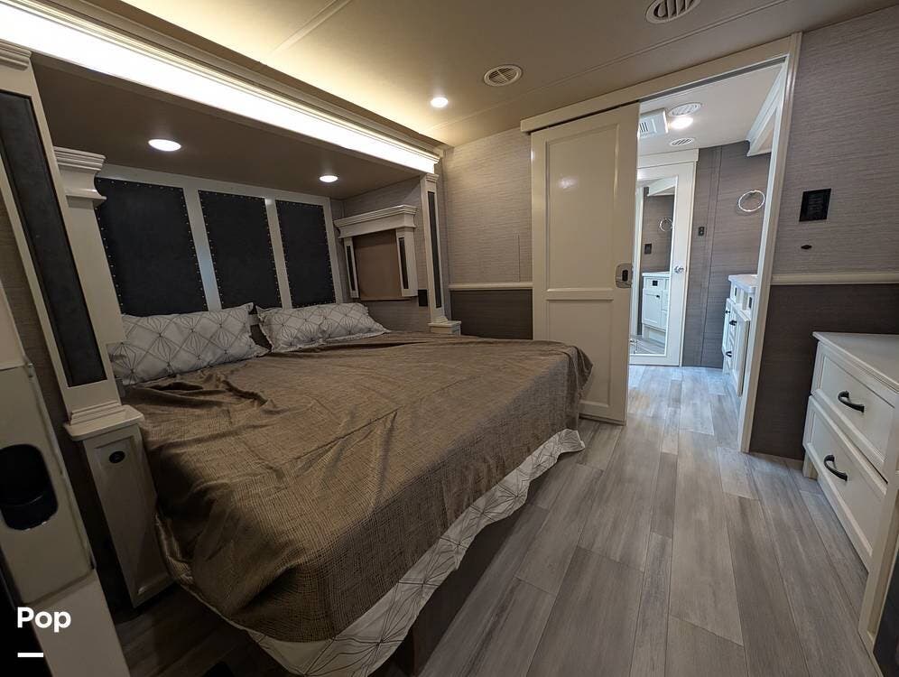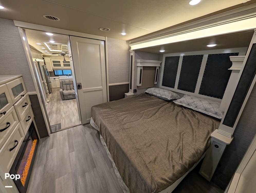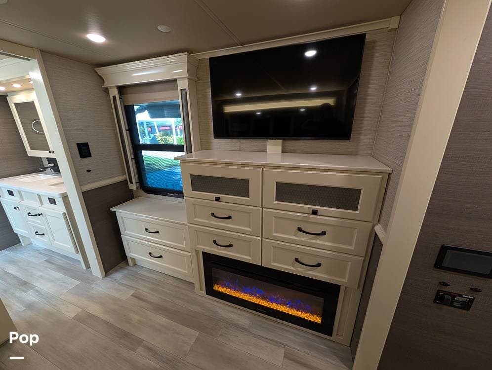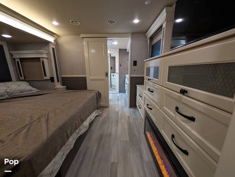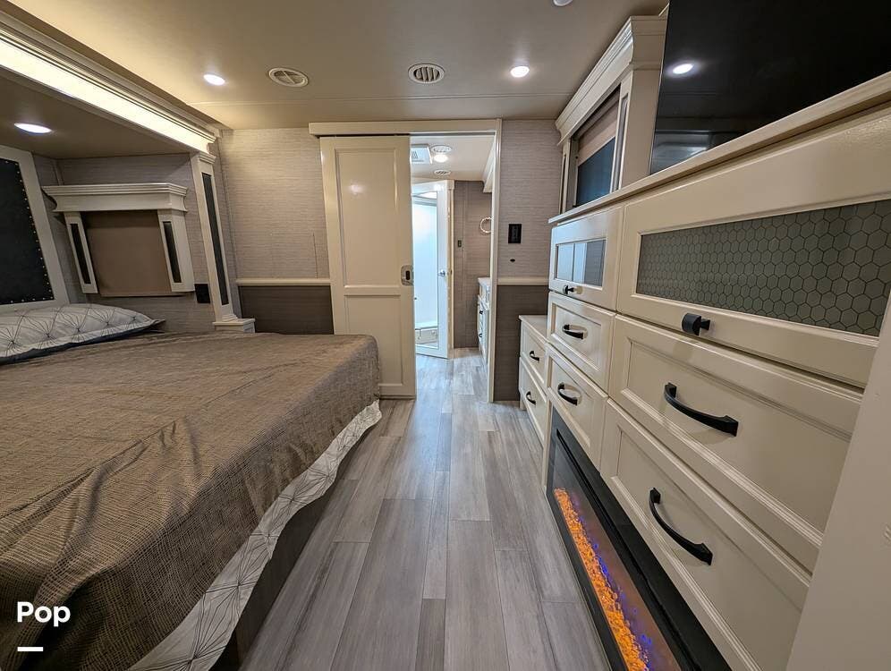 Up front, the master suite serves as a private retreat with a king bed, fireplace, and TV in the bedroom, along with generous wardrobe and dresser storage. The attached master bathroom is spa-like and luxurious, featuring dual sinks, a large walk-in shower with a fold-down seat, and upscale finishes throughout. A spacious walk-in closet with washer and dryer prep completes the suite, making this coach exceptionally well suited for full-time use.