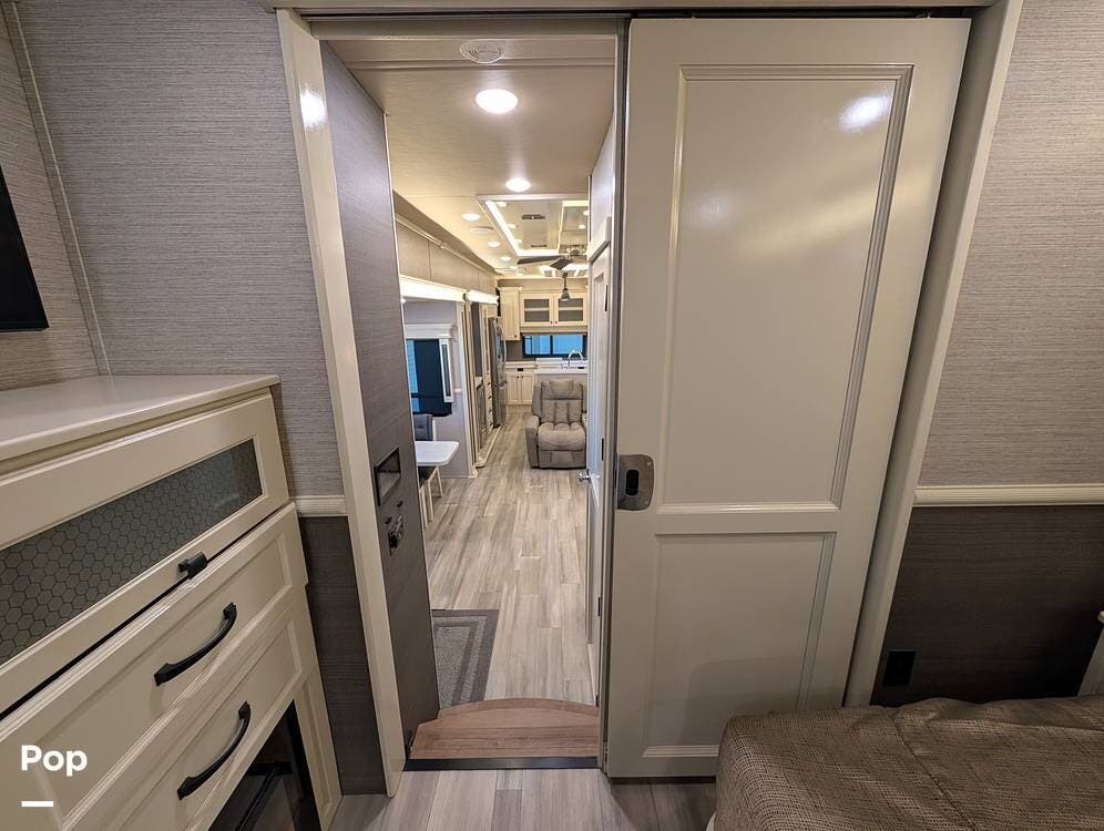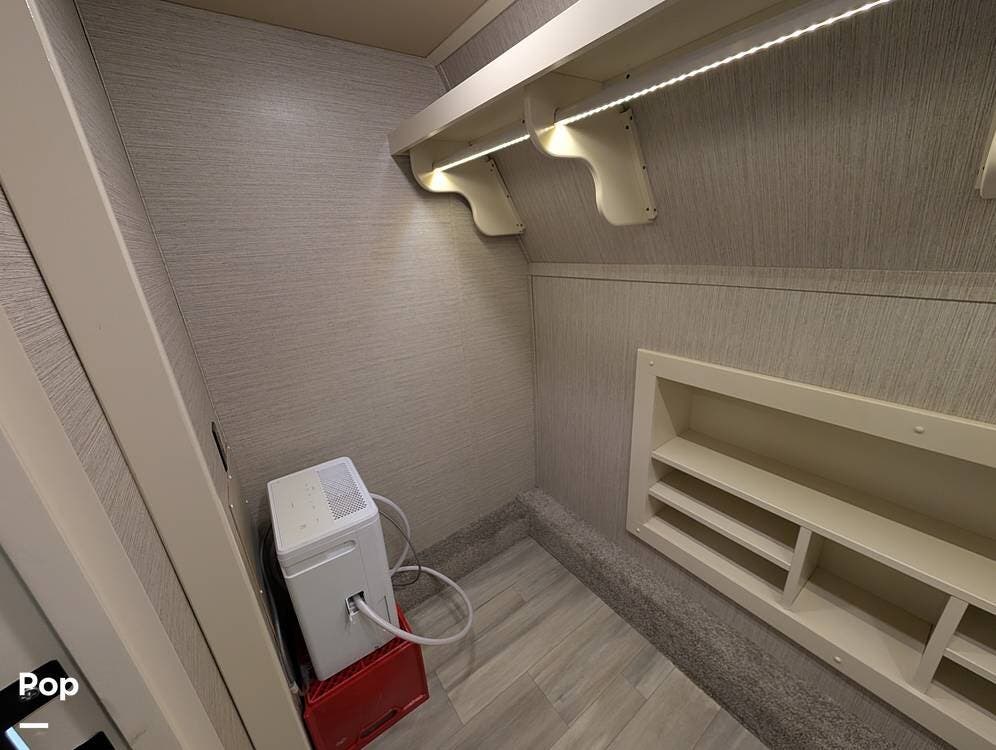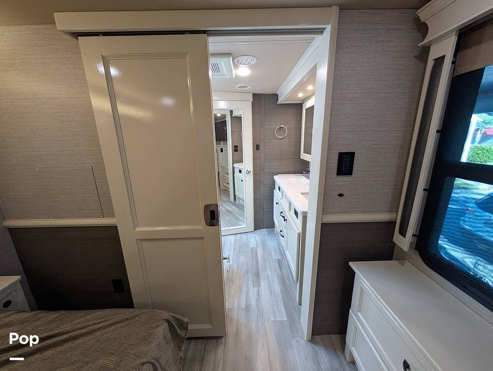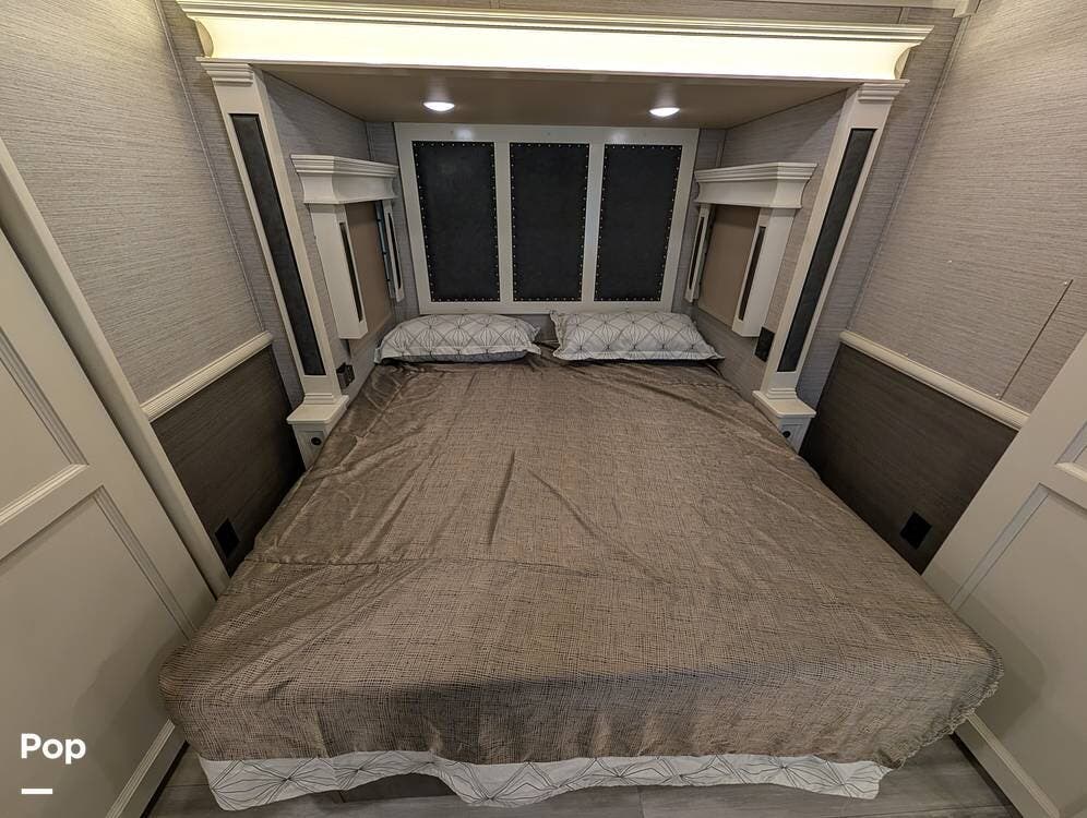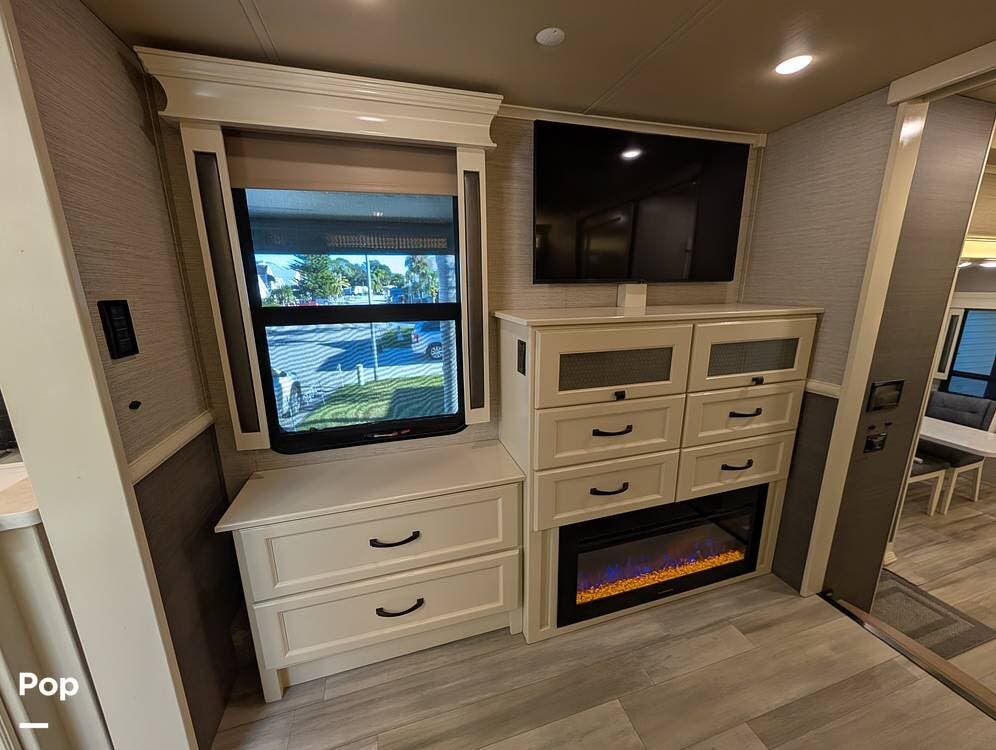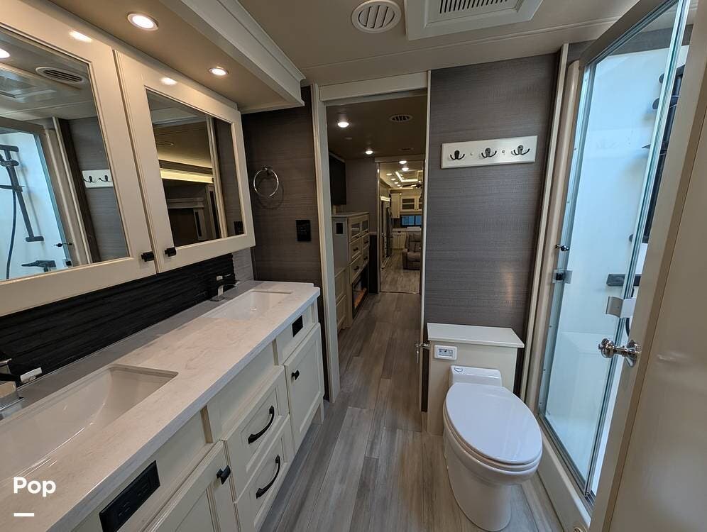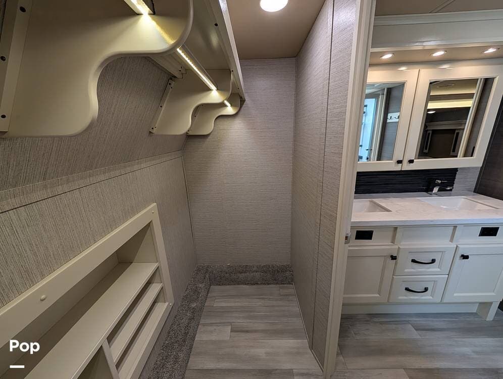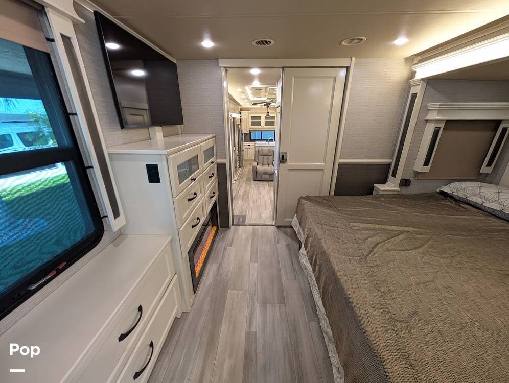 Up front, the master suite serves as a private retreat with a king bed, fireplace, and TV in the bedroom, along with generous wardrobe and dresser storage. The attached master bathroom is spa-like and luxurious, featuring dual sinks, a large walk-in shower with a fold-down seat, and upscale finishes throughout. A spacious walk-in closet with washer and dryer prep completes the suite, making this coach exceptionally well suited for full-time use.