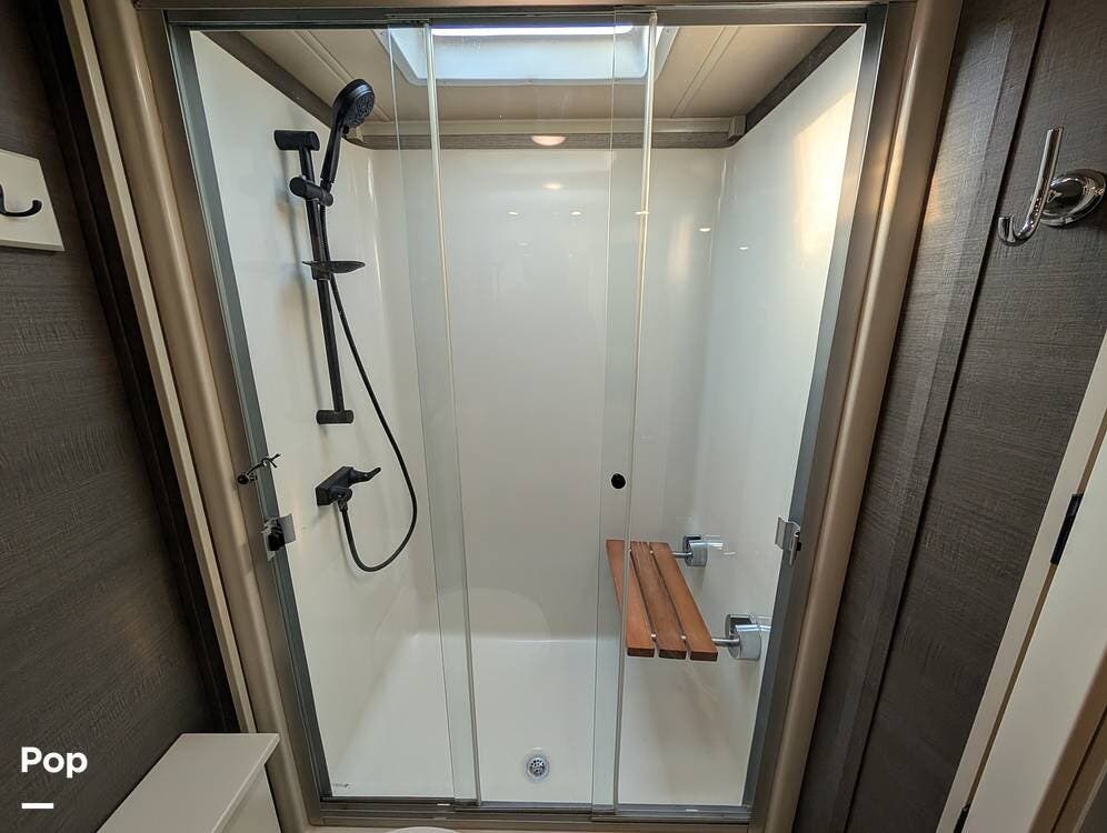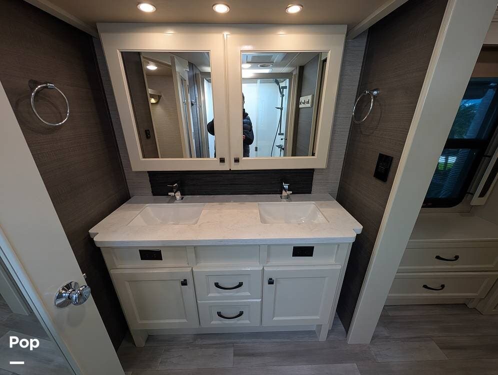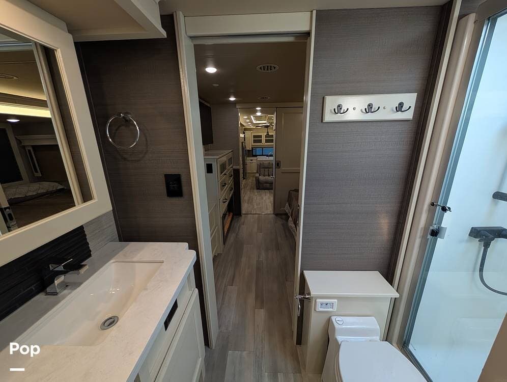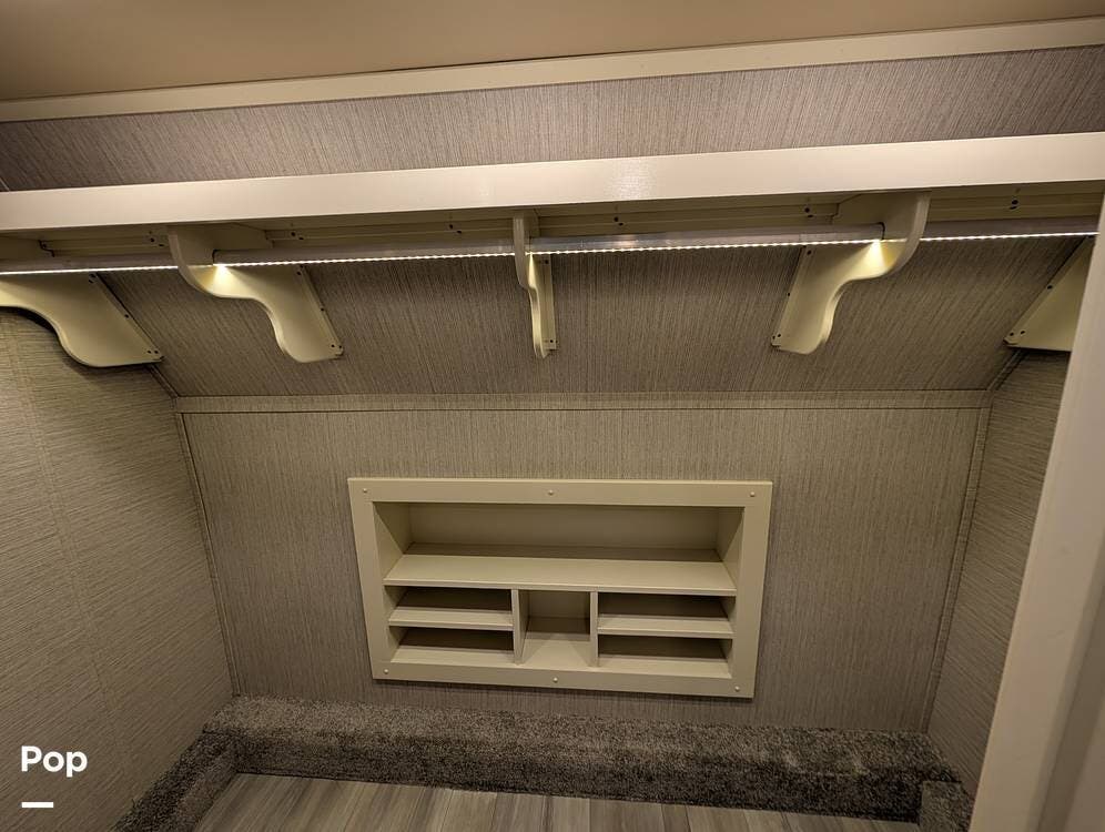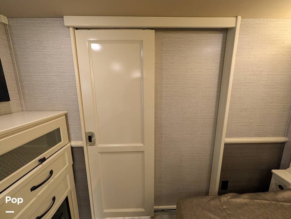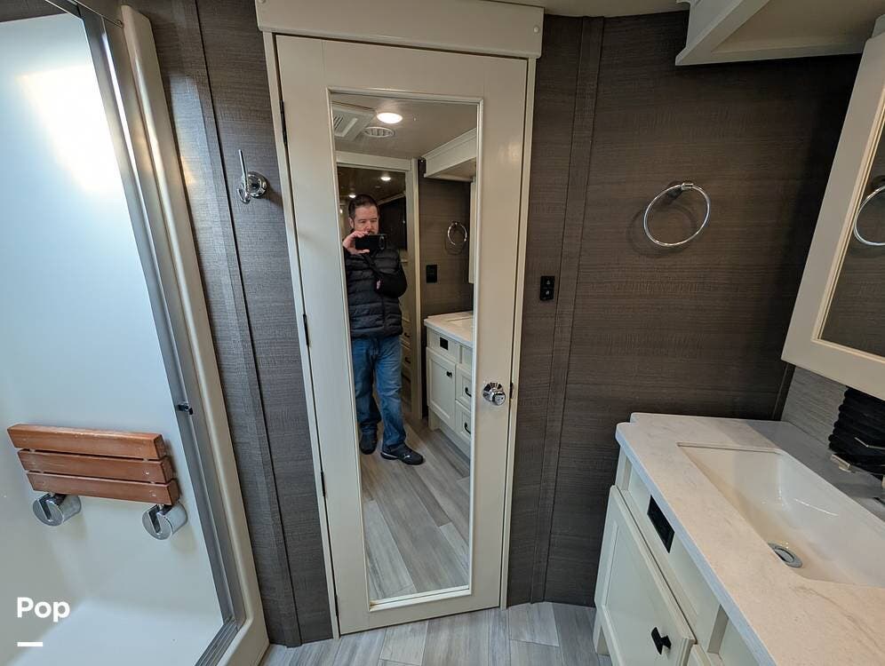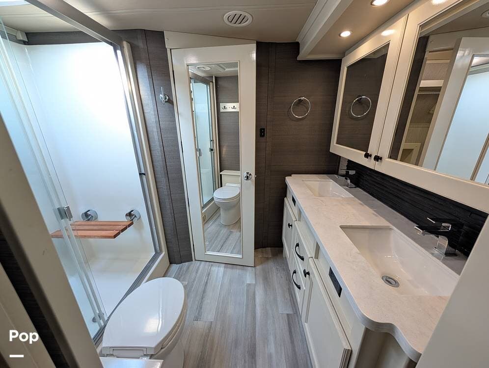 Up front, the master suite serves as a private retreat with a king bed, fireplace, and TV in the bedroom, along with generous wardrobe and dresser storage. The attached master bathroom is spa-like and luxurious, featuring dual sinks, a large walk-in shower with a fold-down seat, and upscale finishes throughout. A spacious walk-in closet with washer and dryer prep completes the suite, making this coach exceptionally well suited for full-time use.