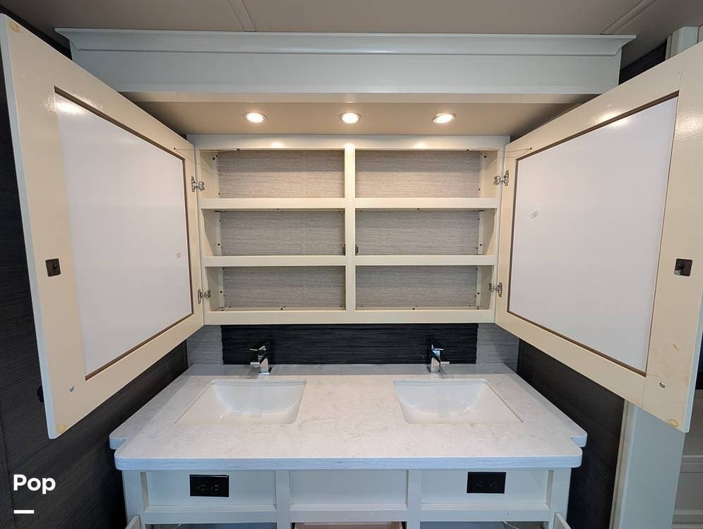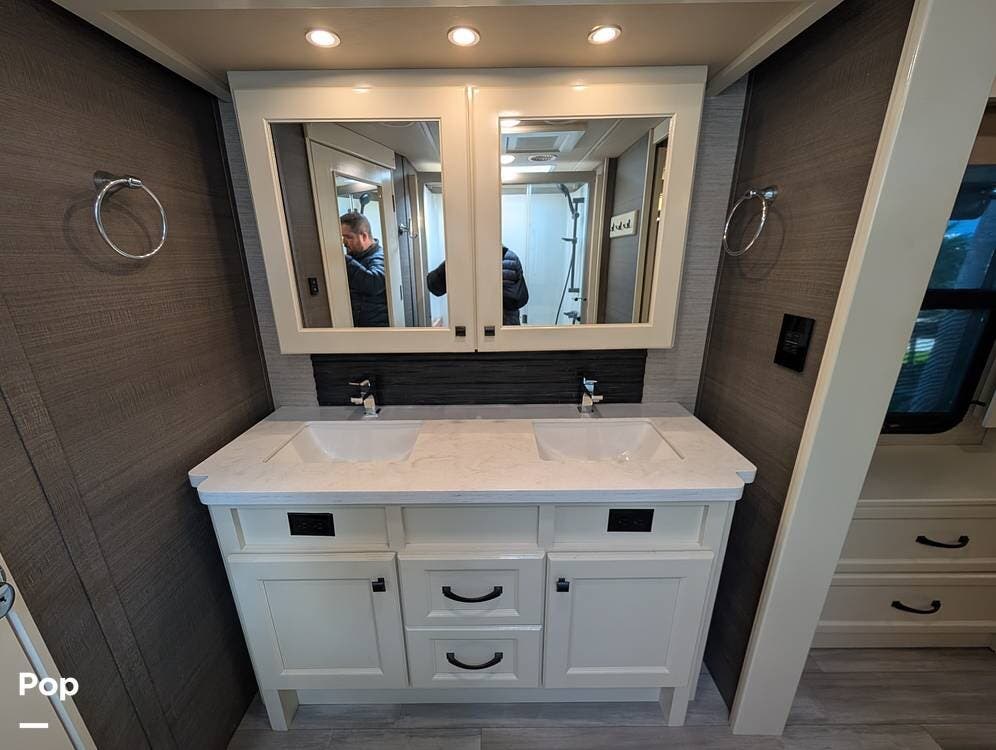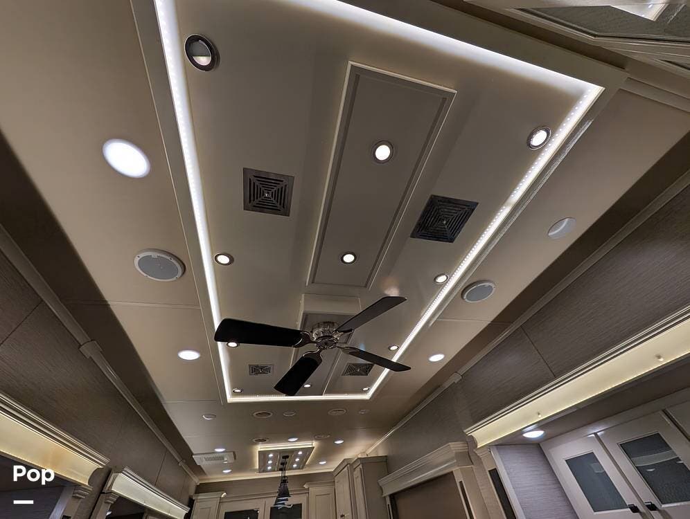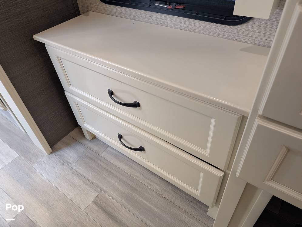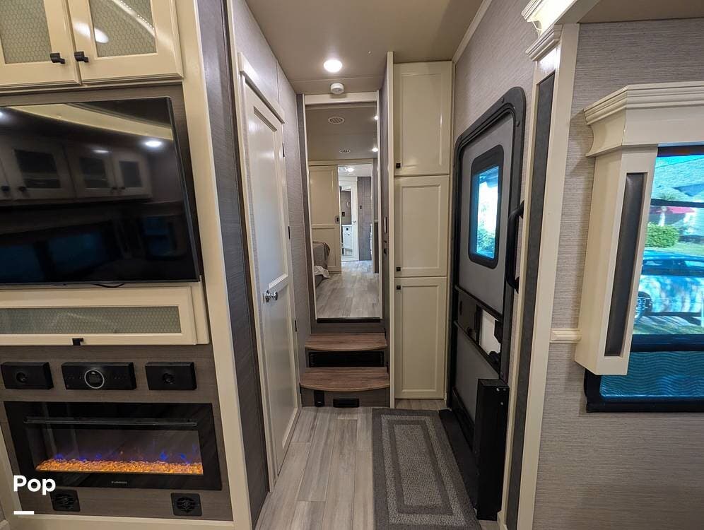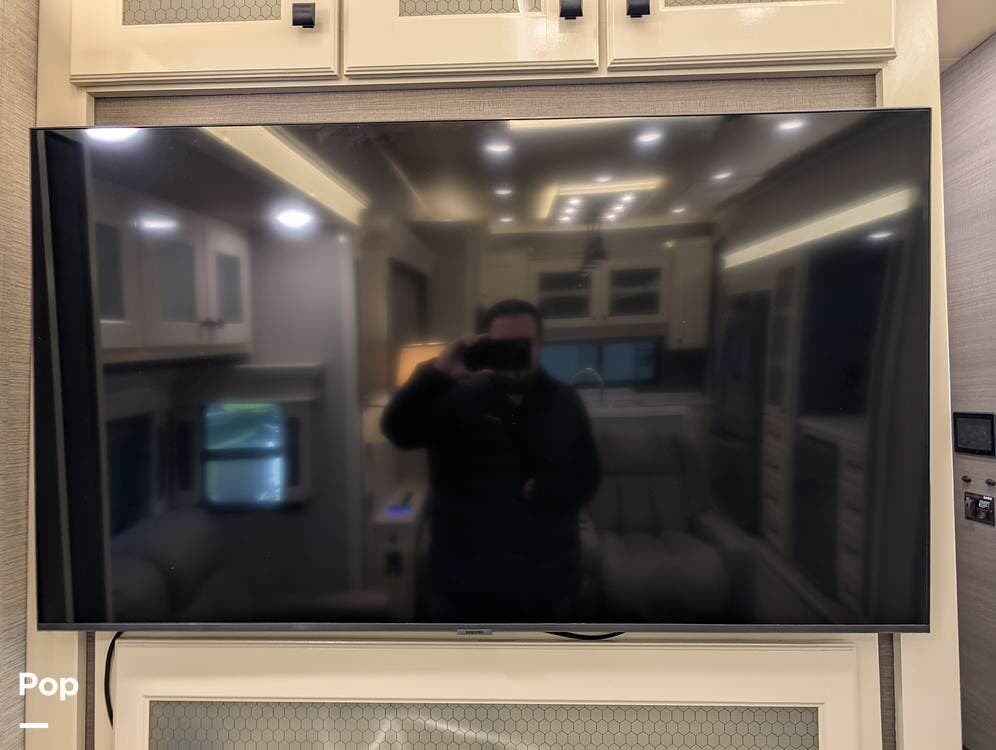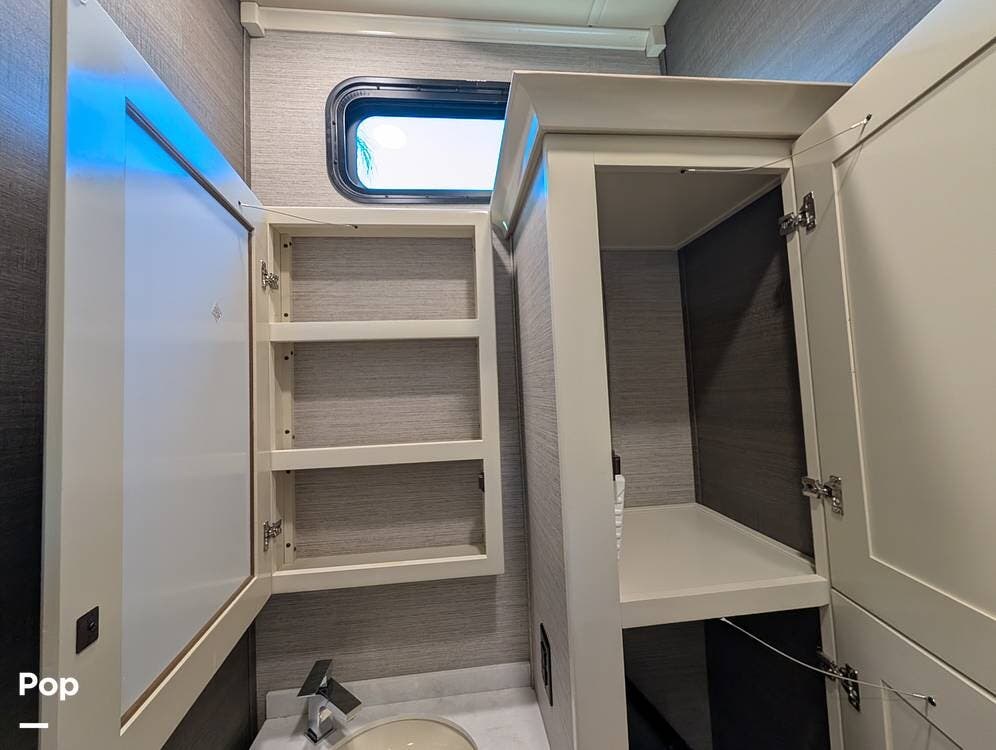 Up front, the master suite serves as a private retreat with a king bed, fireplace, and TV in the bedroom, along with generous wardrobe and dresser storage. The attached master bathroom is spa-like and luxurious, featuring dual sinks, a large walk-in shower with a fold-down seat, and upscale finishes throughout. A spacious walk-in closet with washer and dryer prep completes the suite, making this coach exceptionally well suited for full-time use.