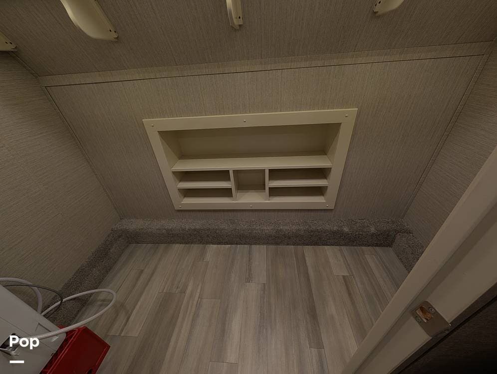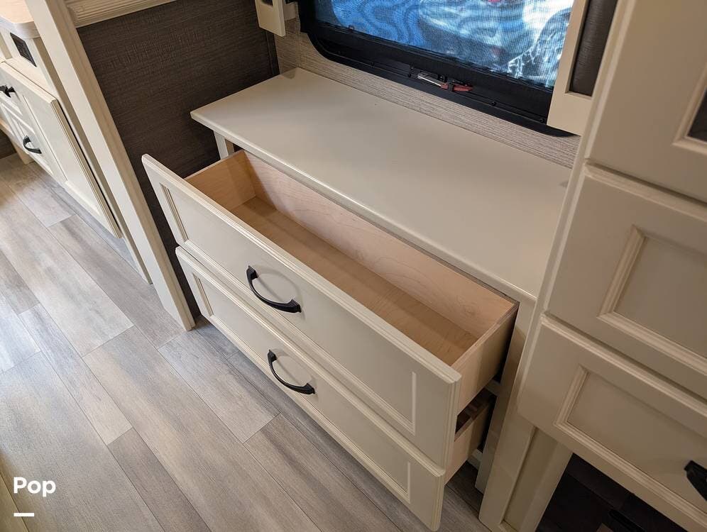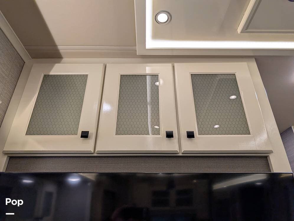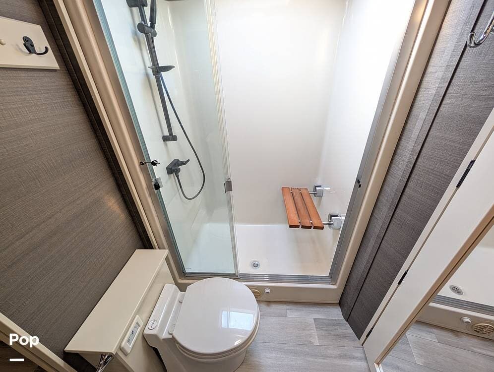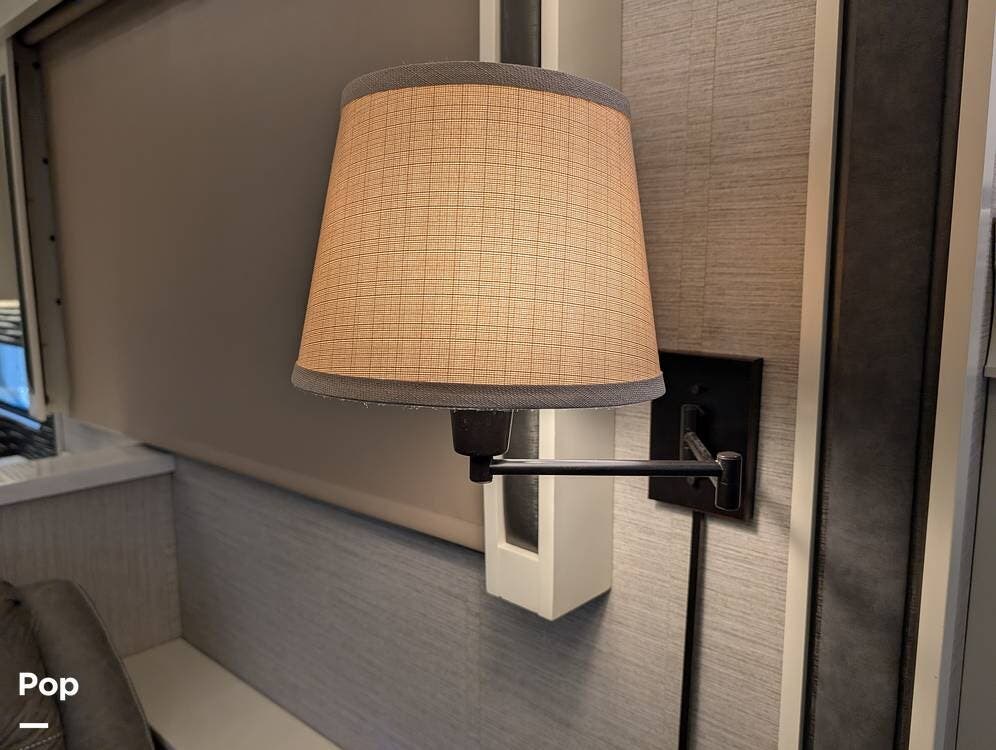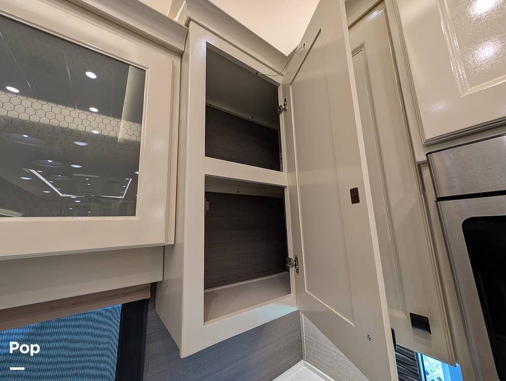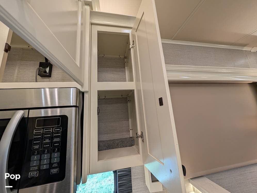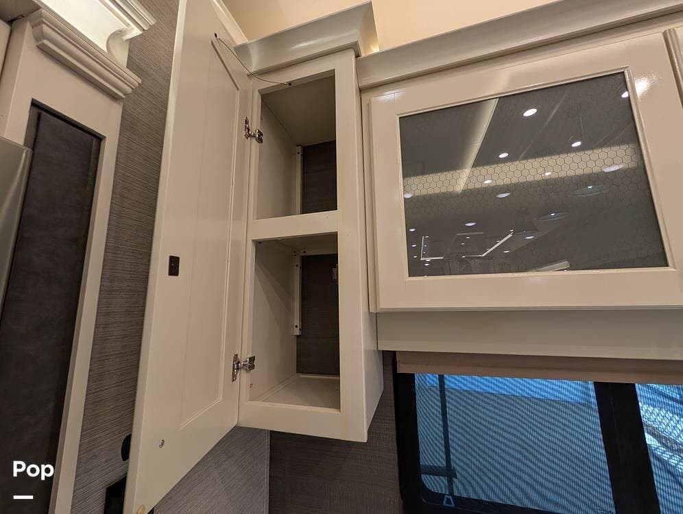 Up front, the master suite serves as a private retreat with a king bed, fireplace, and TV in the bedroom, along with generous wardrobe and dresser storage. The attached master bathroom is spa-like and luxurious, featuring dual sinks, a large walk-in shower with a fold-down seat, and upscale finishes throughout. A spacious walk-in closet with washer and dryer prep completes the suite, making this coach exceptionally well suited for full-time use.