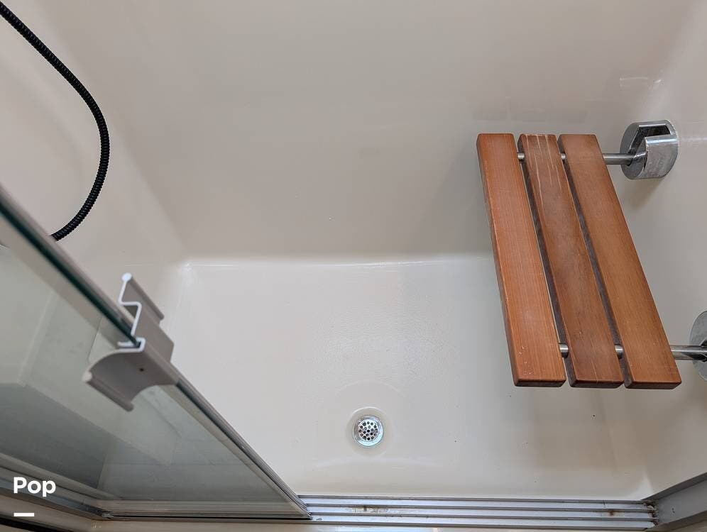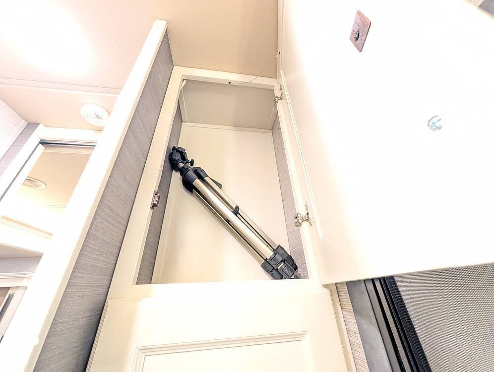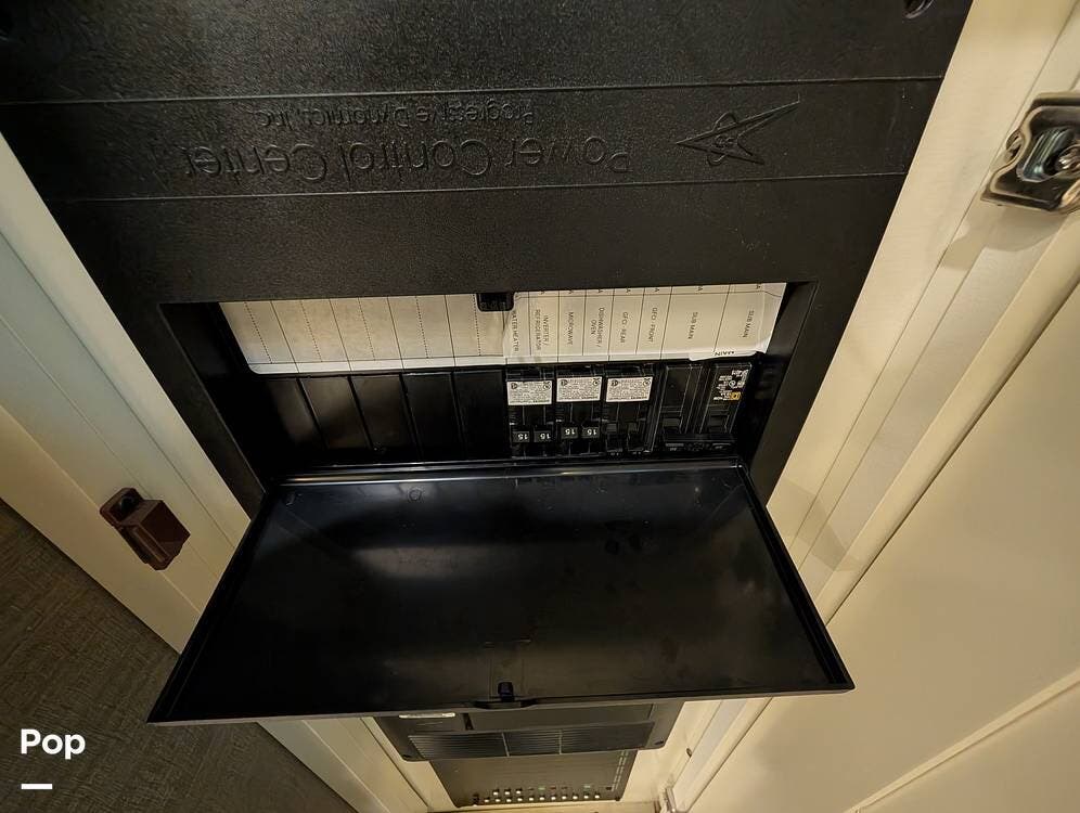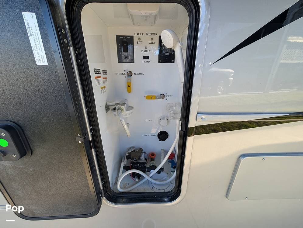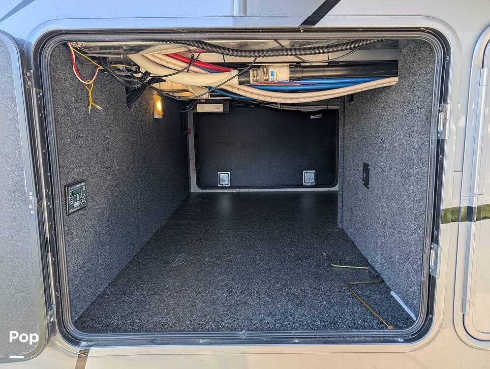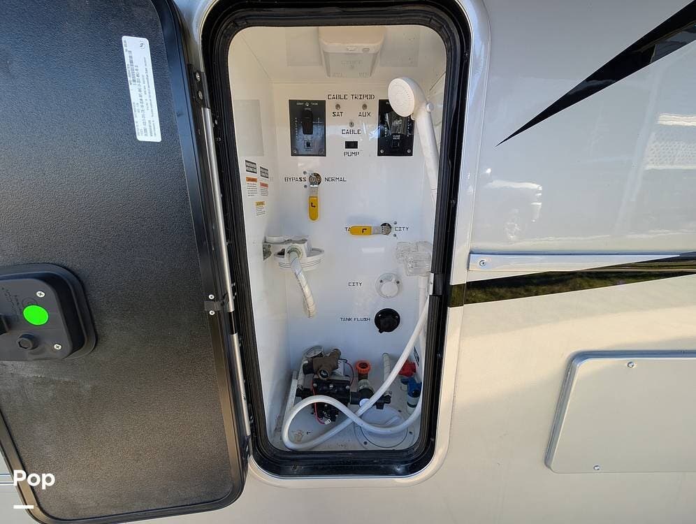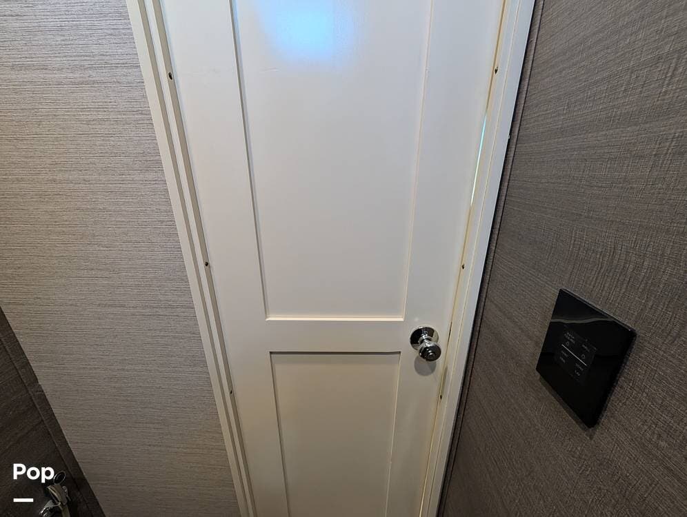 Up front, the master suite serves as a private retreat with a king bed, fireplace, and TV in the bedroom, along with generous wardrobe and dresser storage. The attached master bathroom is spa-like and luxurious, featuring dual sinks, a large walk-in shower with a fold-down seat, and upscale finishes throughout. A spacious walk-in closet with washer and dryer prep completes the suite, making this coach exceptionally well suited for full-time use.