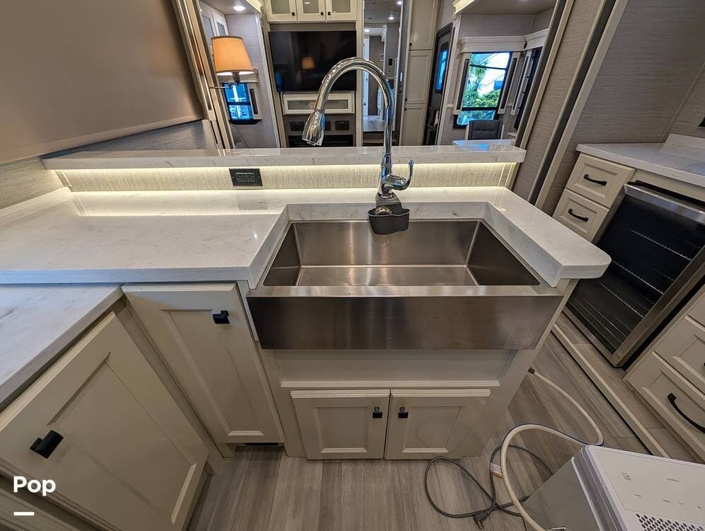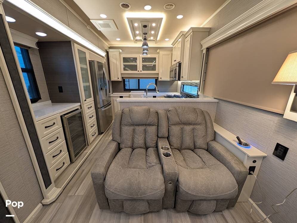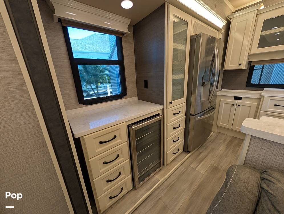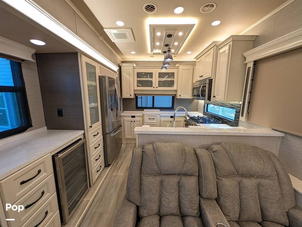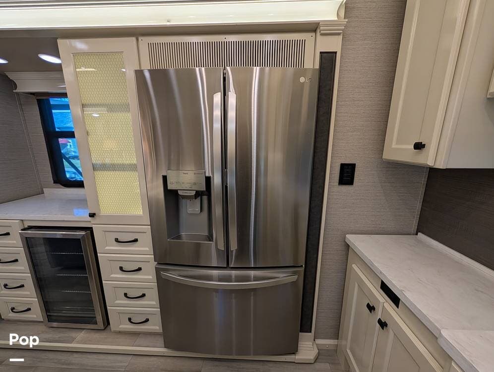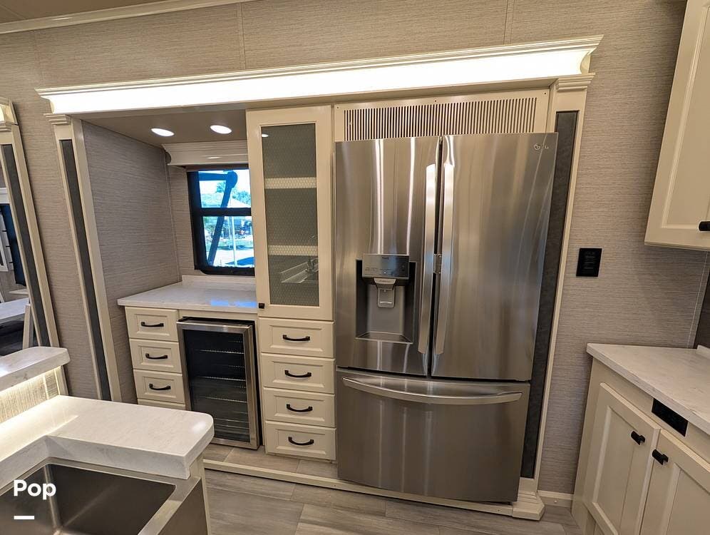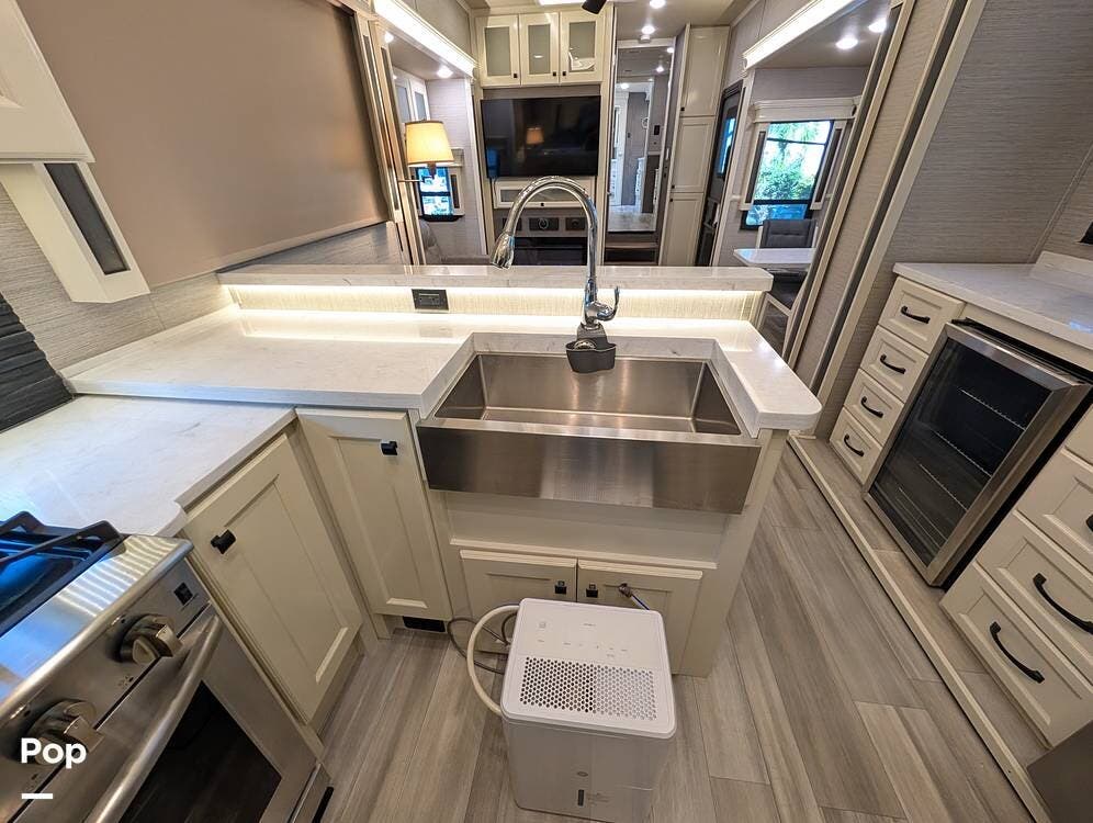 The floorplan is both functional and elegant, featuring a rear residential kitchen, mid living room, and front master suite/master bath, offering excellent separation of space for full-time living or extended travel. The rear kitchen is exceptionally well appointed with a large stainless steel sink, solid-surface countertops, a full-size residential oven and range, French-door refrigerator, built-in wine cooler, and extensive cabinetry and pantry storage that rivals a high-end home.