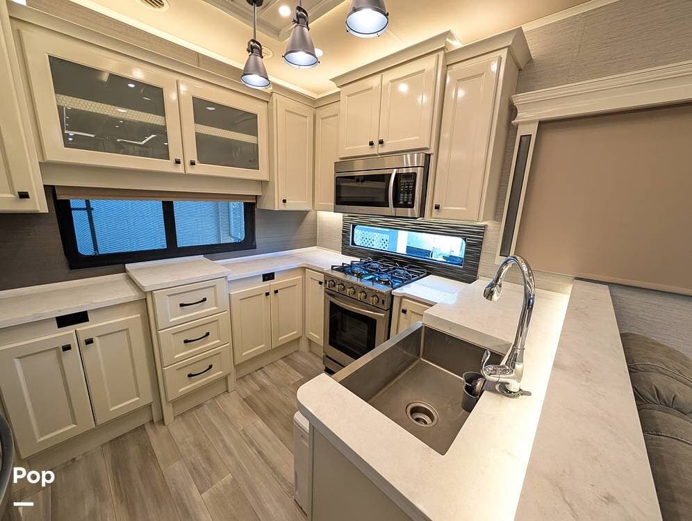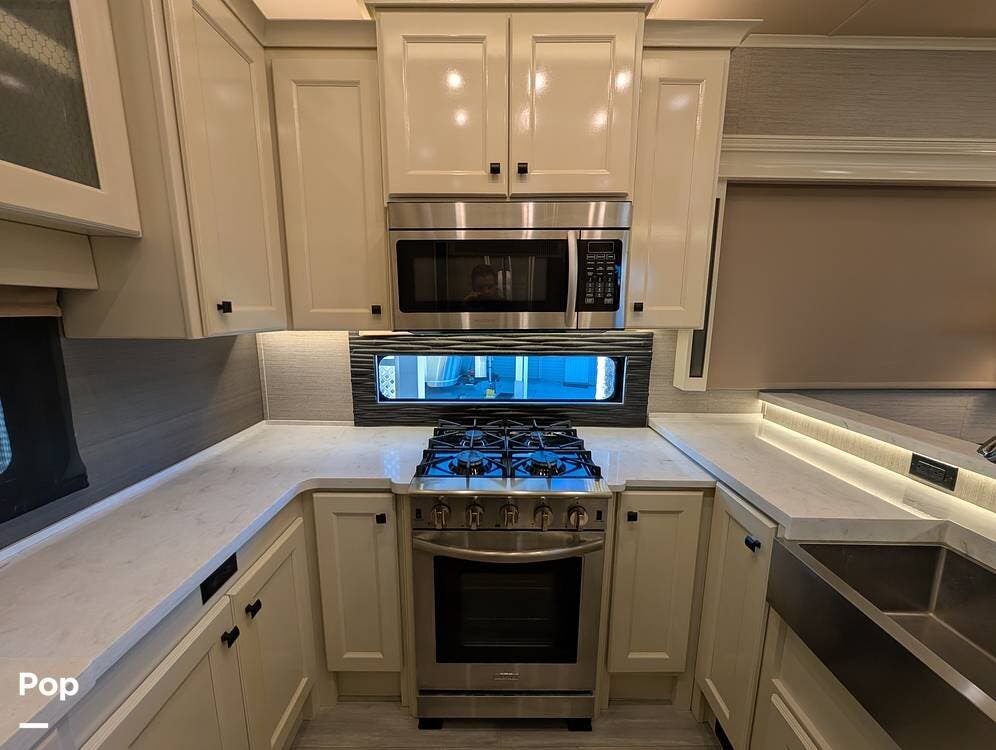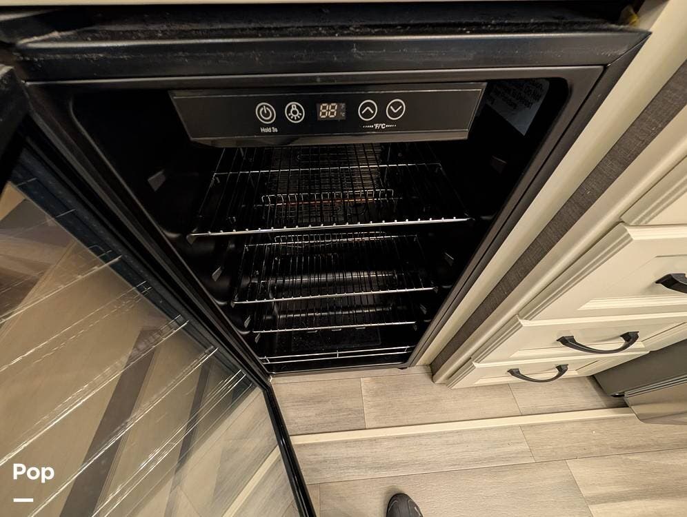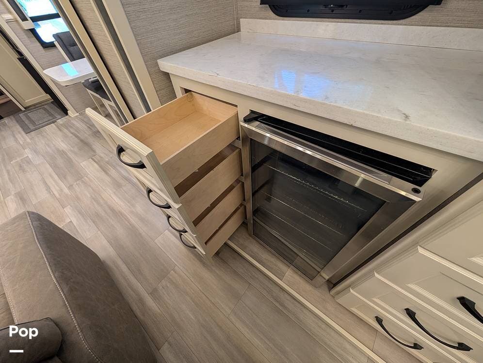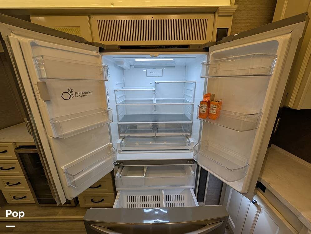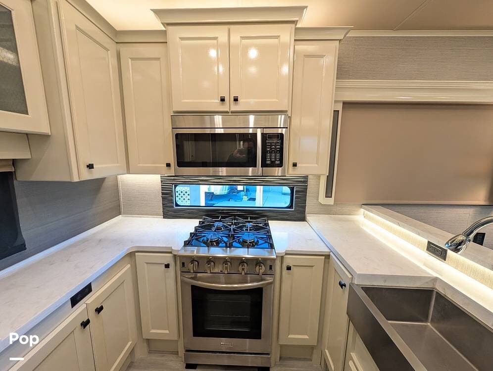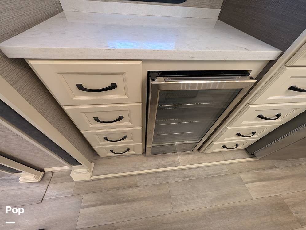 The floorplan is both functional and elegant, featuring a rear residential kitchen, mid living room, and front master suite/master bath, offering excellent separation of space for full-time living or extended travel. The rear kitchen is exceptionally well appointed with a large stainless steel sink, solid-surface countertops, a full-size residential oven and range, French-door refrigerator, built-in wine cooler, and extensive cabinetry and pantry storage that rivals a high-end home.