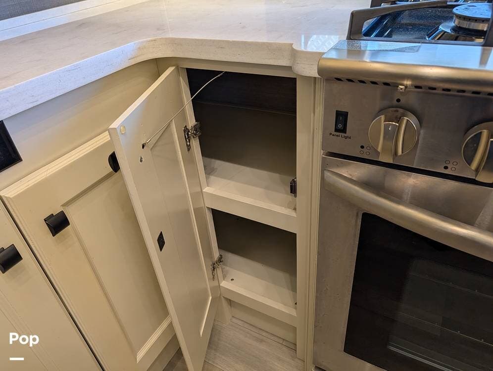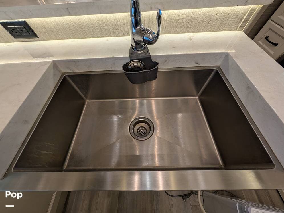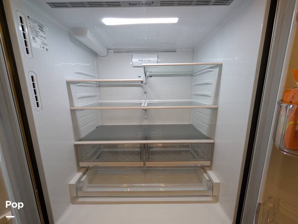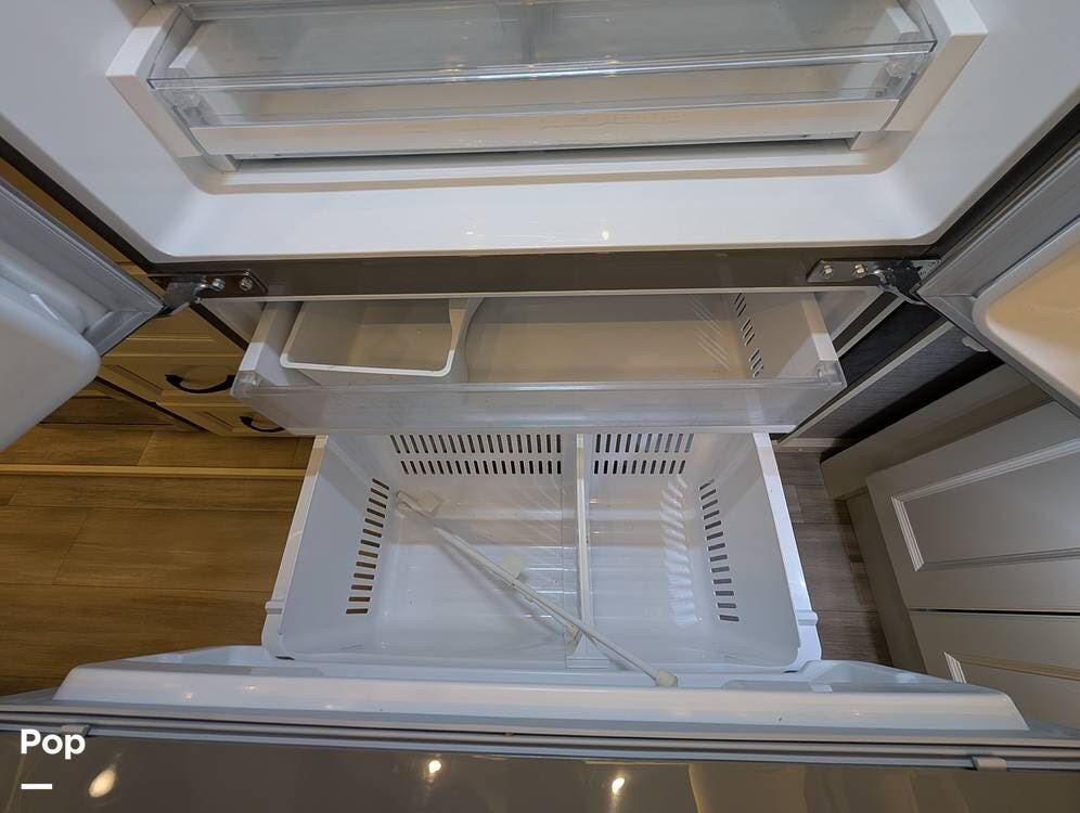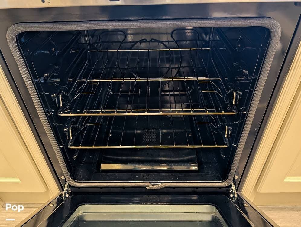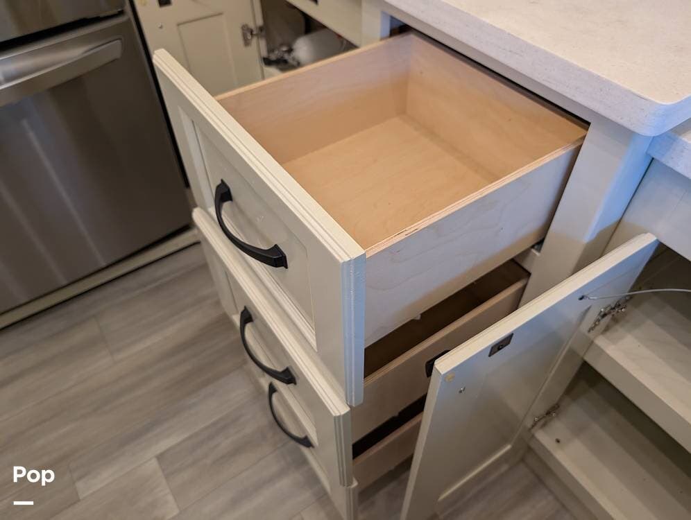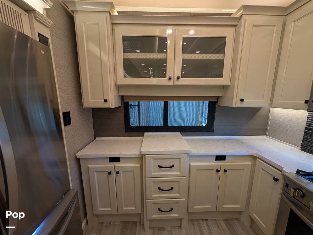The floorplan is both functional and elegant, featuring a rear residential kitchen, mid living room, and front master suite/master bath, offering excellent separation of space for full-time living or extended travel. The rear kitchen is exceptionally well appointed with a large stainless steel sink, solid-surface countertops, a full-size residential oven and range, French-door refrigerator, built-in wine cooler, and extensive cabinetry and pantry storage that rivals a high-end home.