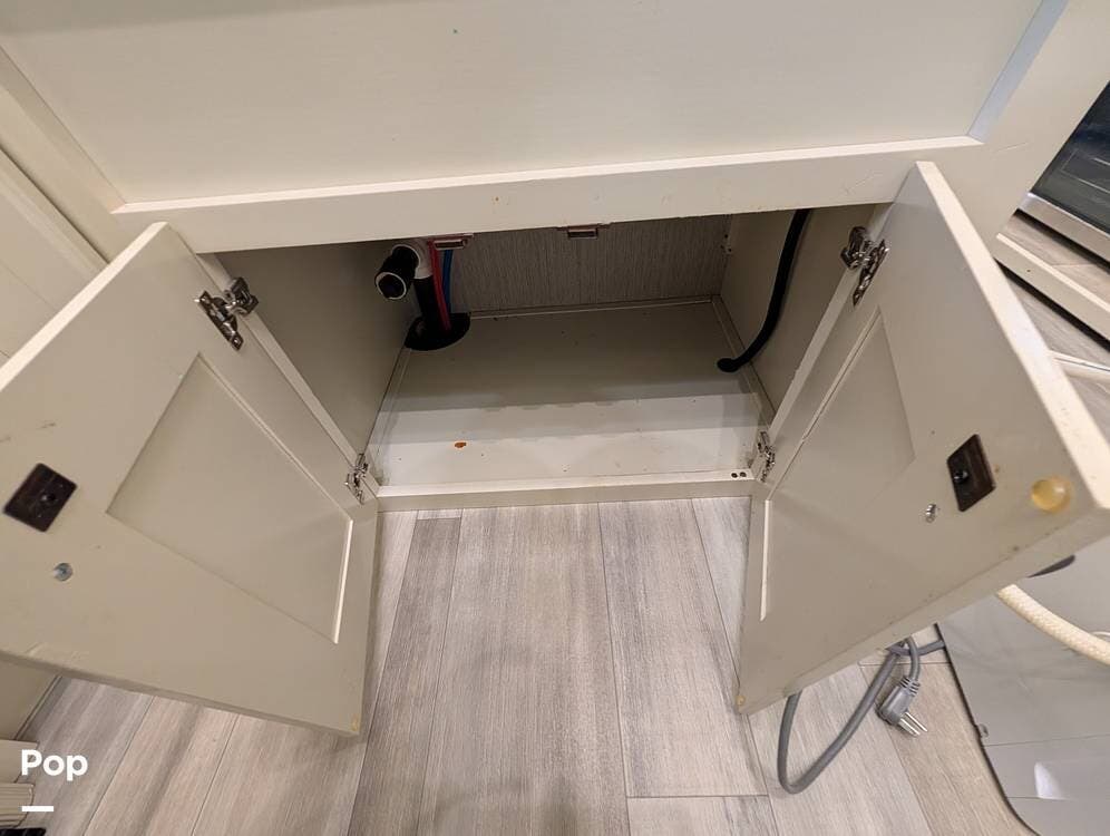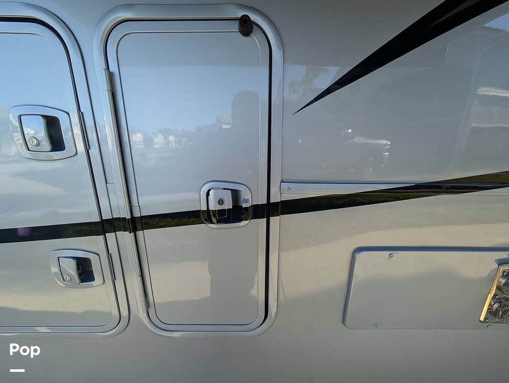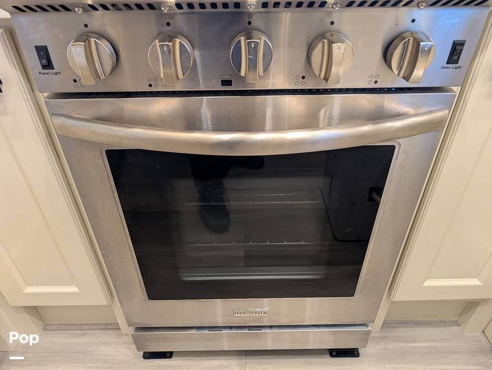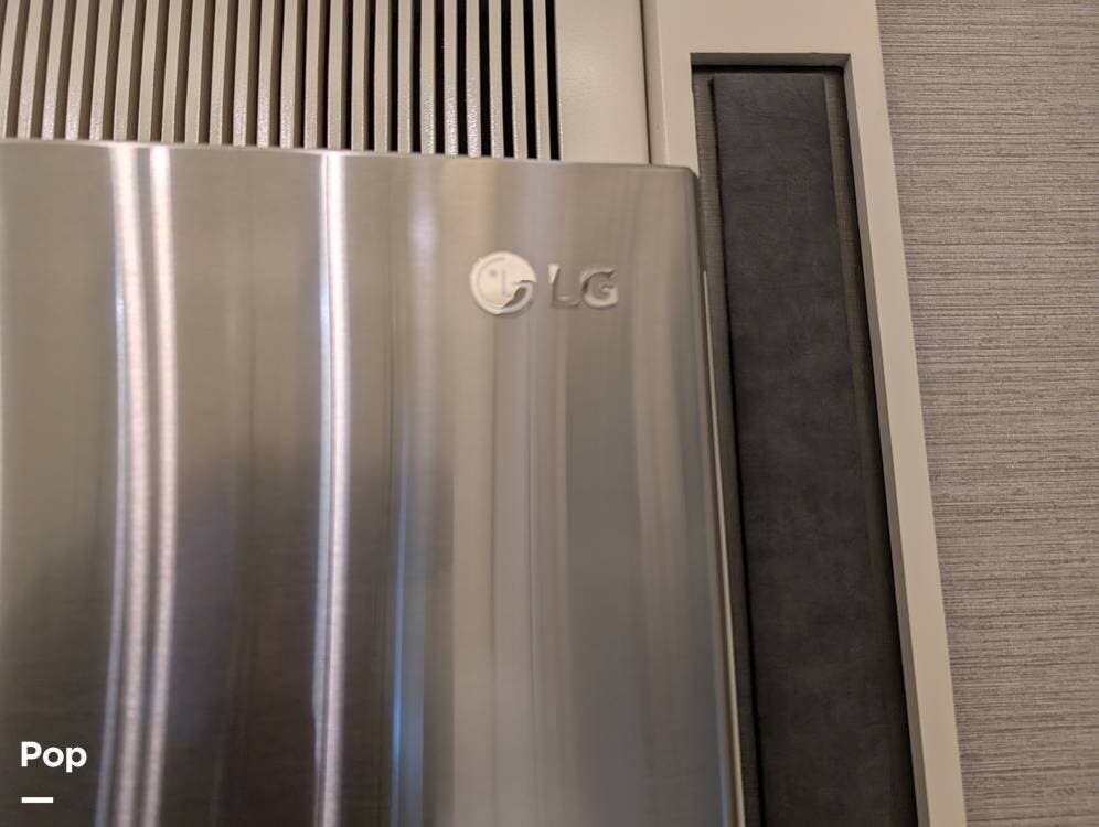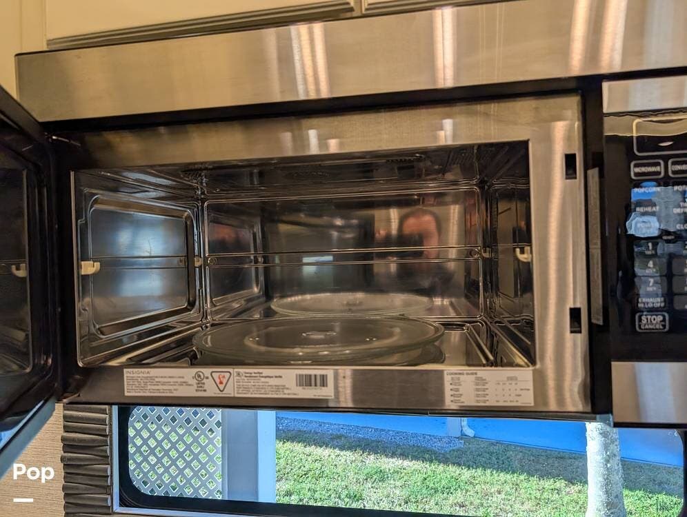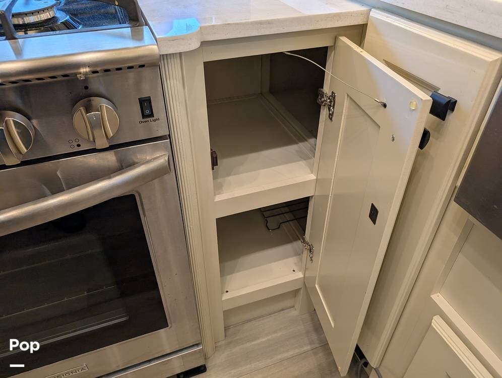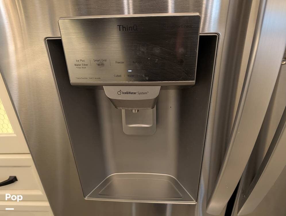 The floorplan is both functional and elegant, featuring a rear residential kitchen, mid living room, and front master suite/master bath, offering excellent separation of space for full-time living or extended travel. The rear kitchen is exceptionally well appointed with a large stainless steel sink, solid-surface countertops, a full-size residential oven and range, French-door refrigerator, built-in wine cooler, and extensive cabinetry and pantry storage that rivals a high-end home.