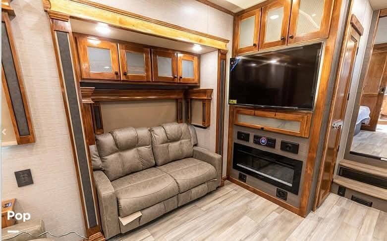 Family members and guests will love the intuitive layout of this 2022 Beacon 41LKB 5th Wheel by Vanleigh RV, which features two fireplaces (LR and BR), W/D prep, theater seating, LED interior lighting with Day/Night blackout blinds, a convertible sleeper sofa, and two flat-panel TV entertainment centers (LR and BR) and a half bath.