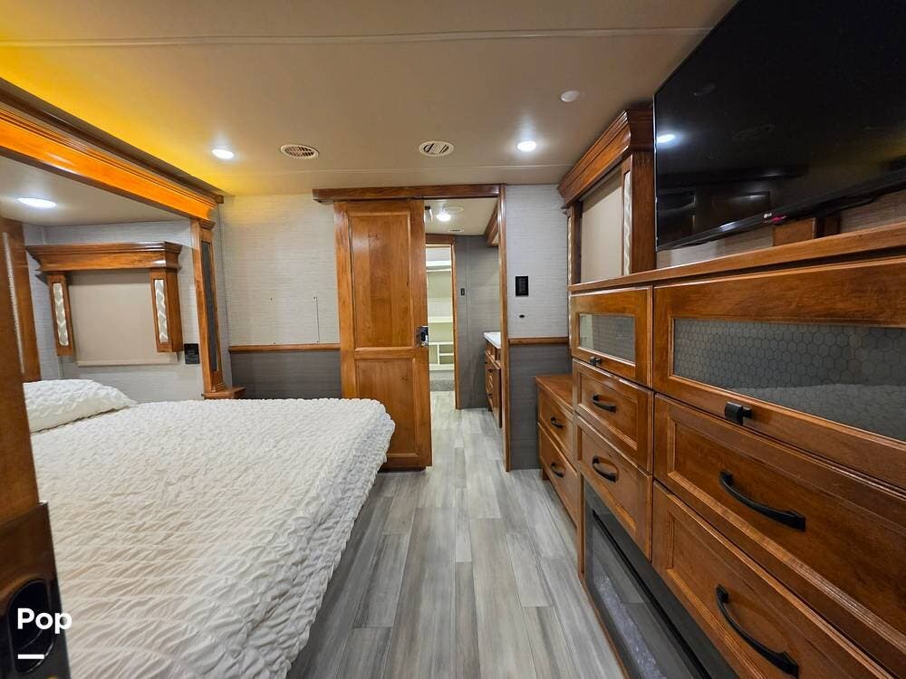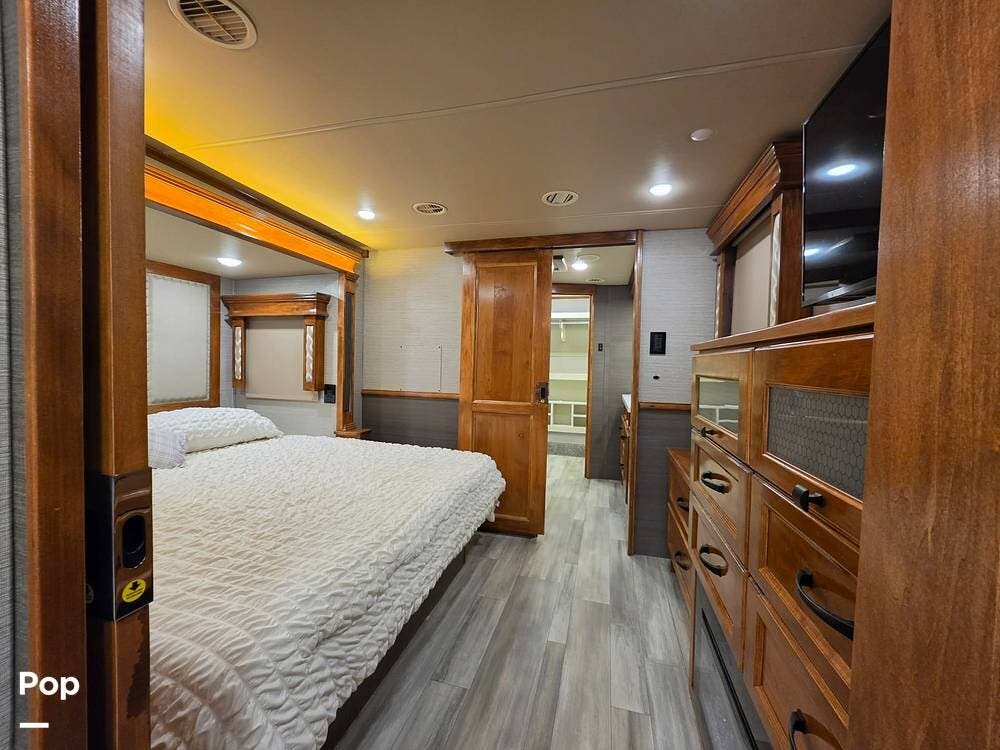 Externally, this RV features four slides with slide toppers, dual power awnings, exterior LED lighting, a roof access ladder, plenty of storage, hydraulic auto-leveling, solar prep, and generator prep.