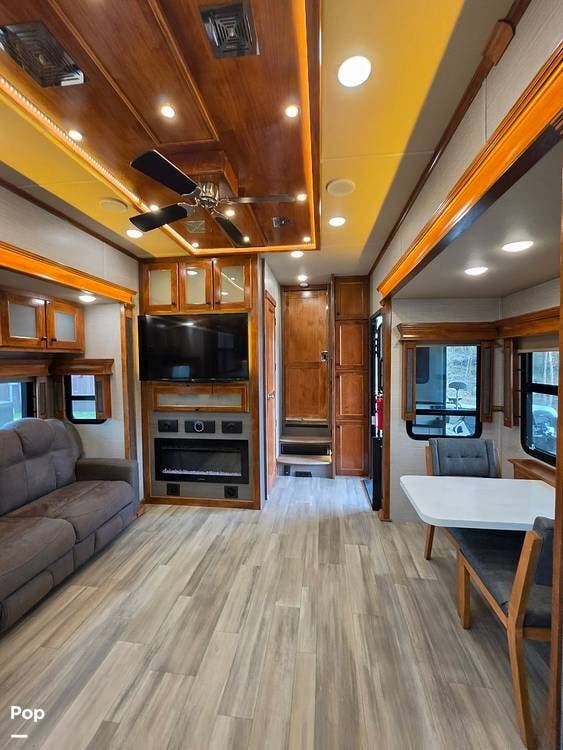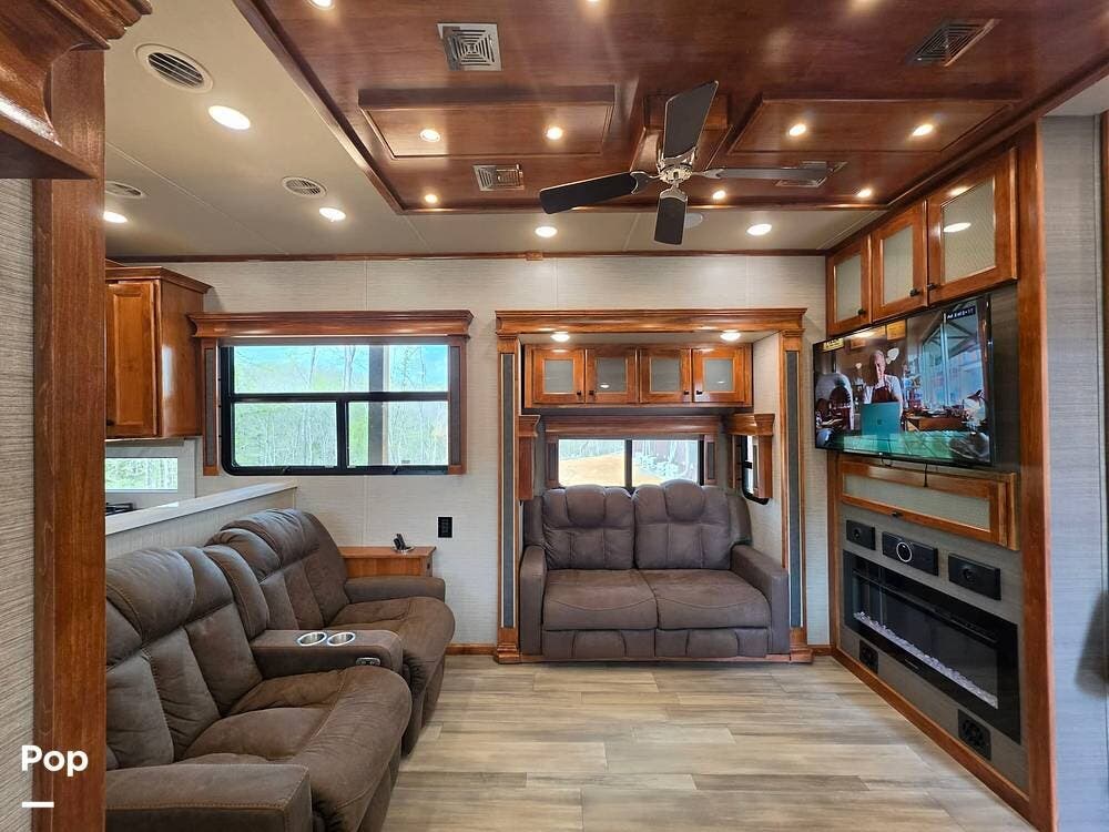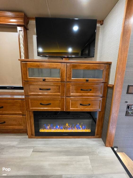 Family members and guests will love the intuitive layout of this 2022 Beacon 41LKB 5th Wheel by Vanleigh RV, which features two fireplaces (LR and BR), a Stackable Washer/Dryer, theater seating, LED interior lighting with Day/Night blackout blinds, a convertible sleeper sofa, and two flat-panel TV entertainment centers (LR and BR) and a half bath.