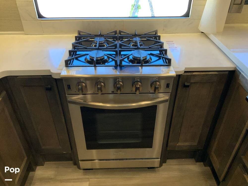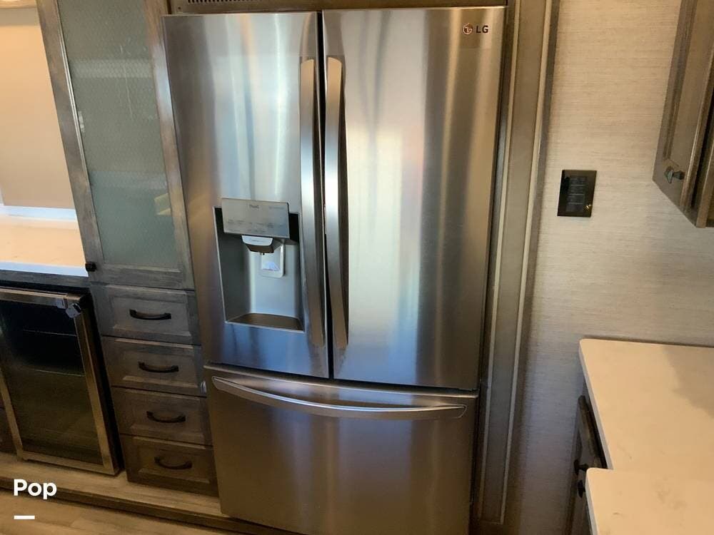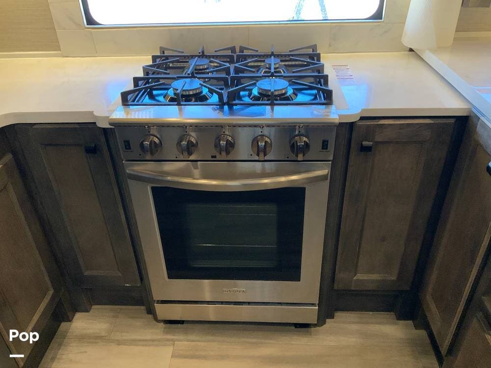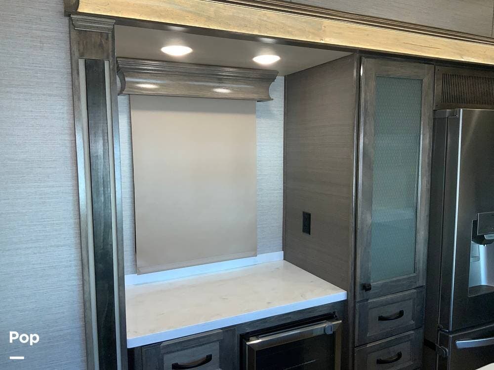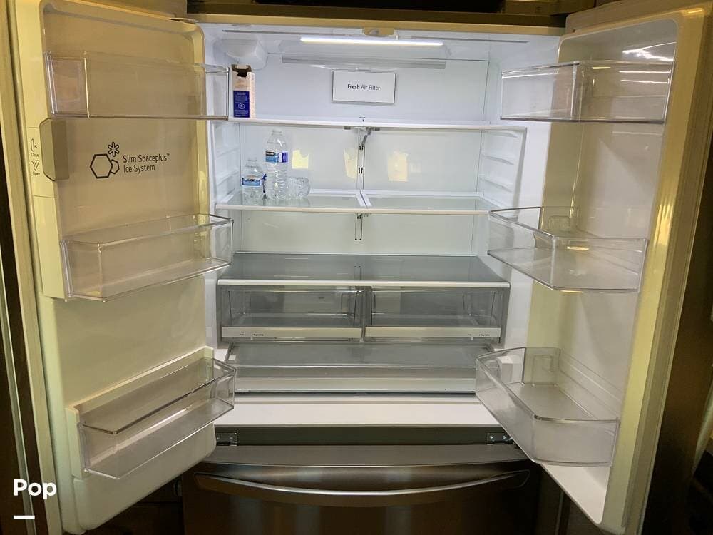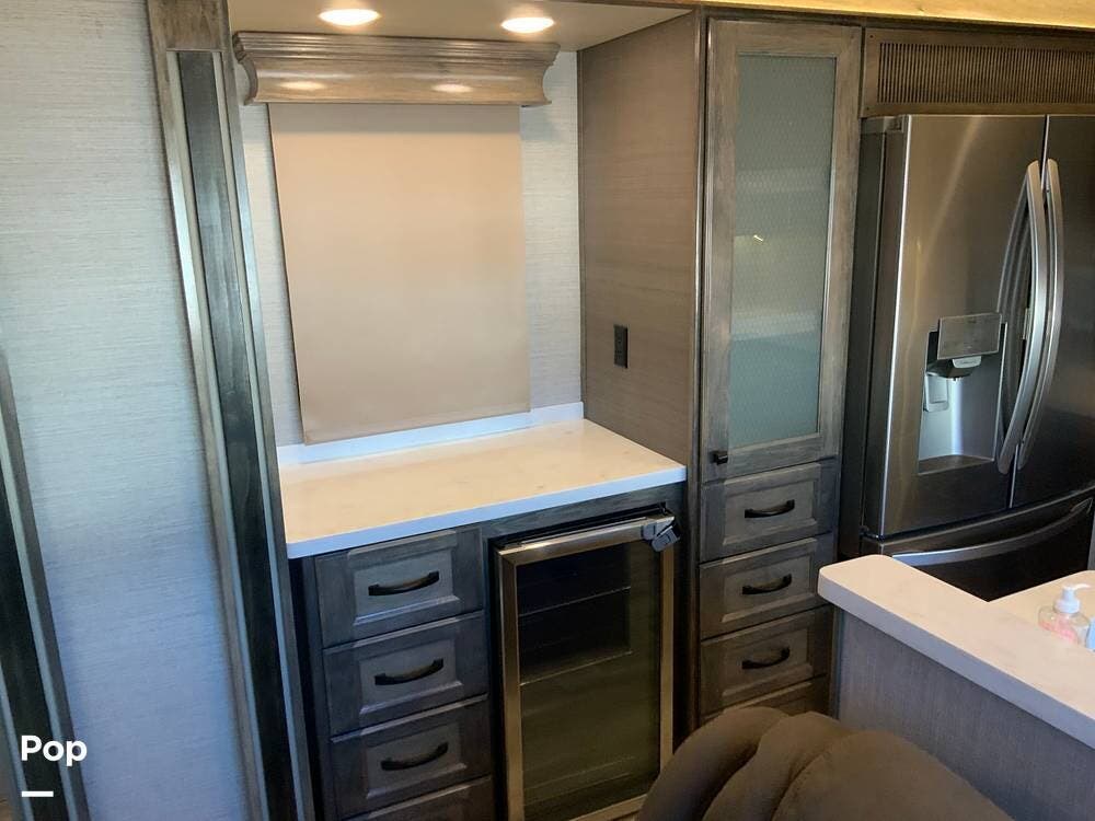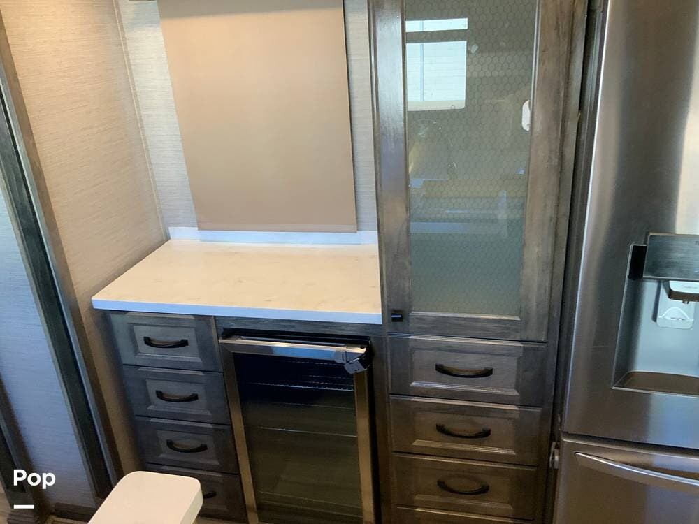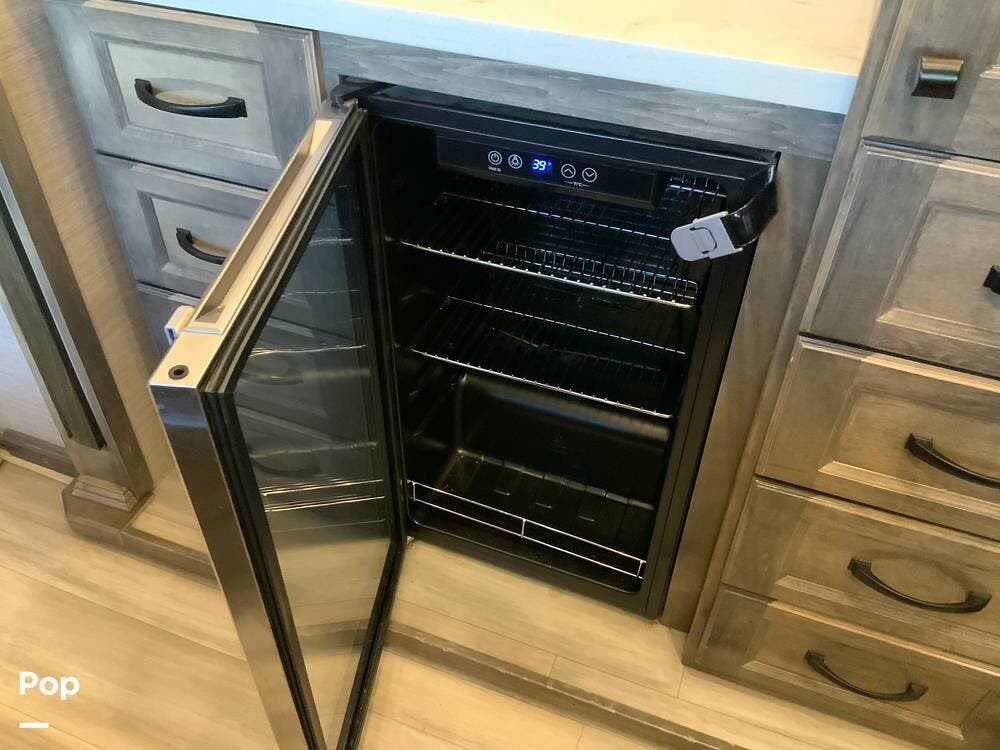 The kitchen is equally impressive, equipped with solid-surface countertops, a residential-size refrigerator, a four-burner stove with oven, convection microwave, and a dedicated wine cooler. Abundant cabinetry and pantry storage make it highly functional for extended trips or full-time use. The freestanding dining area adds flexibility and comfort for everyday living.