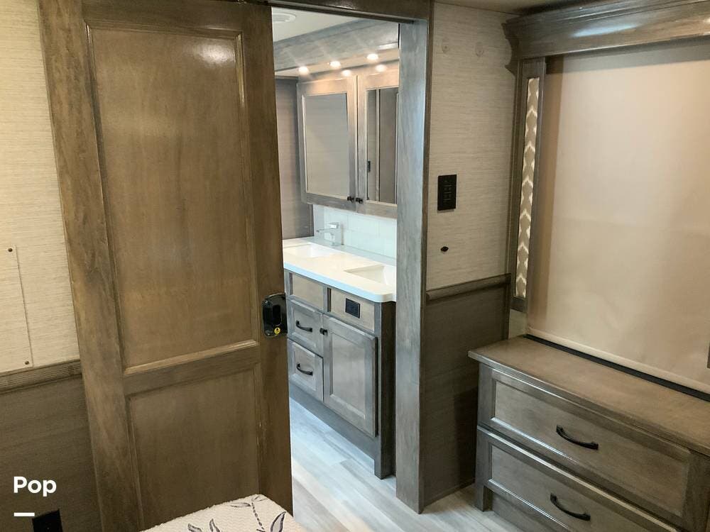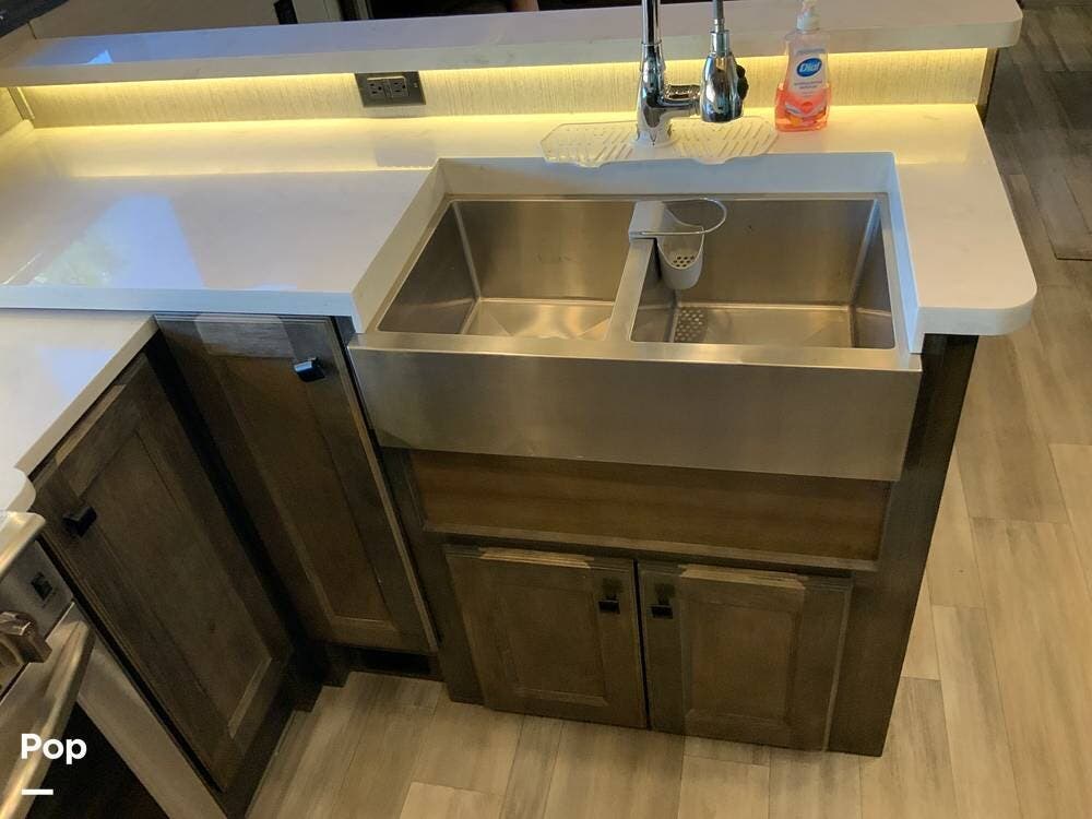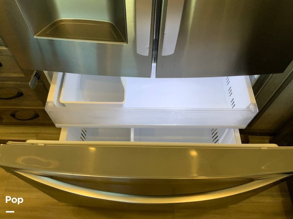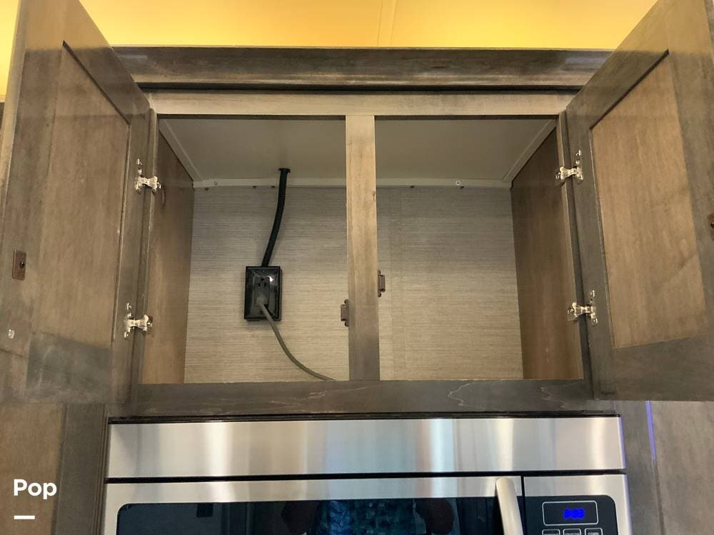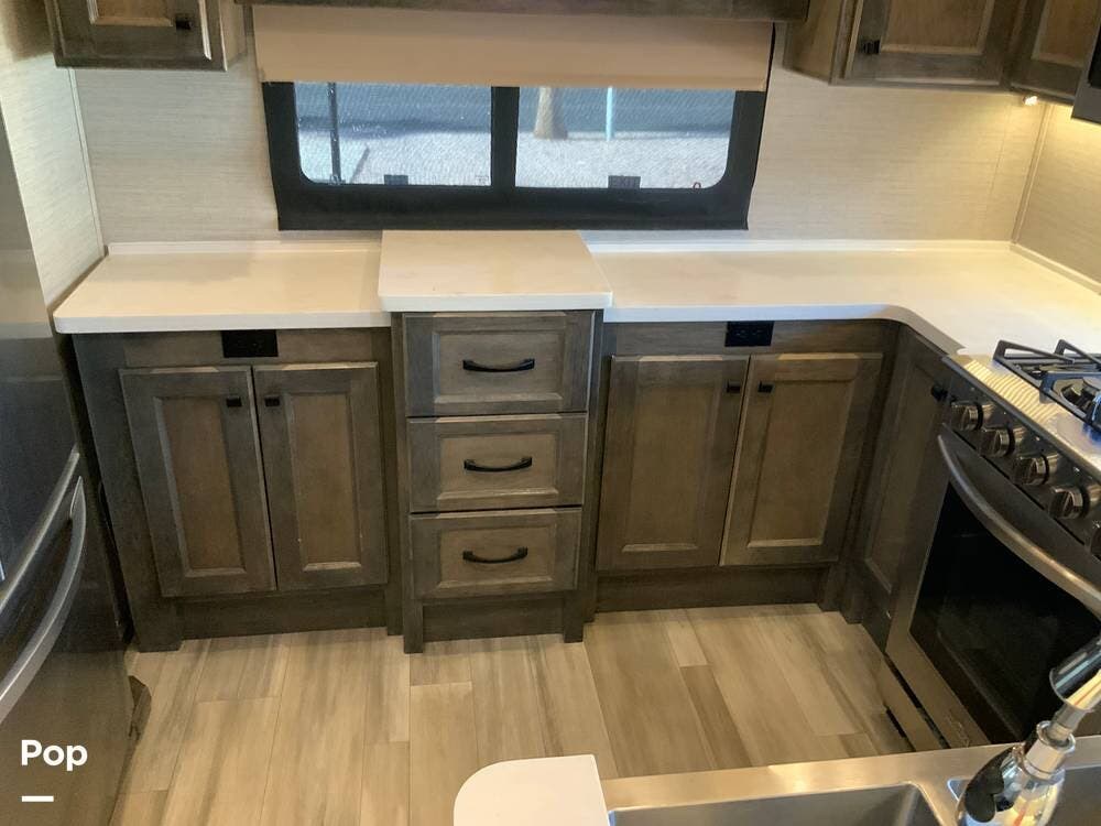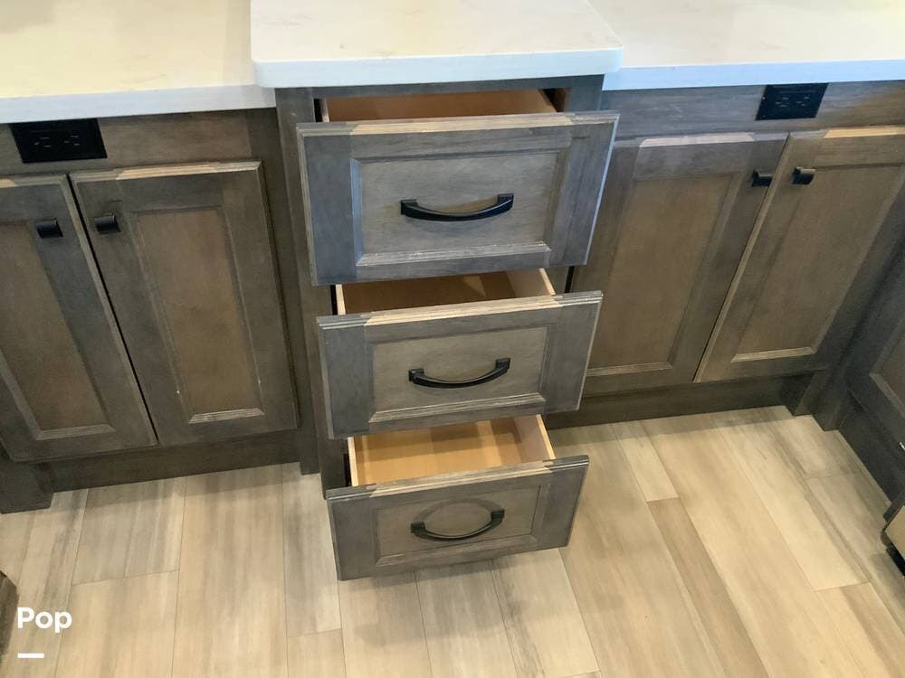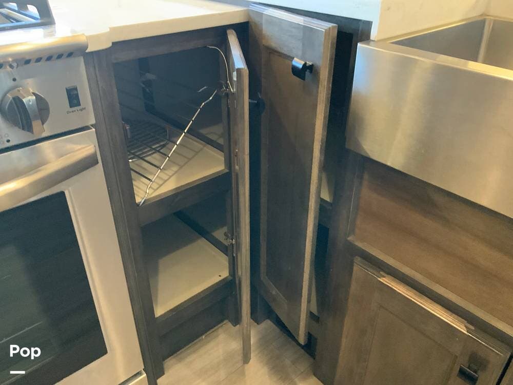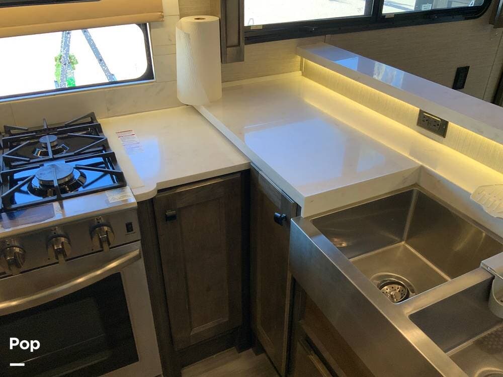 The kitchen is equally impressive, equipped with solid-surface countertops, a residential-size refrigerator, a four-burner stove with oven, convection microwave, and a dedicated wine cooler. Abundant cabinetry and pantry storage make it highly functional for extended trips or full-time use. The freestanding dining area adds flexibility and comfort for everyday living.
