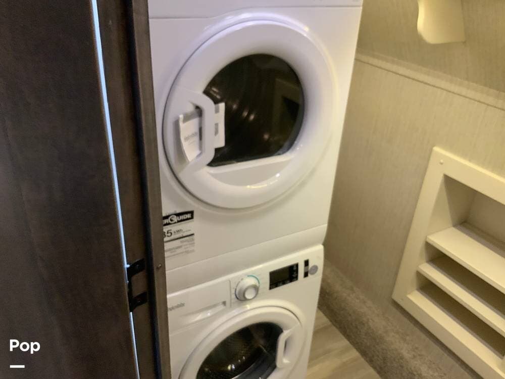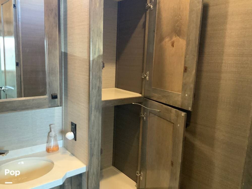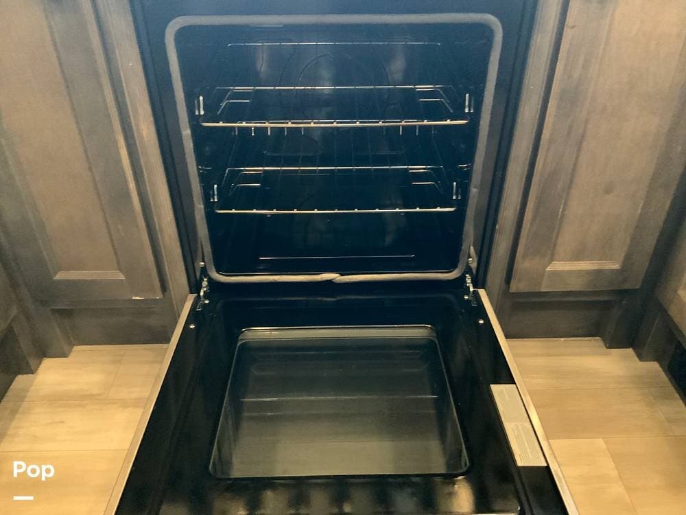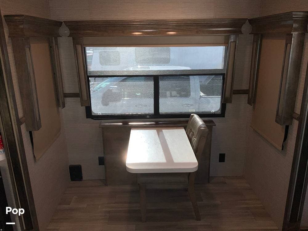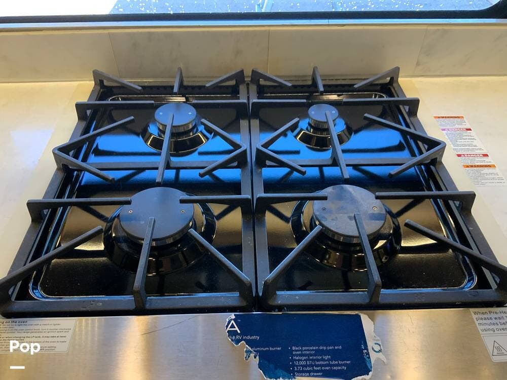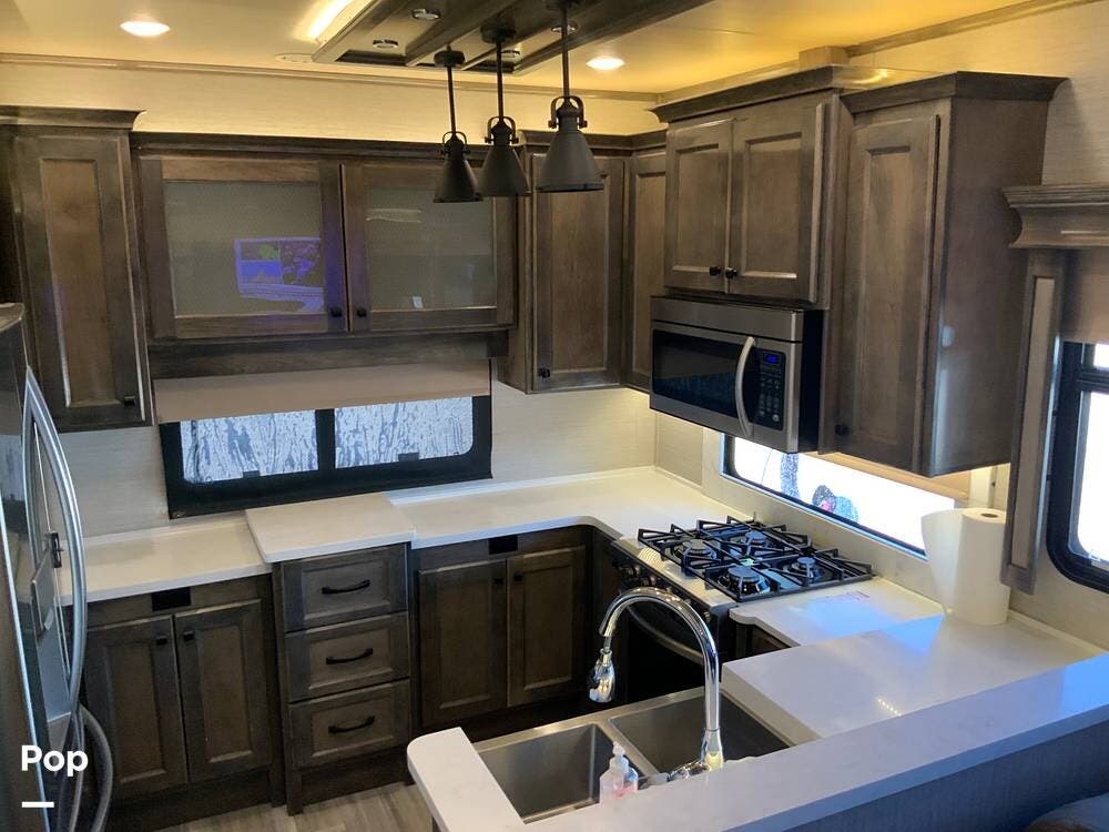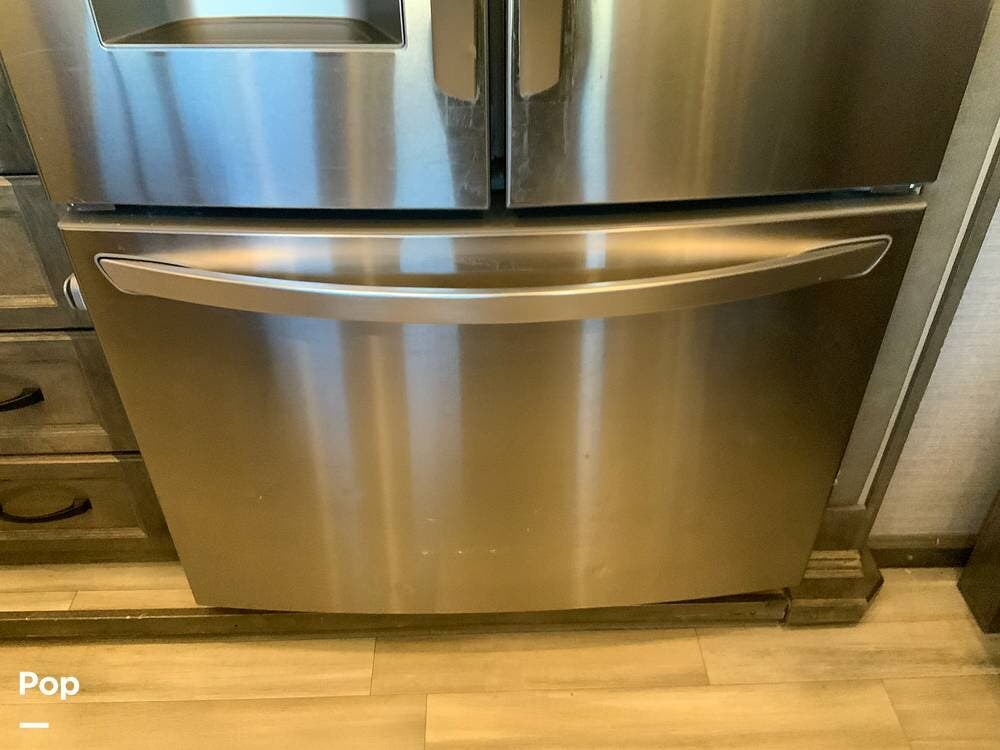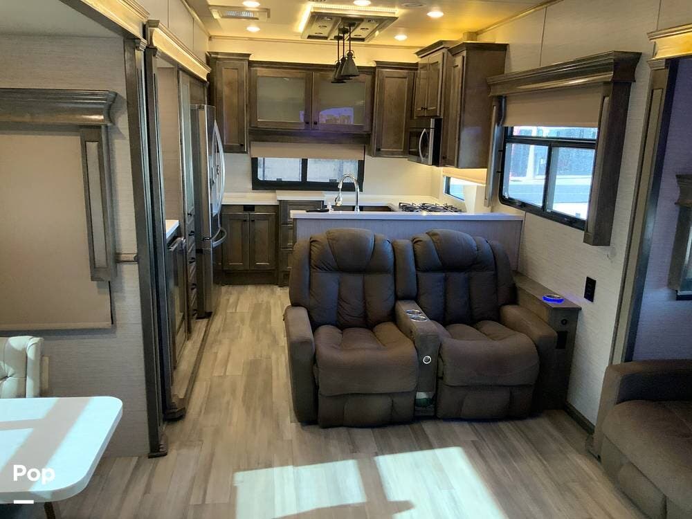 The kitchen is equally impressive, equipped with solid-surface countertops, a residential-size refrigerator, a four-burner stove with oven, convection microwave, and a dedicated wine cooler. Abundant cabinetry and pantry storage make it highly functional for extended trips or full-time use. The freestanding dining area adds flexibility and comfort for everyday living.