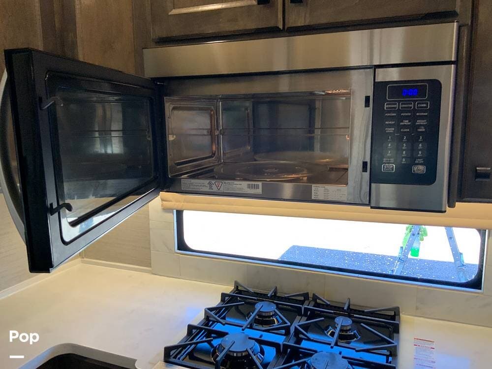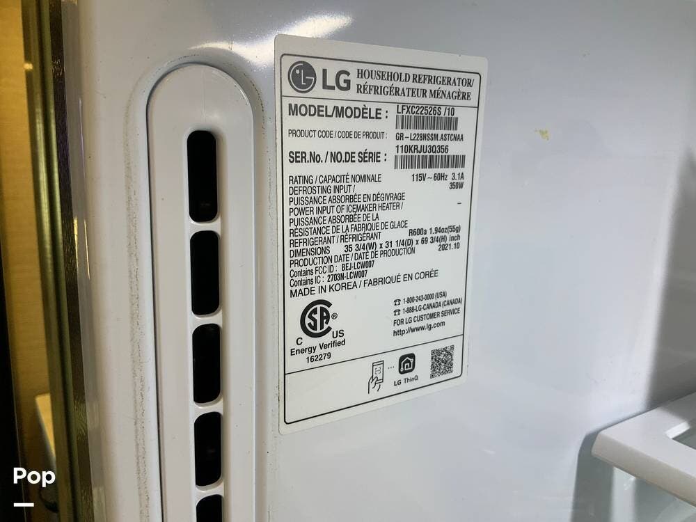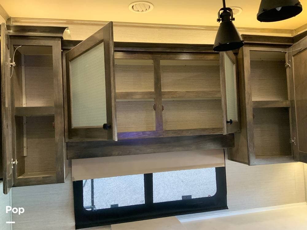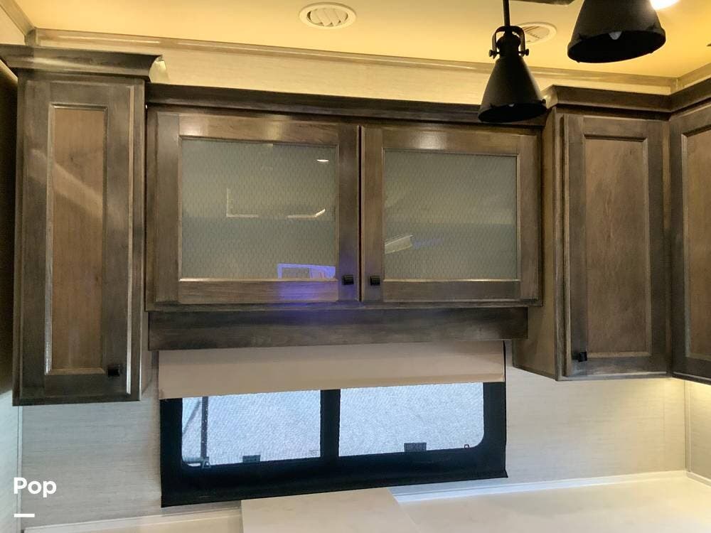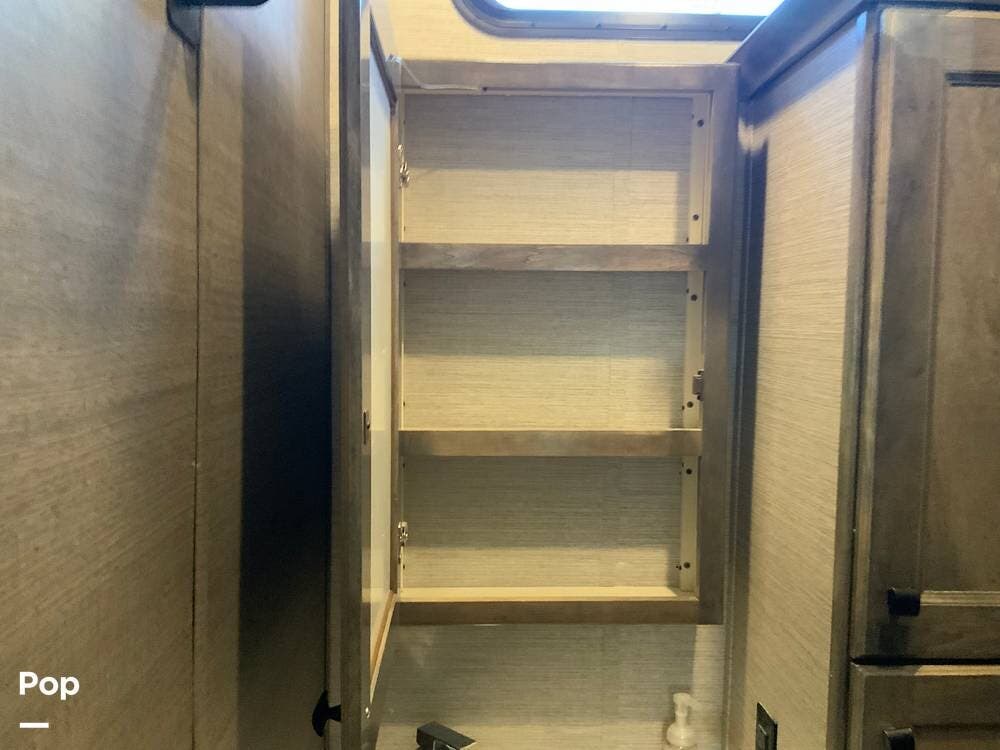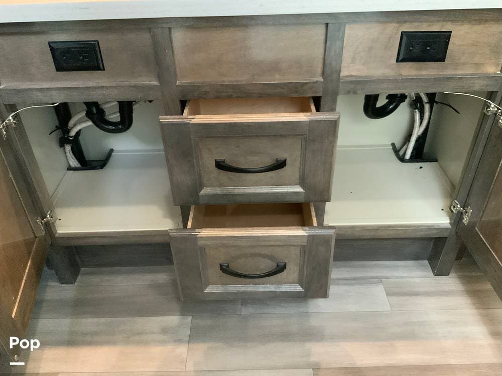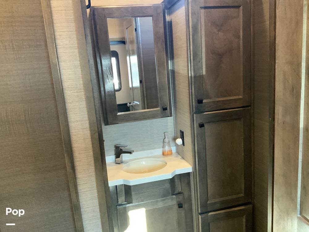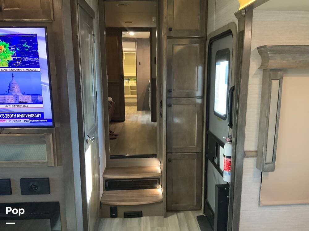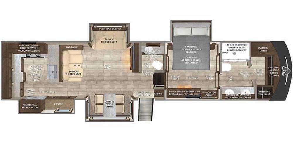 The kitchen is equally impressive, equipped with solid-surface countertops, a residential-size refrigerator, a four-burner stove with oven, convection microwave, and a dedicated wine cooler. Abundant cabinetry and pantry storage make it highly functional for extended trips or full-time use. The freestanding dining area adds flexibility and comfort for everyday living.