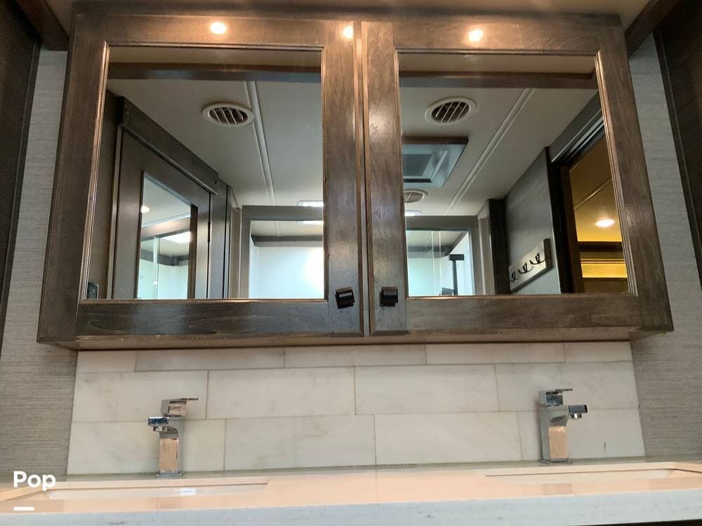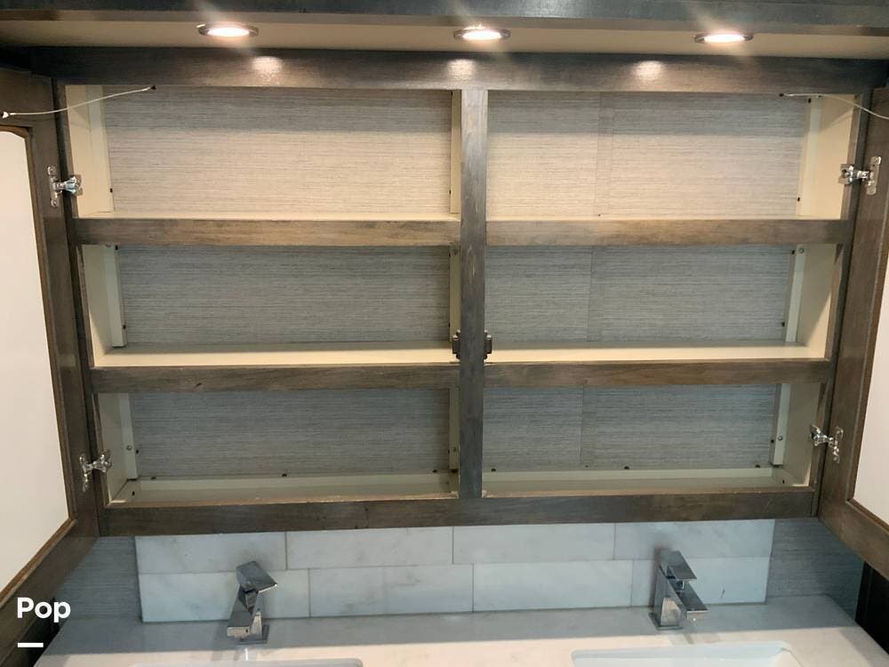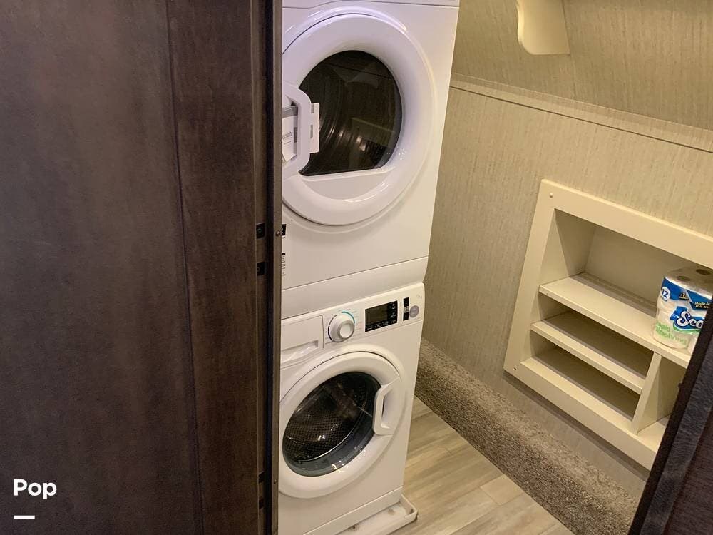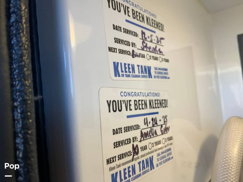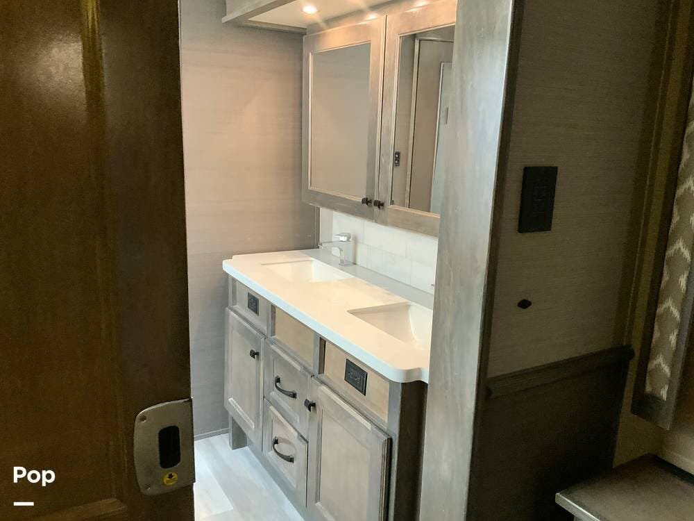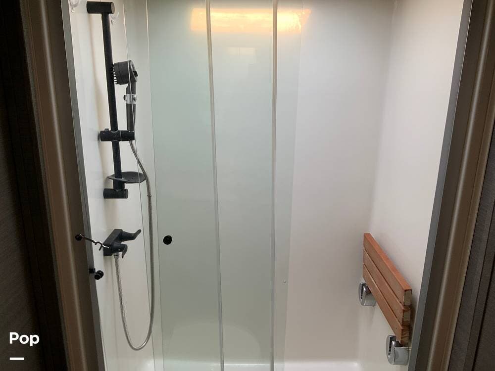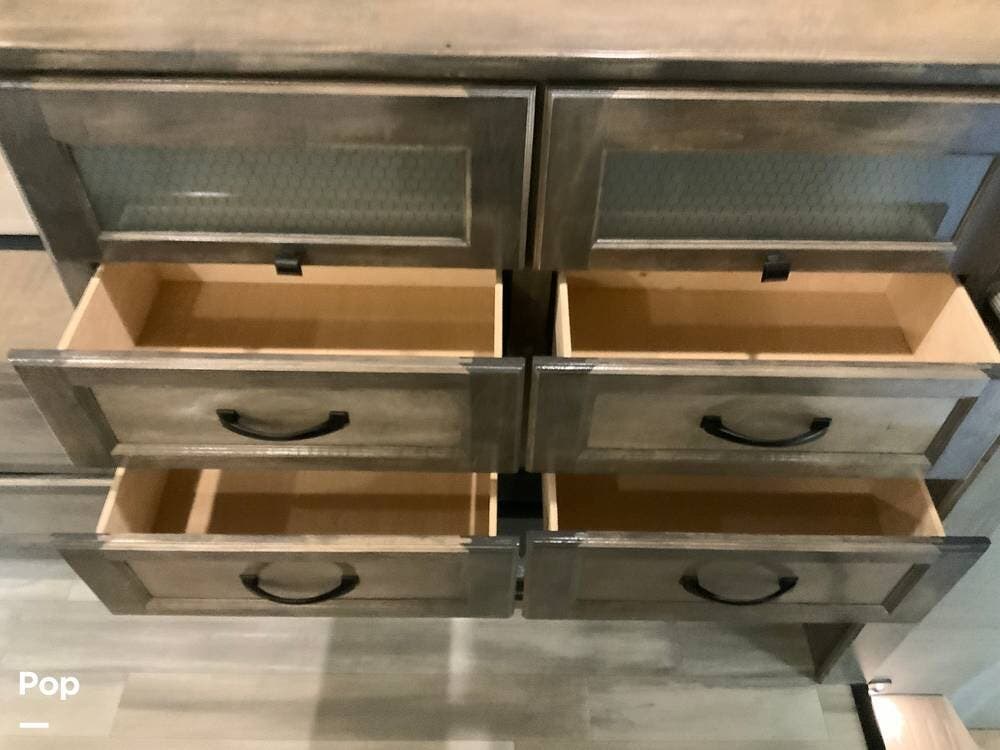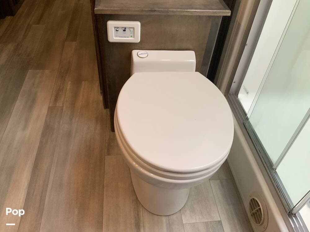 The kitchen is equally impressive, equipped with solid-surface countertops, a residential-size refrigerator, a four-burner stove with oven, convection microwave, and a dedicated wine cooler. Abundant cabinetry and pantry storage make it highly functional for extended trips or full-time use. The freestanding dining area adds flexibility and comfort for everyday living.