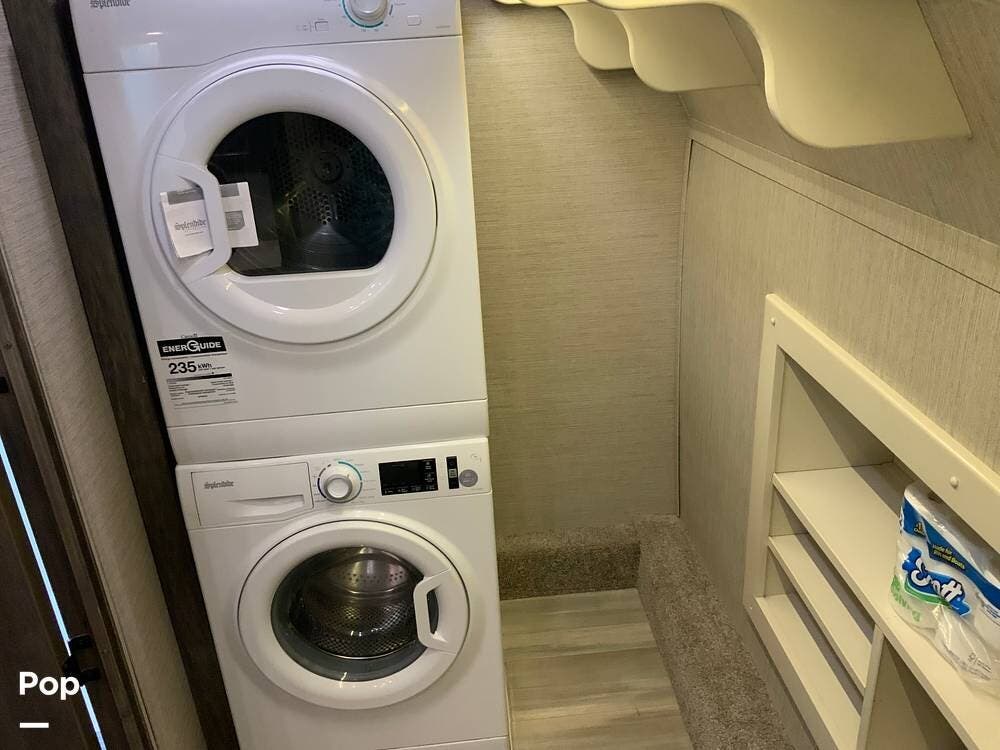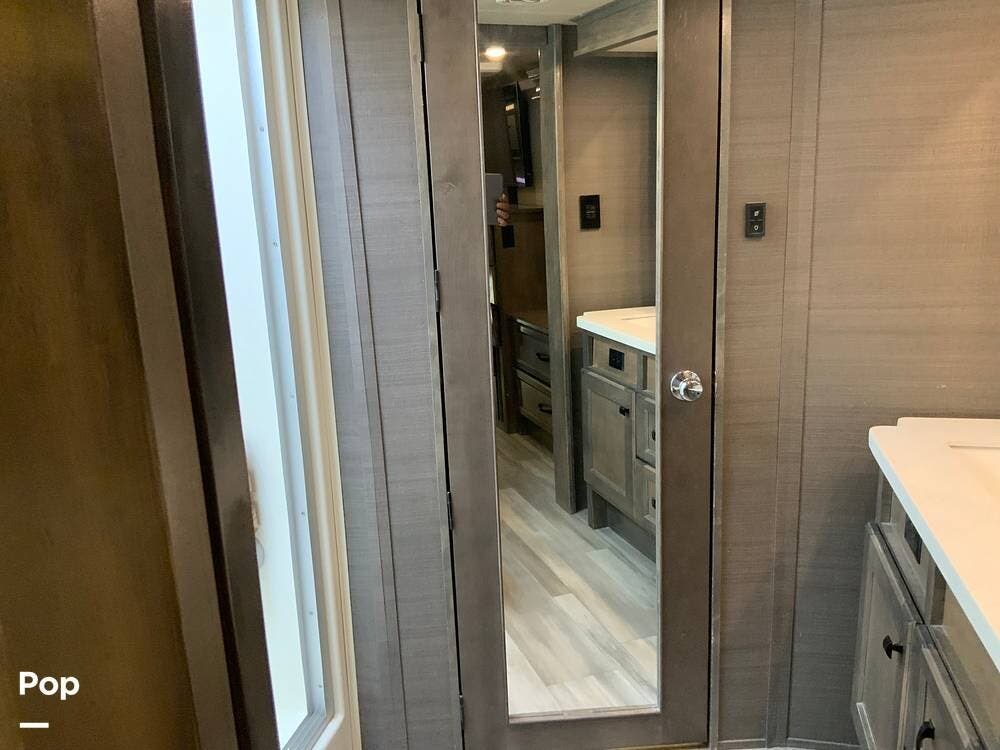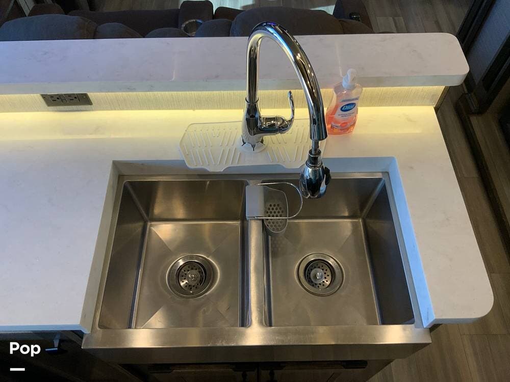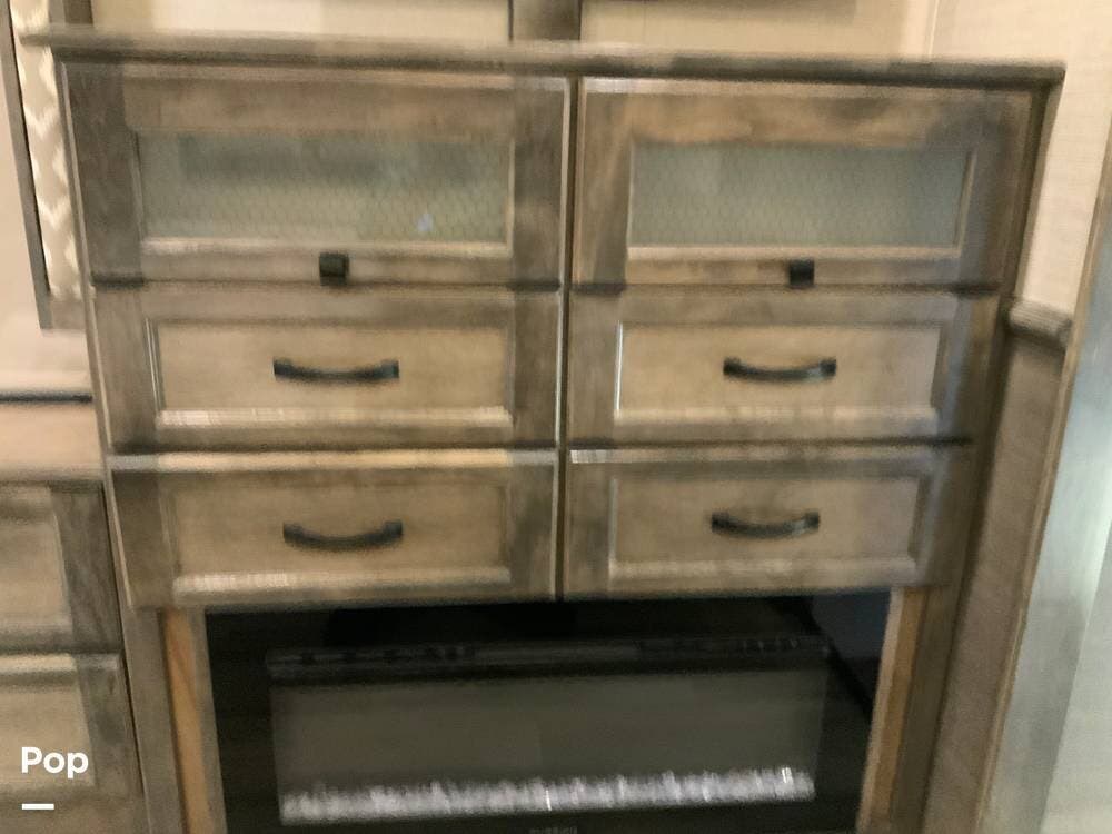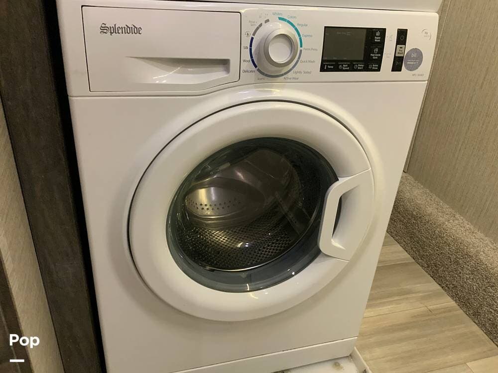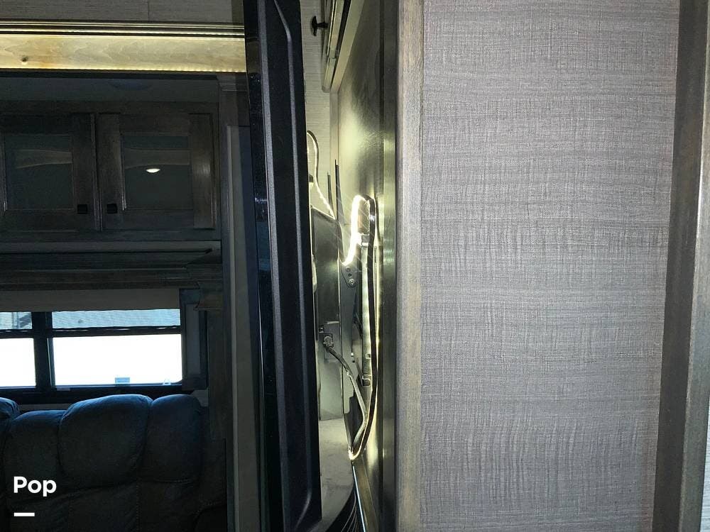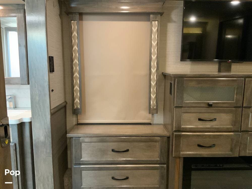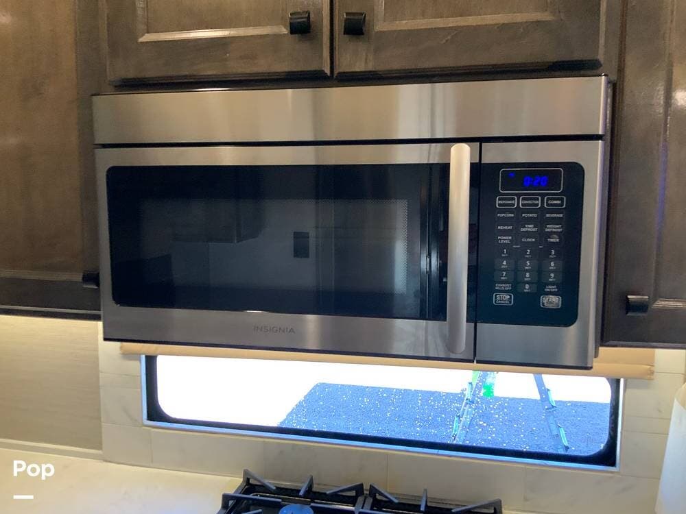 The kitchen is equally impressive, equipped with solid-surface countertops, a residential-size refrigerator, a four-burner stove with oven, convection microwave, and a dedicated wine cooler. Abundant cabinetry and pantry storage make it highly functional for extended trips or full-time use. The freestanding dining area adds flexibility and comfort for everyday living.
