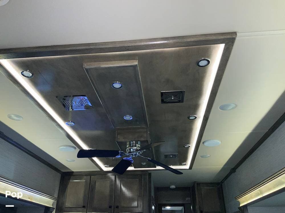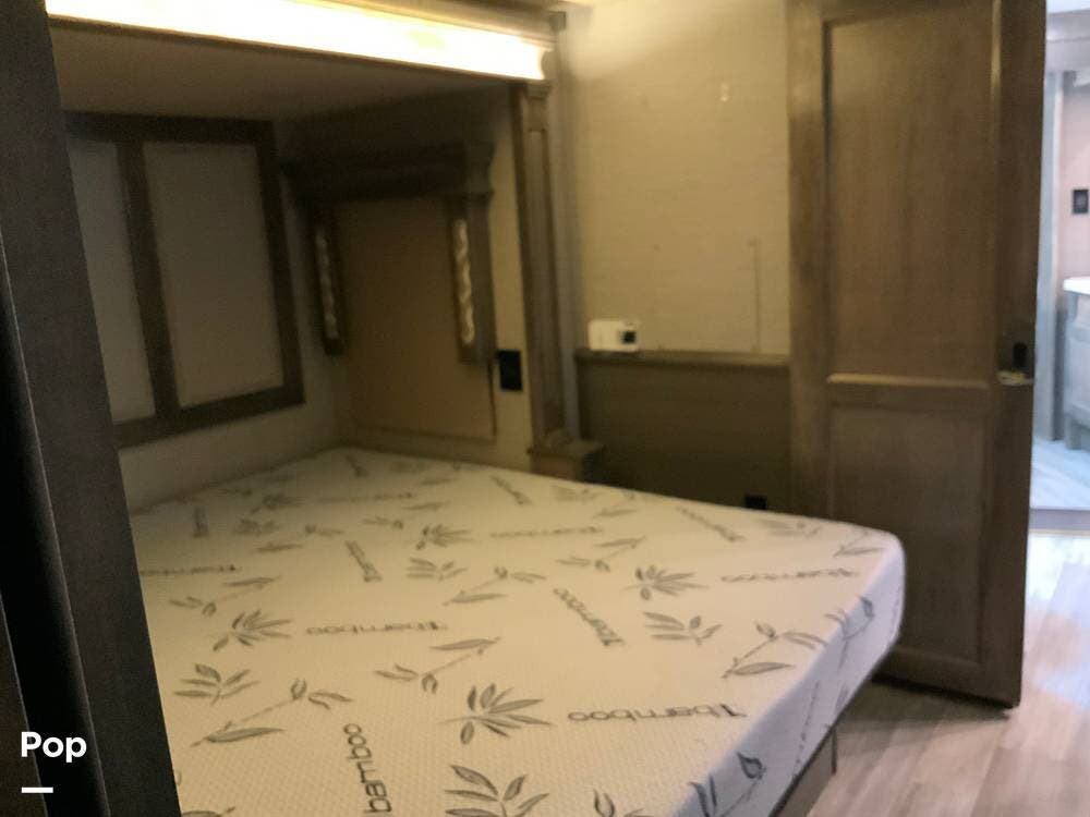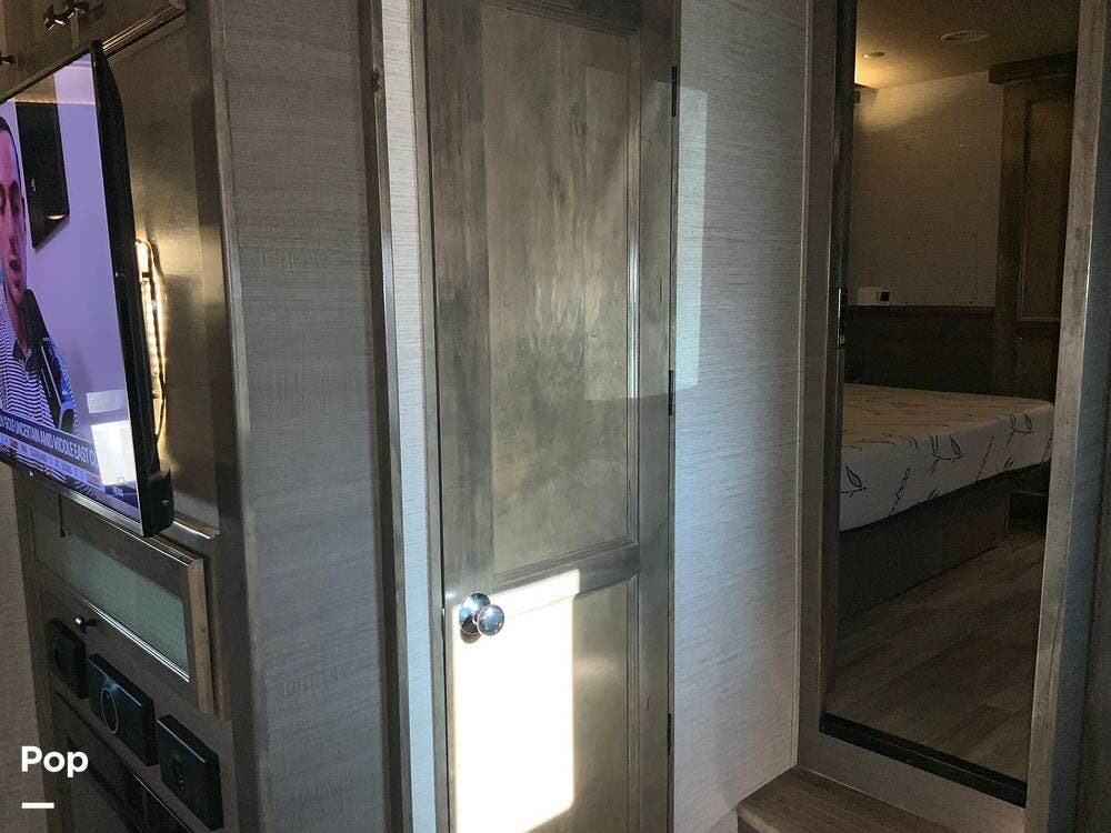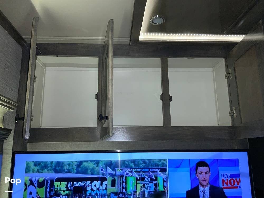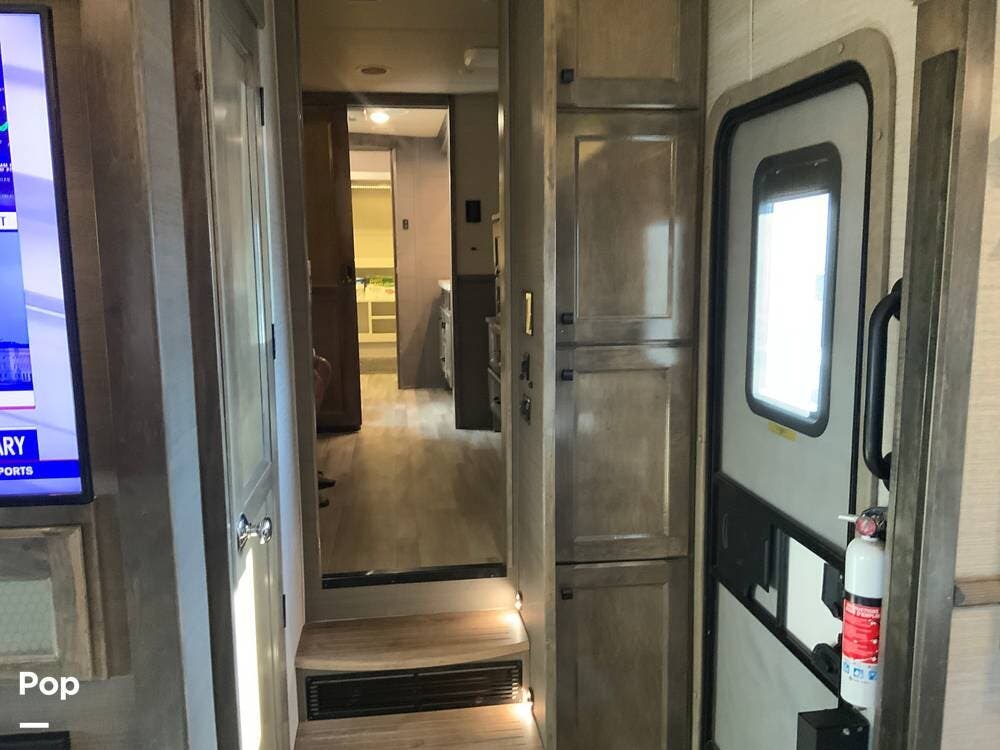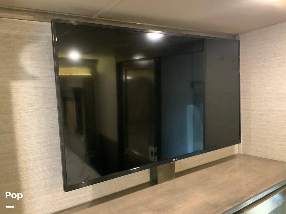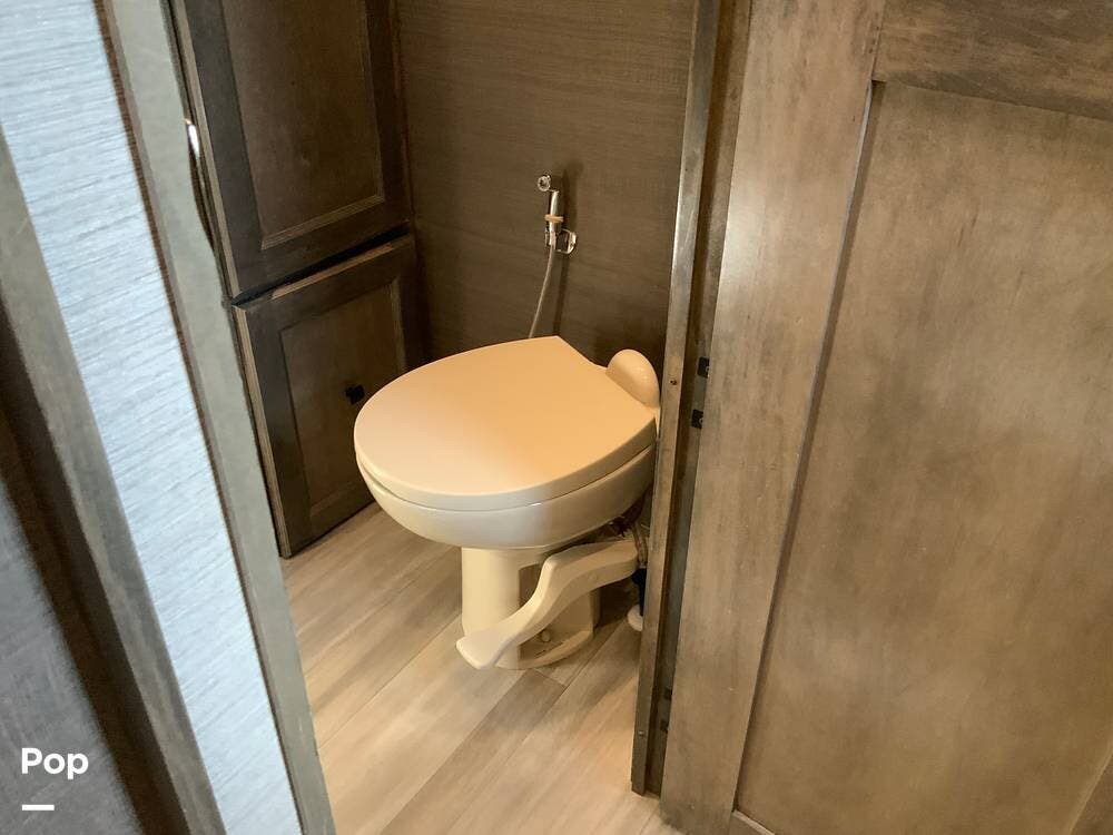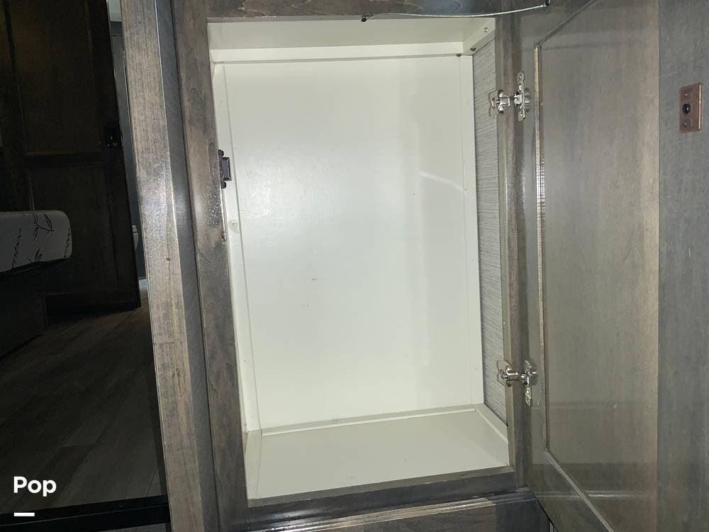 The kitchen is equally impressive, equipped with solid-surface countertops, a residential-size refrigerator, a four-burner stove with oven, convection microwave, and a dedicated wine cooler. Abundant cabinetry and pantry storage make it highly functional for extended trips or full-time use. The freestanding dining area adds flexibility and comfort for everyday living.