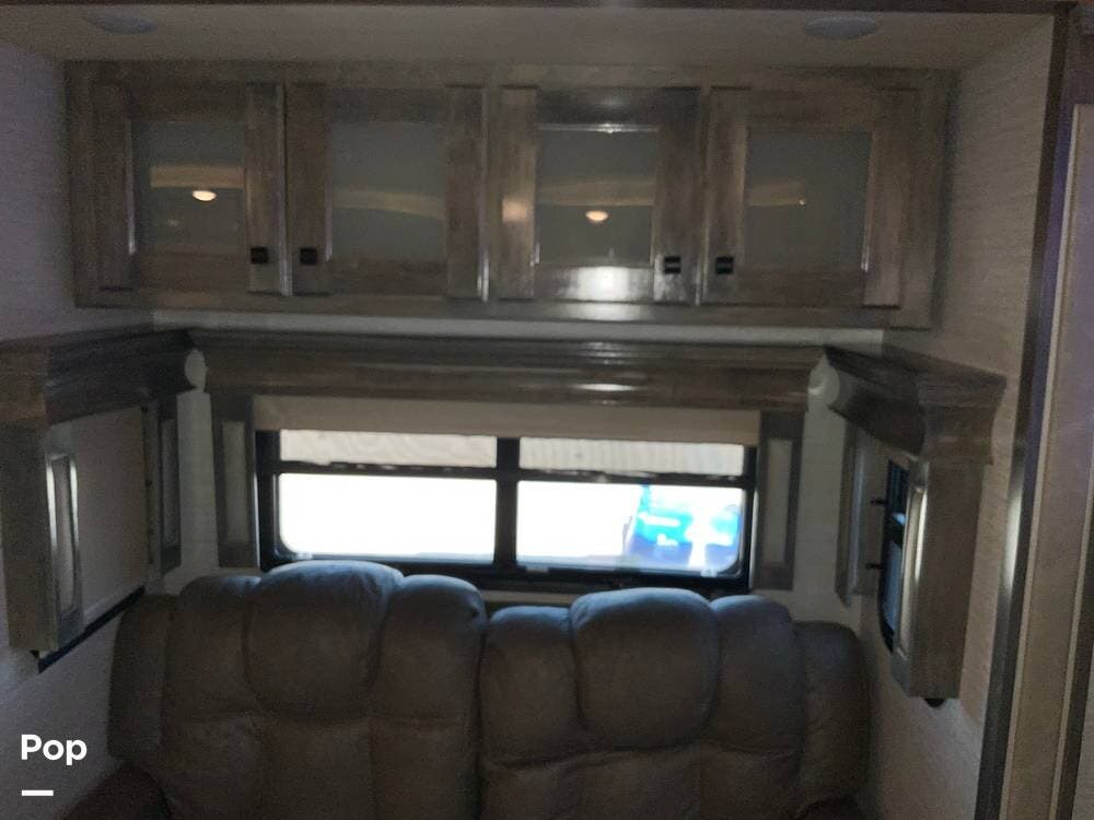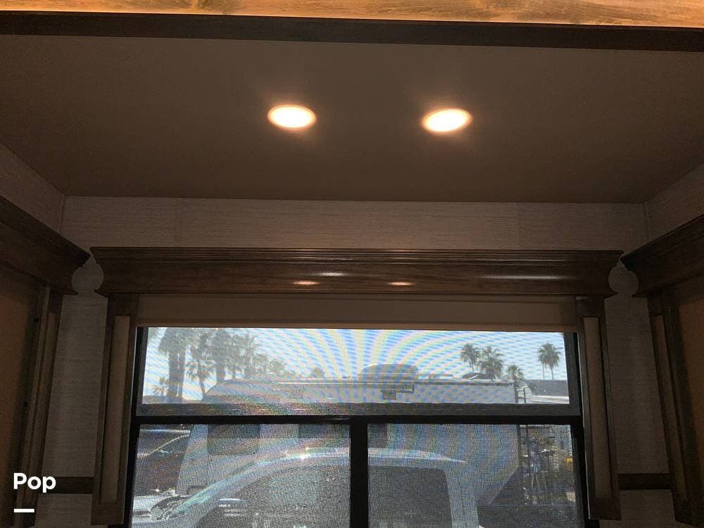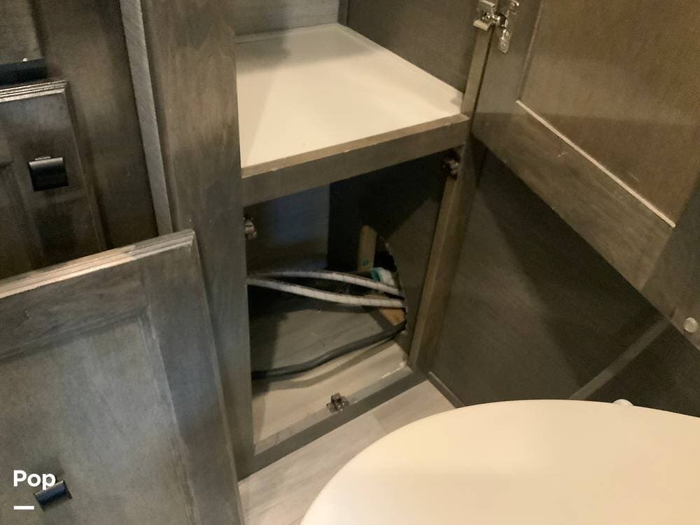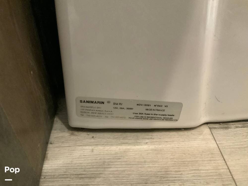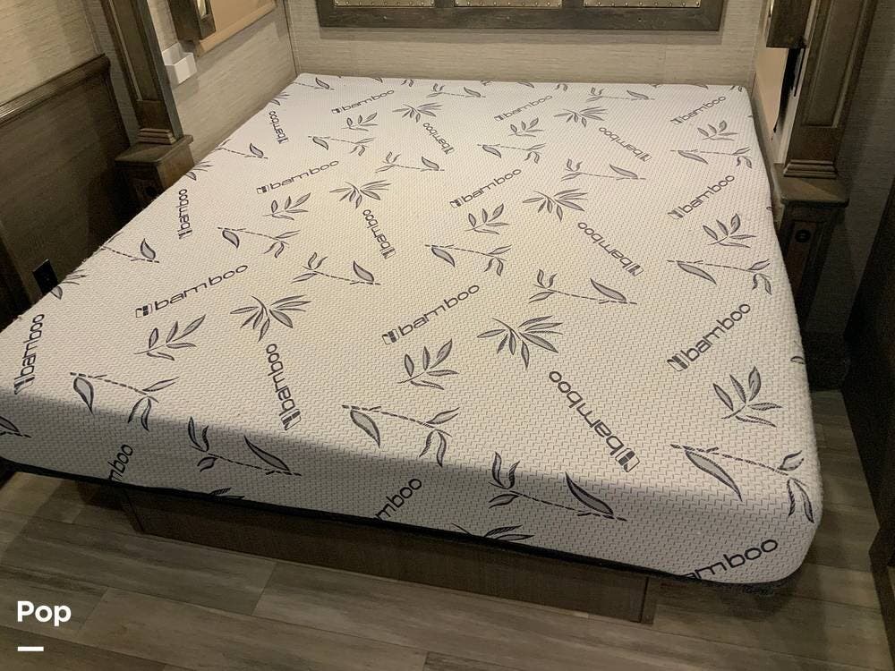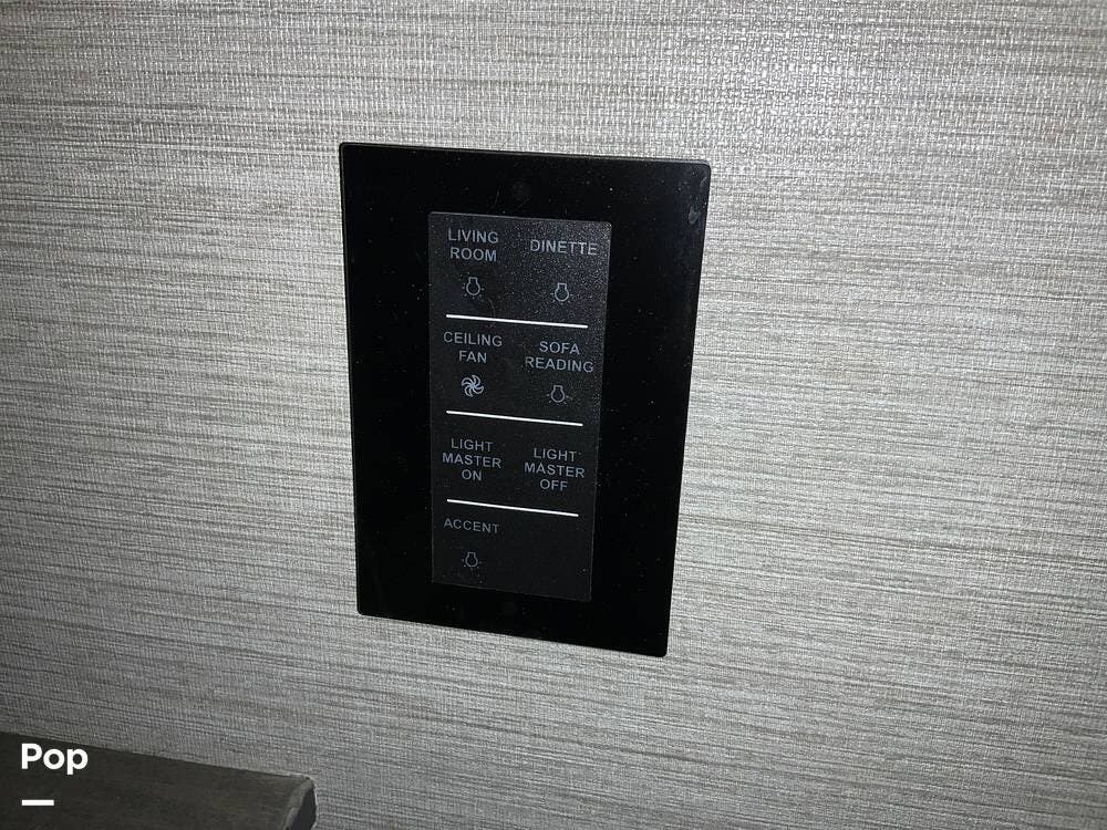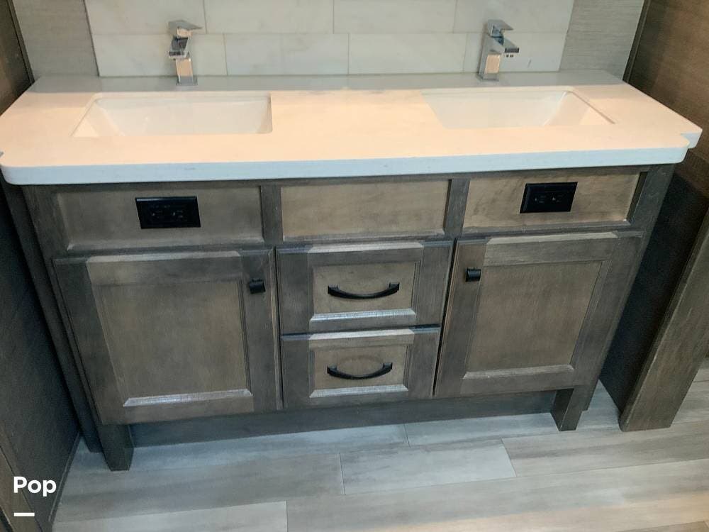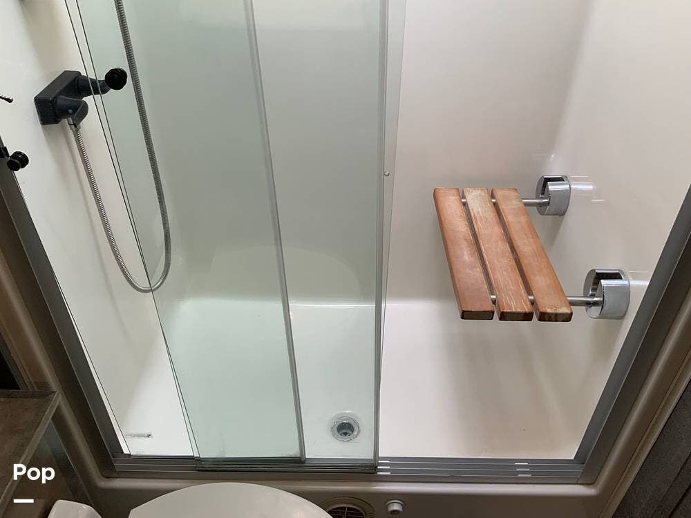 The kitchen is equally impressive, equipped with solid-surface countertops, a residential-size refrigerator, a four-burner stove with oven, convection microwave, and a dedicated wine cooler. Abundant cabinetry and pantry storage make it highly functional for extended trips or full-time use. The freestanding dining area adds flexibility and comfort for everyday living.