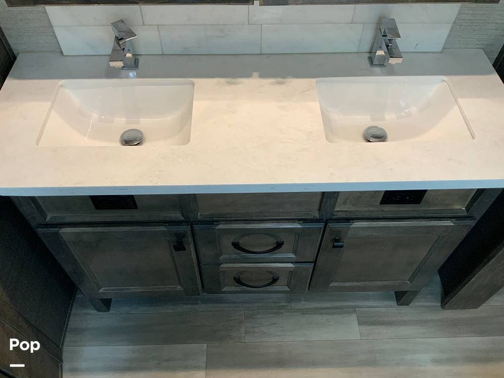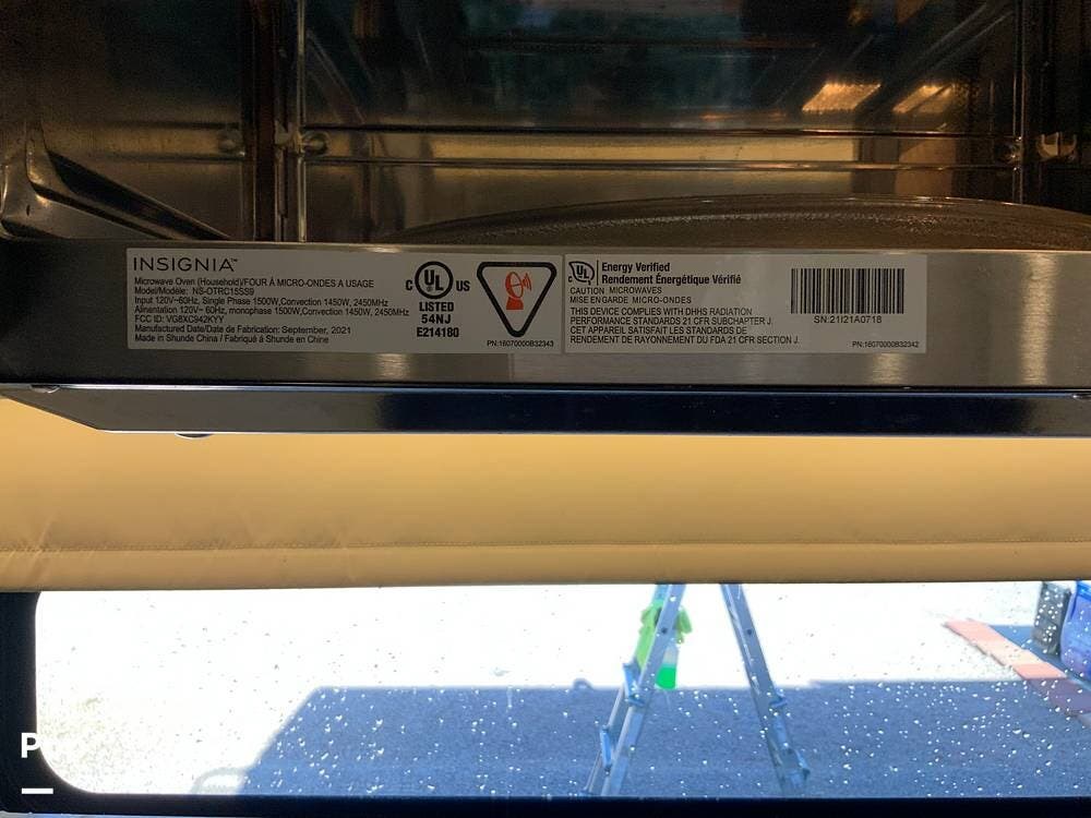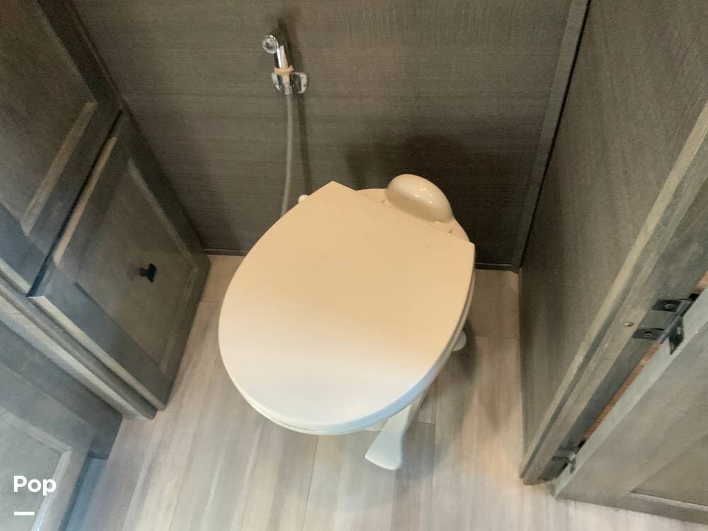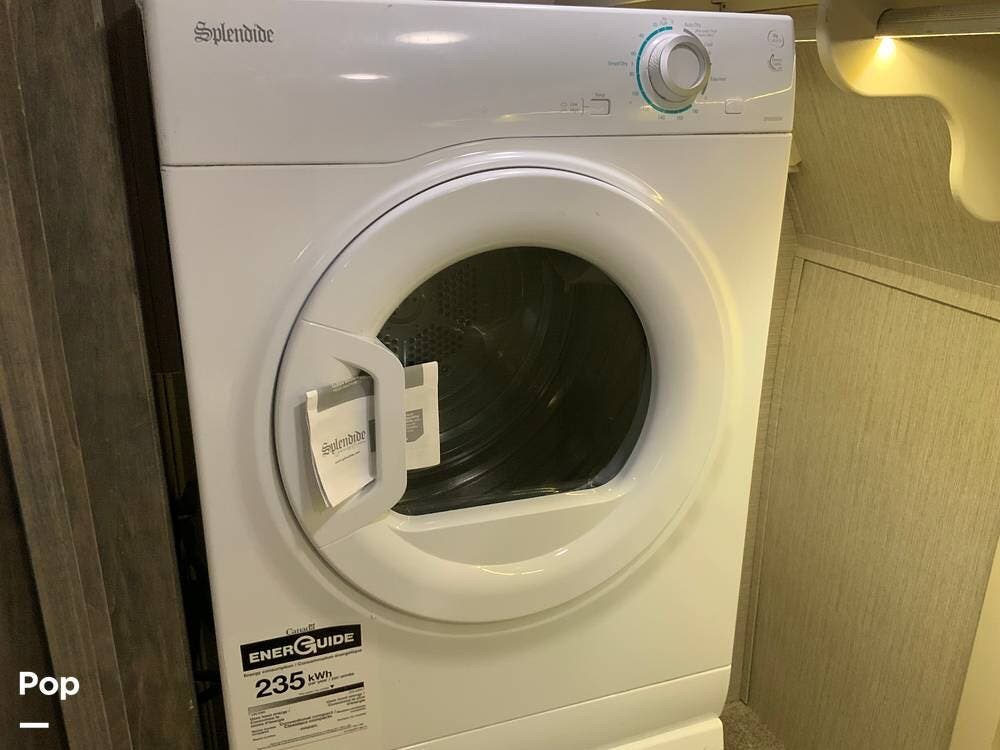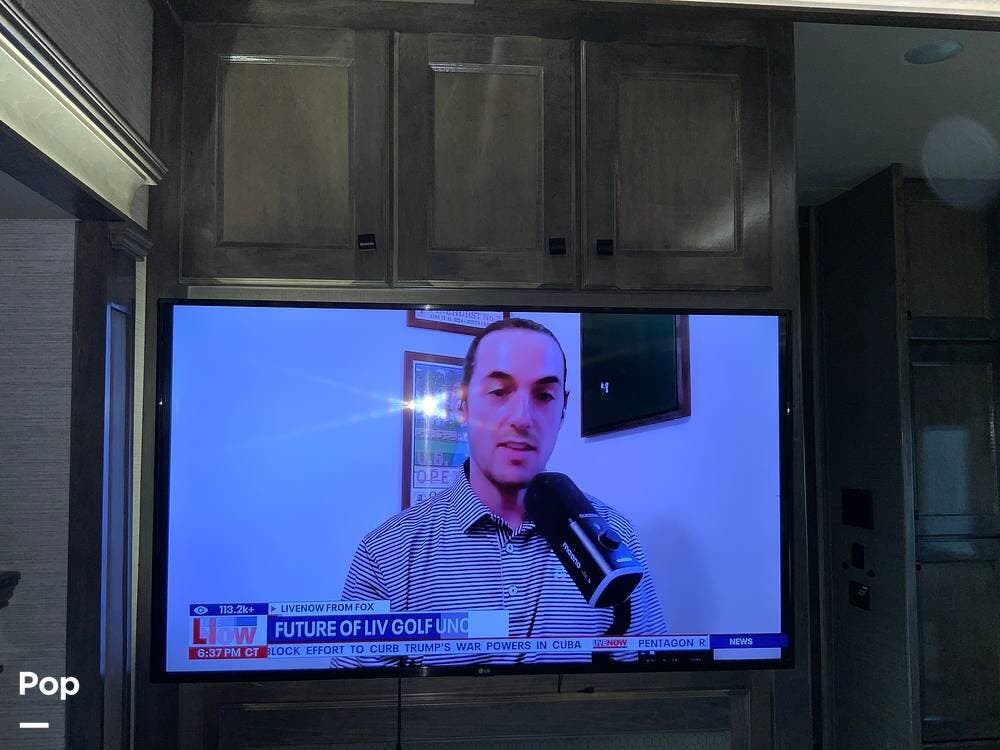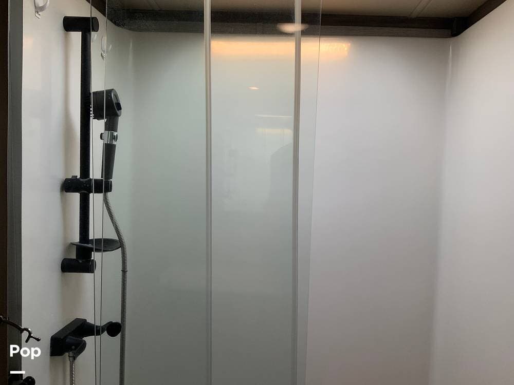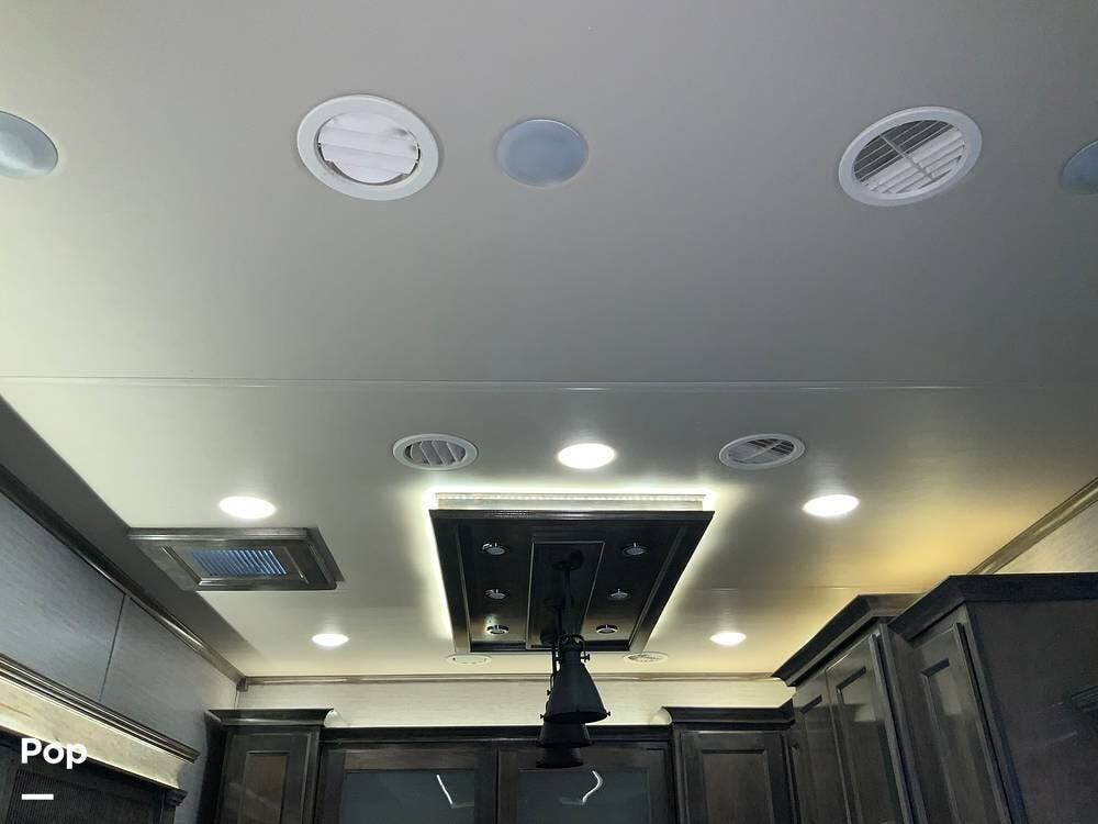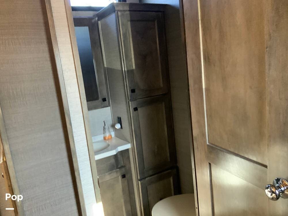 The kitchen is equally impressive, equipped with solid-surface countertops, a residential-size refrigerator, a four-burner stove with oven, convection microwave, and a dedicated wine cooler. Abundant cabinetry and pantry storage make it highly functional for extended trips or full-time use. The freestanding dining area adds flexibility and comfort for everyday living.