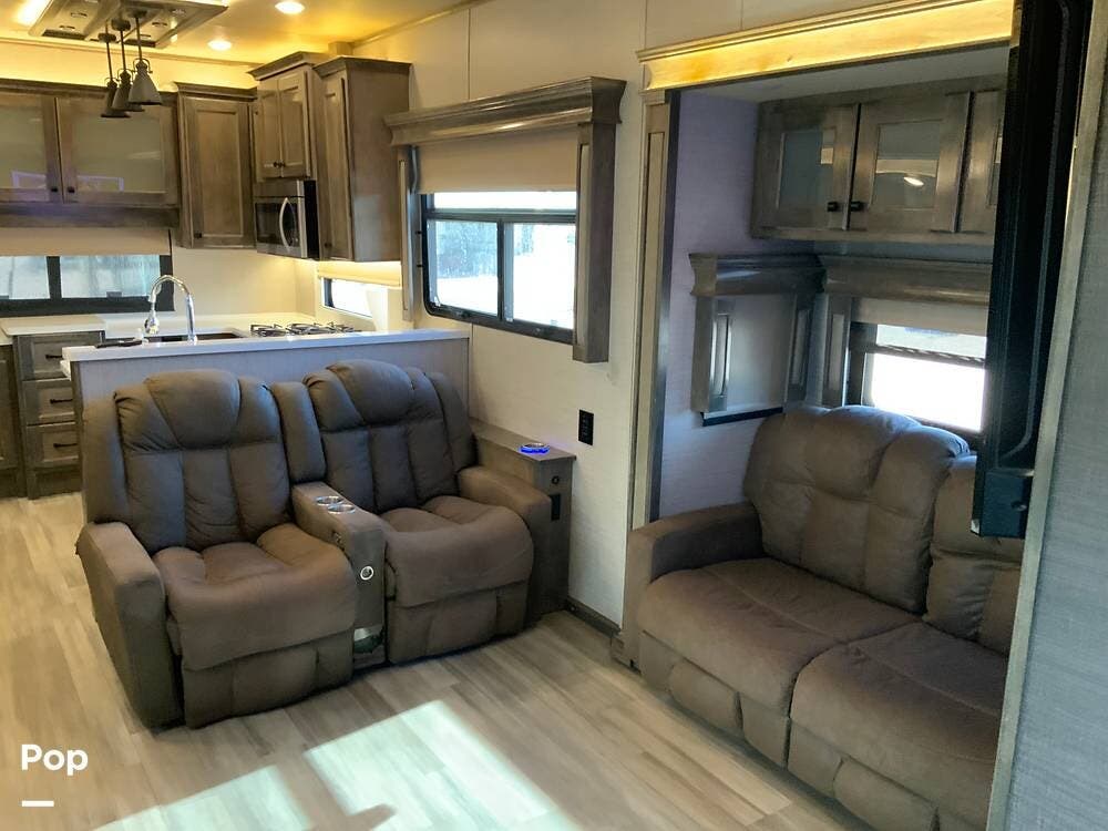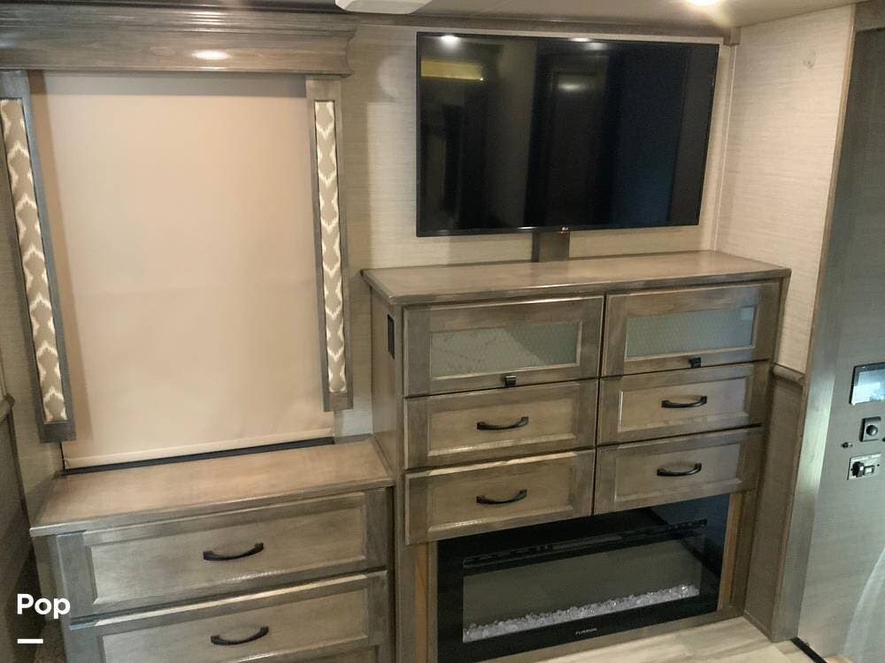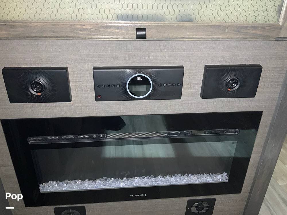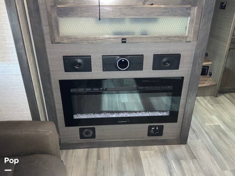 The front living area is a standout, featuring dual opposing slides, theater seating, additional recliners, a large entertainment center with JBL sound, and an electric fireplace that adds both ambiance and supplemental heat. Large windows and premium finishes give this space a true "home" feel rather than a typical RV layout.