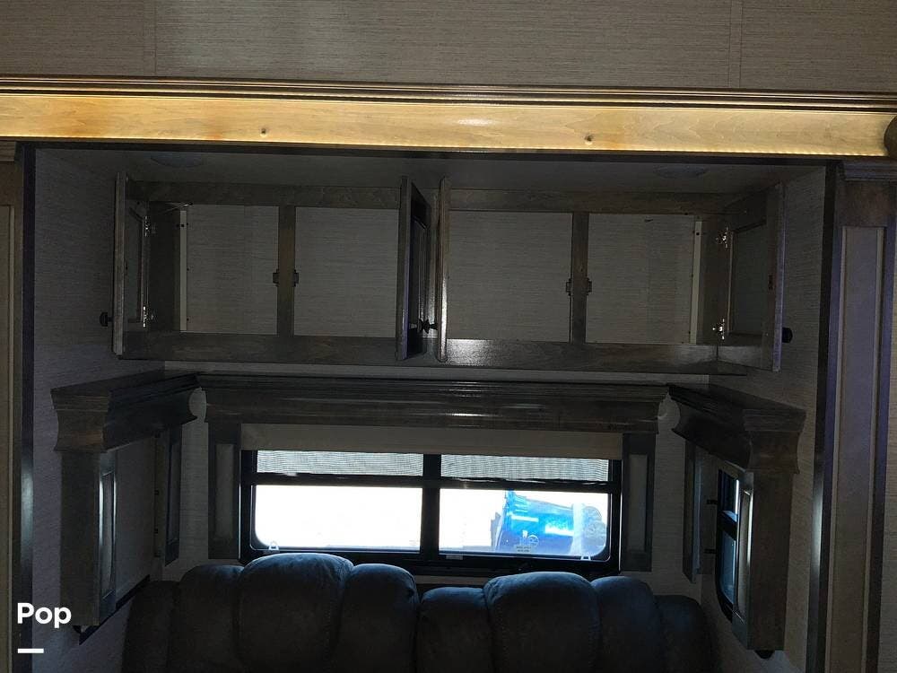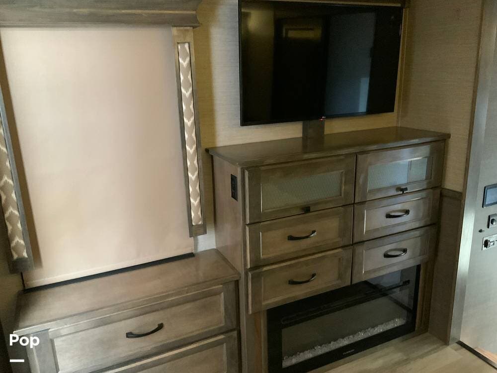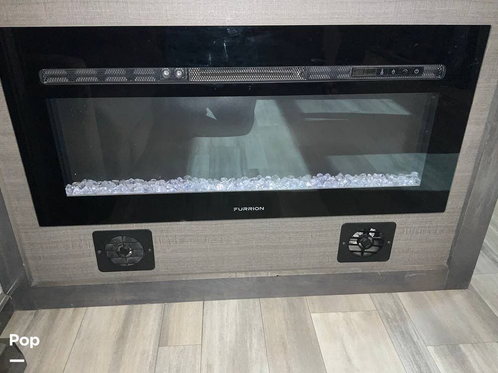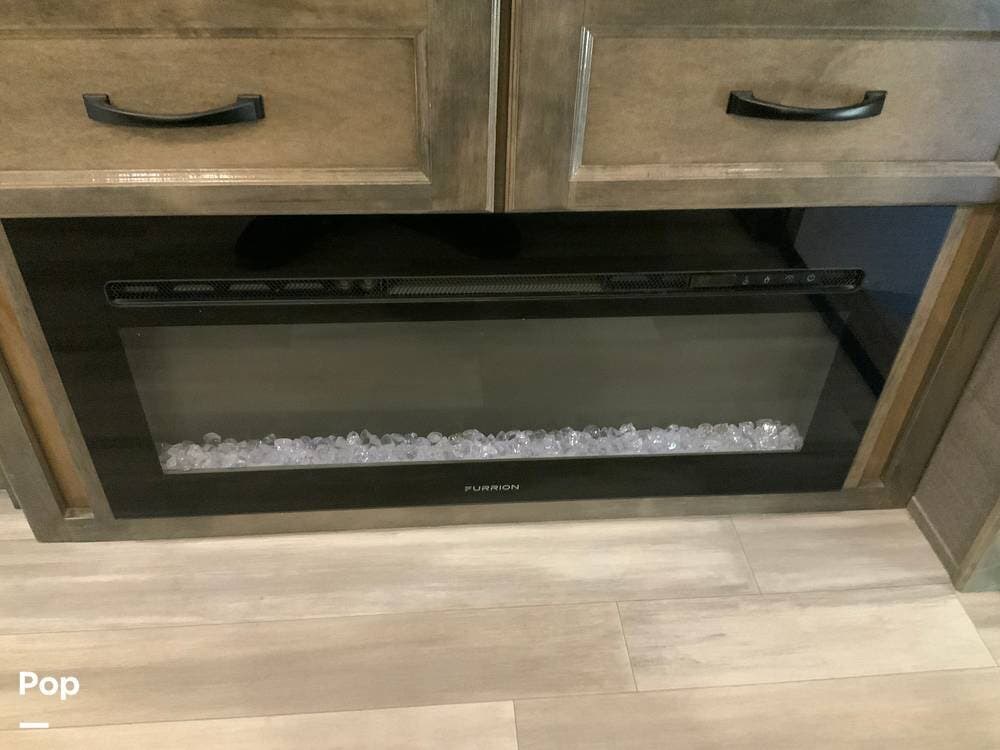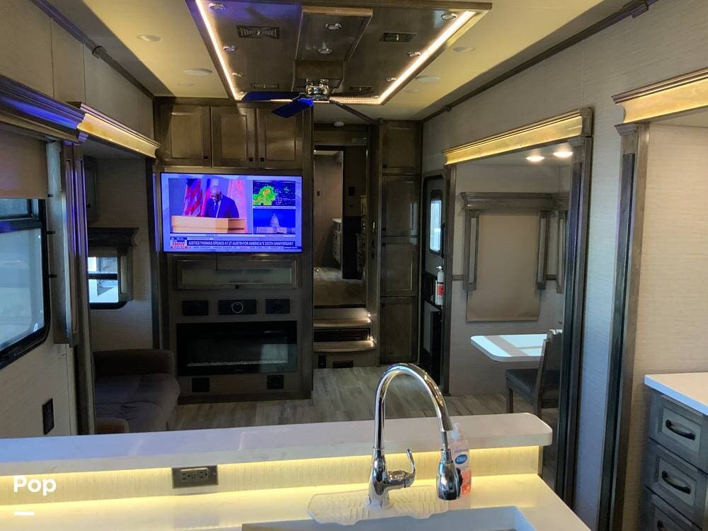 The front living area is a standout, featuring dual opposing slides, theater seating, additional recliners, a large entertainment center with JBL sound, and an electric fireplace that adds both ambiance and supplemental heat. Large windows and premium finishes give this space a true "home" feel rather than a typical RV layout.