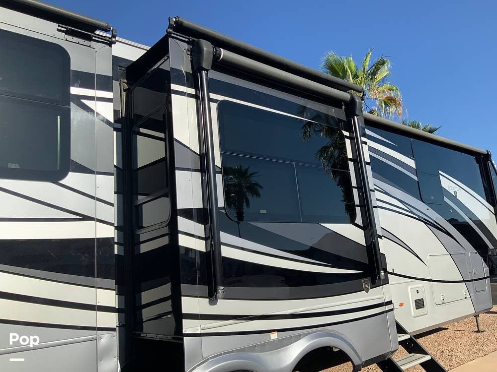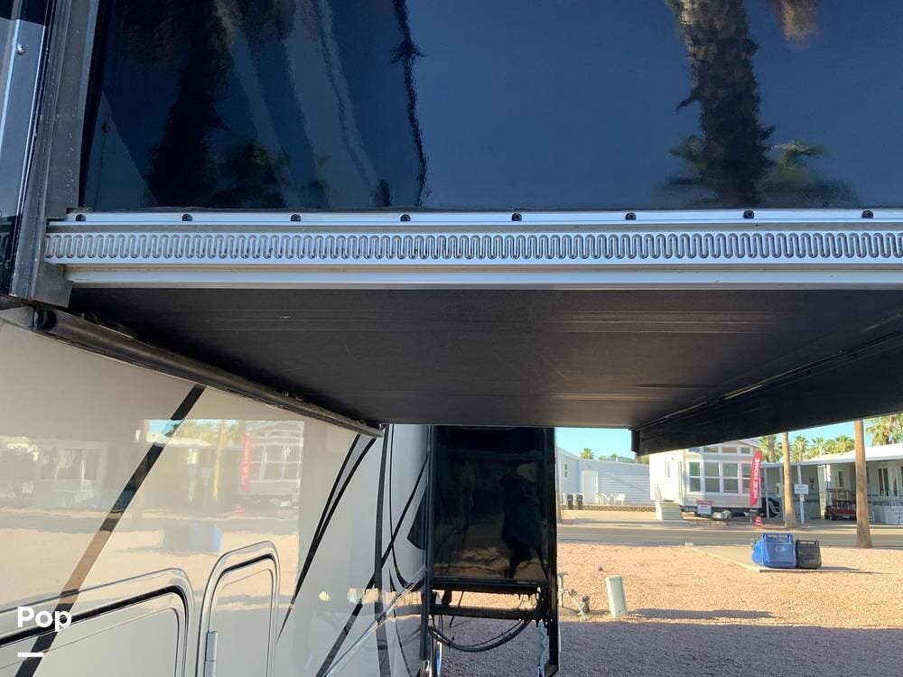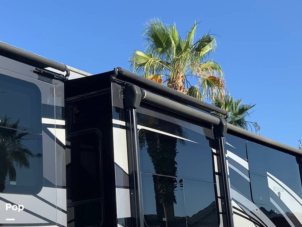 Exterior features include a large pass-through storage compartment, dual power awnings provide extended outdoor living space and full-length shade coverage on the patio side of this Beacon.