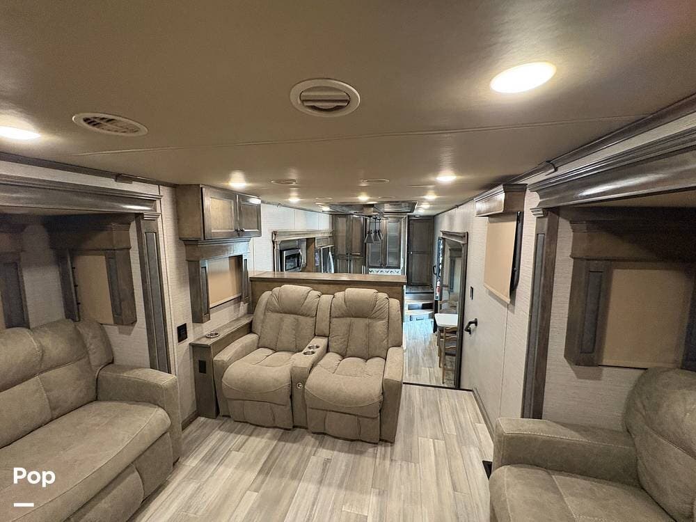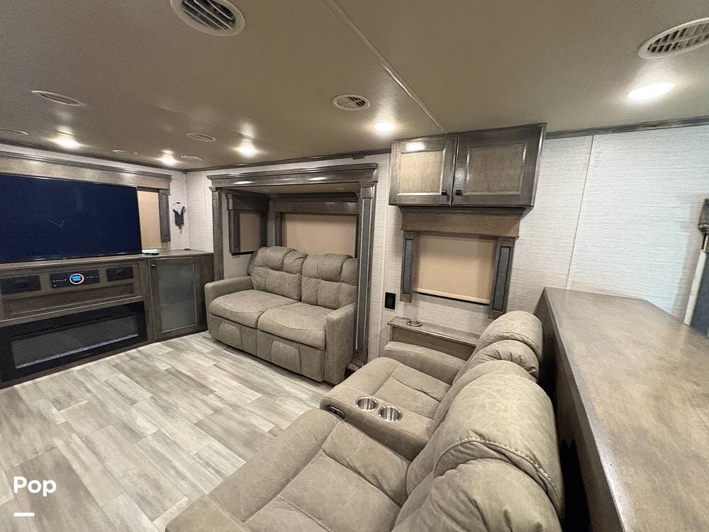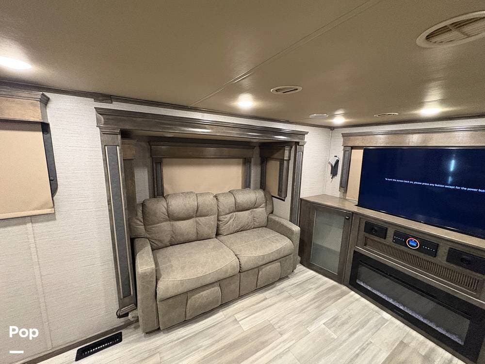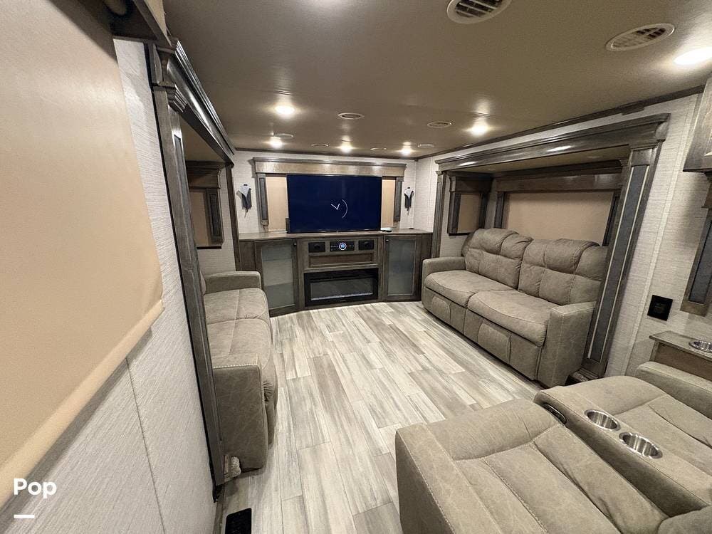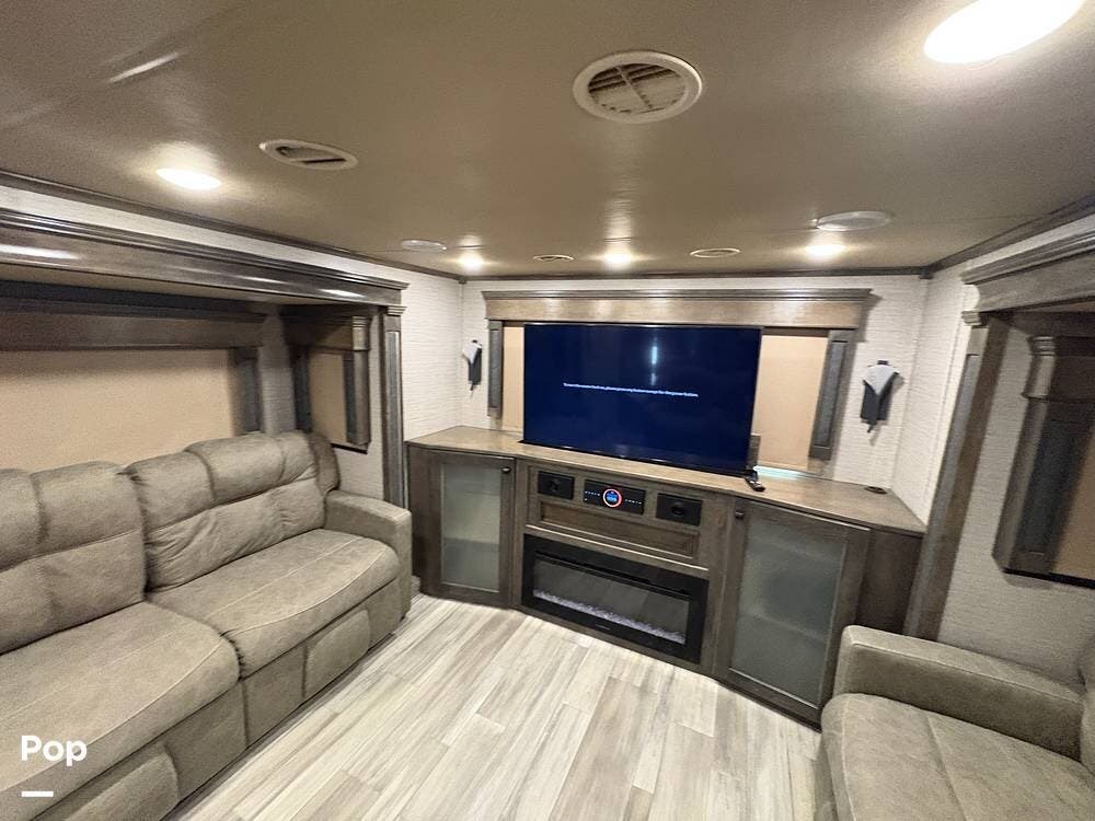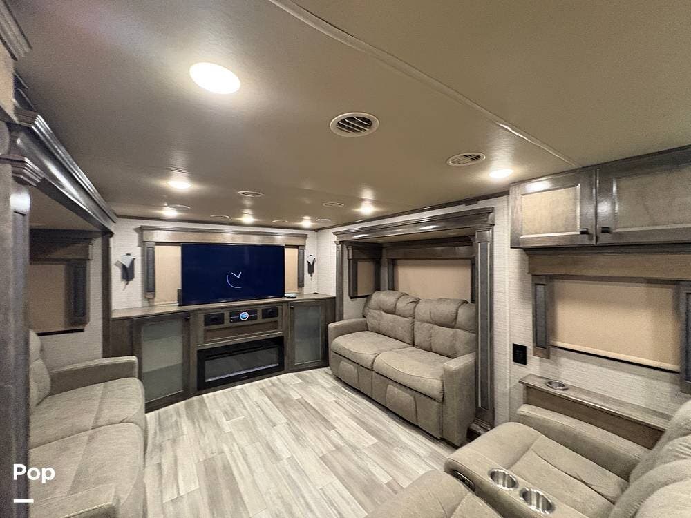 Built on a solid foundation with high-end construction, this model features a spacious rear den floor plan. It is highlighted by an inviting entertainment area with plush seating, a large TV, and a fireplace, making it perfect for relaxing or hosting guests.