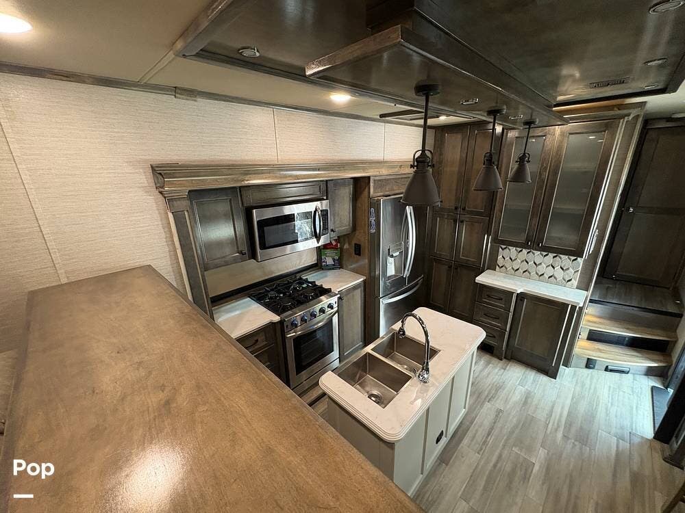 The gourmet kitchen offers high-quality appliances, ample counter space, a center island, and abundant storage, giving it a true residential feel.