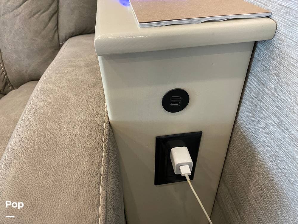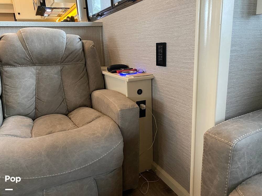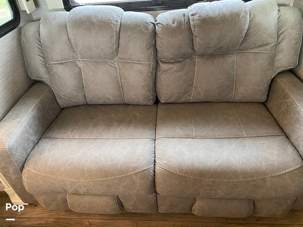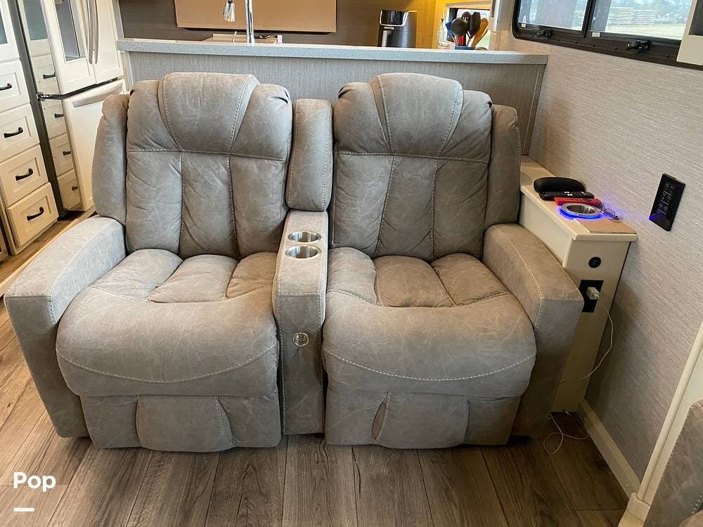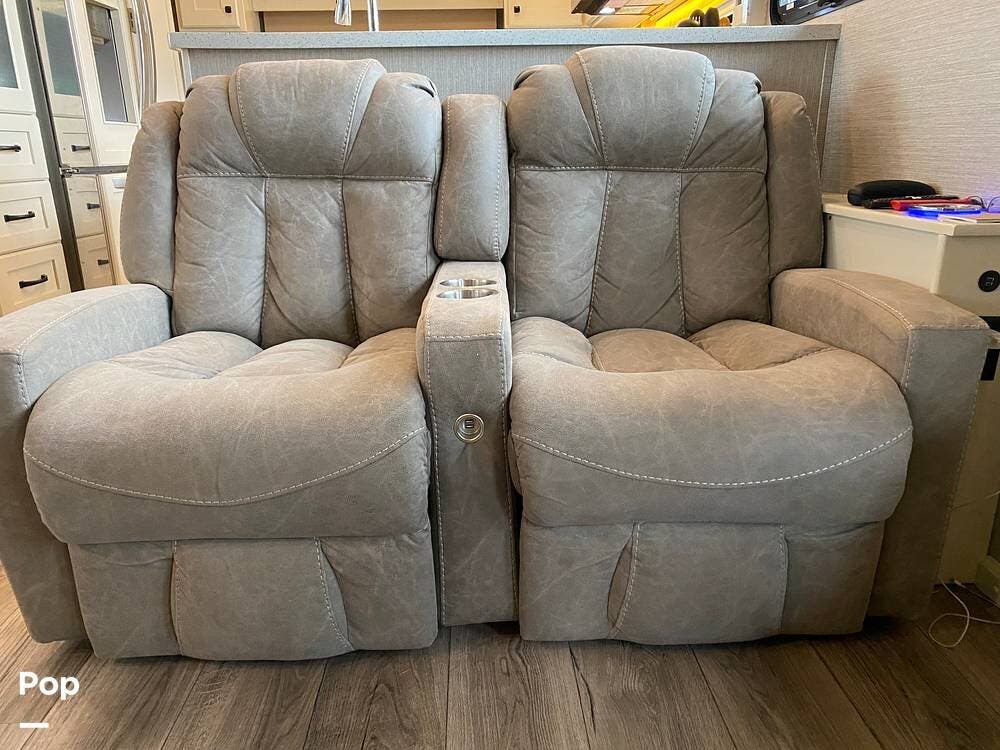 Inside, you'll be amazed by the luxury and comfort. The midsection of the RV has a living area that includes a dual reclining theatre sofa with three cup holders and a trifold sofa sleeper for additional seating.