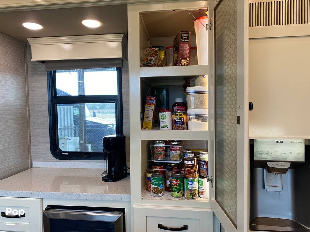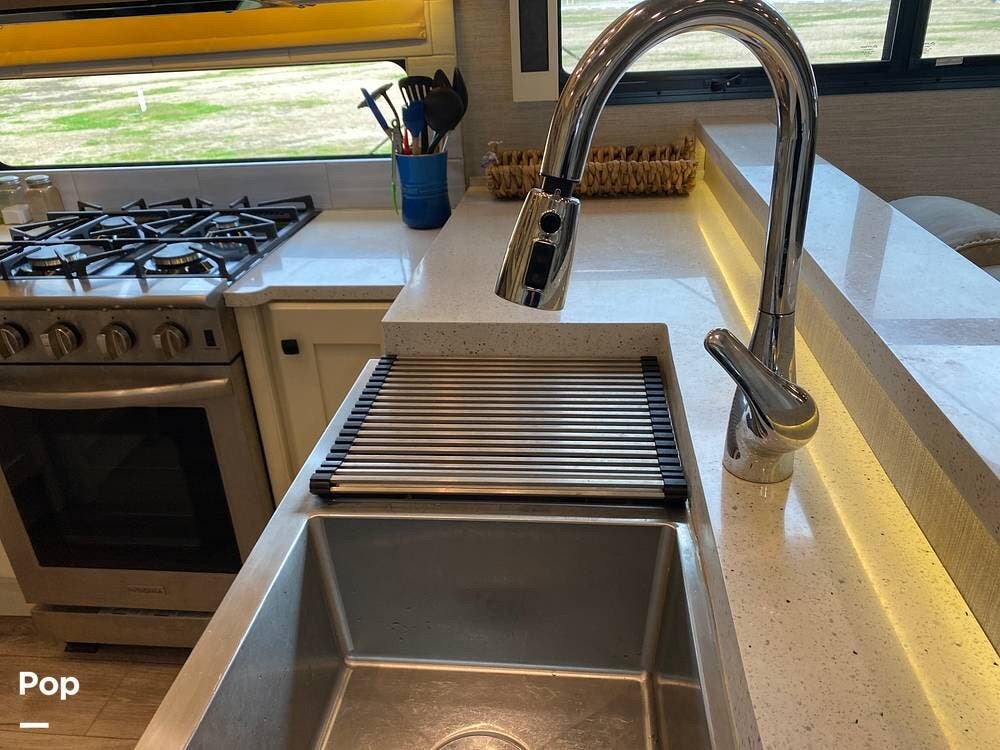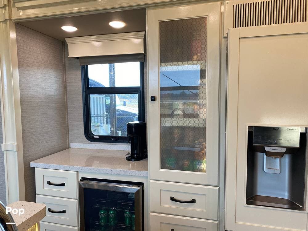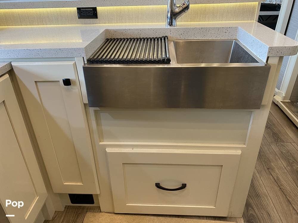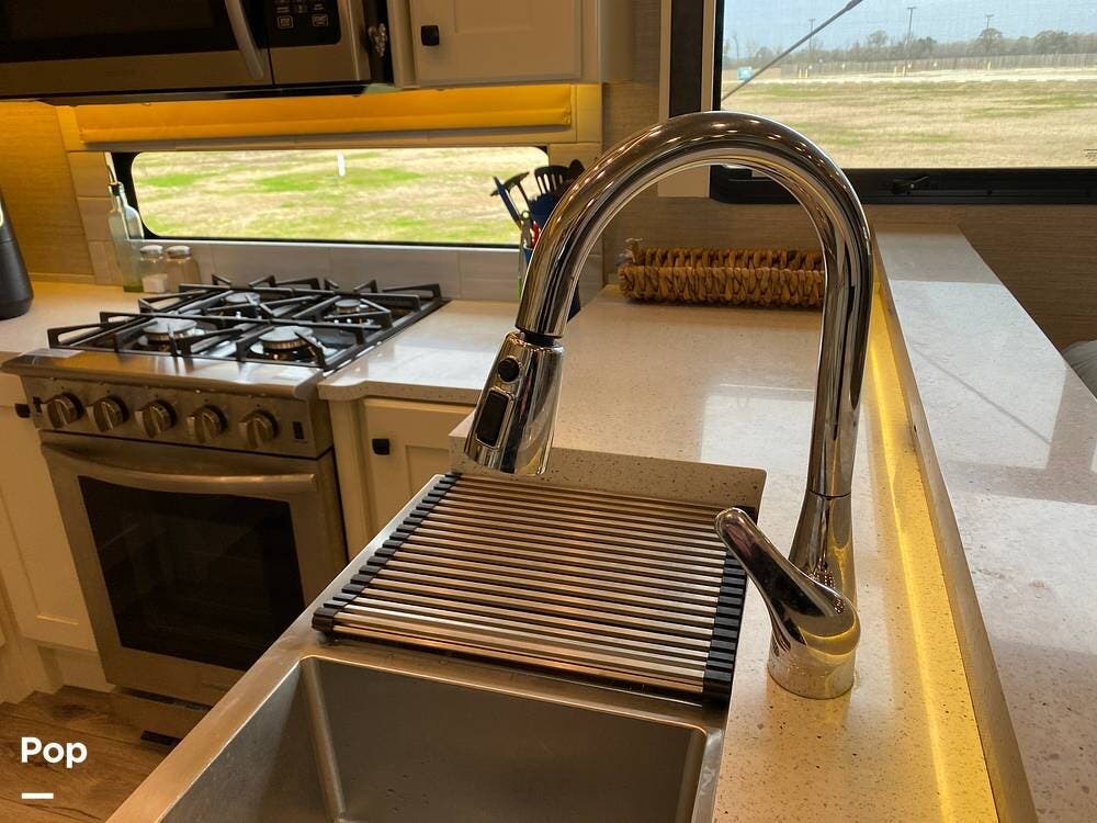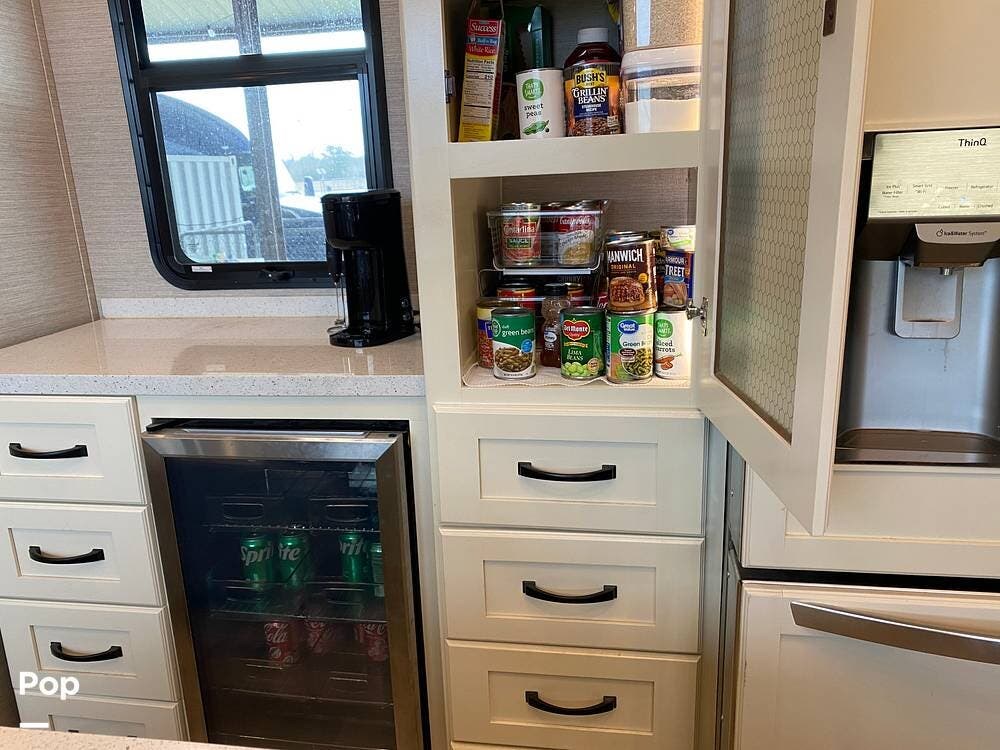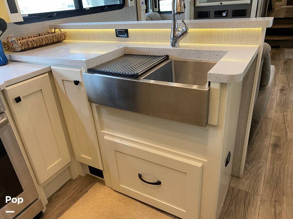 The rear of the RV has the kitchen and dining area, complete with solid surface countertops, a refrigerator/freezer with an ice maker, a built-in drink refrigerator, a four-burner cooktop with a built-in oven, a convection microwave, a farmhouse double sink, a built-in dishwasher, a large pantry, and plenty of storage.