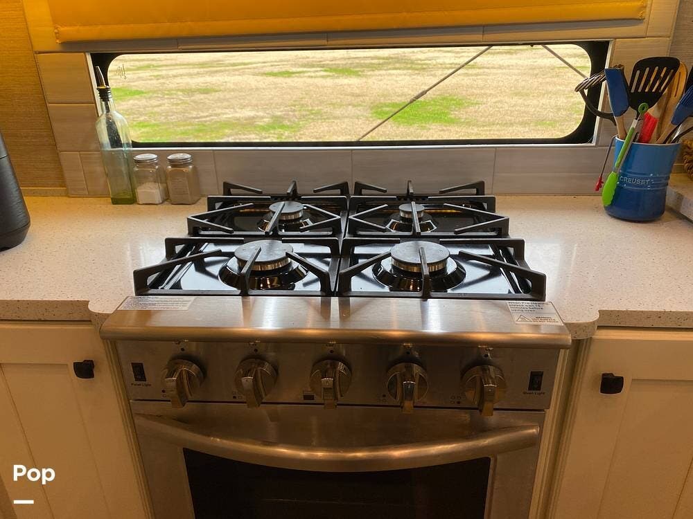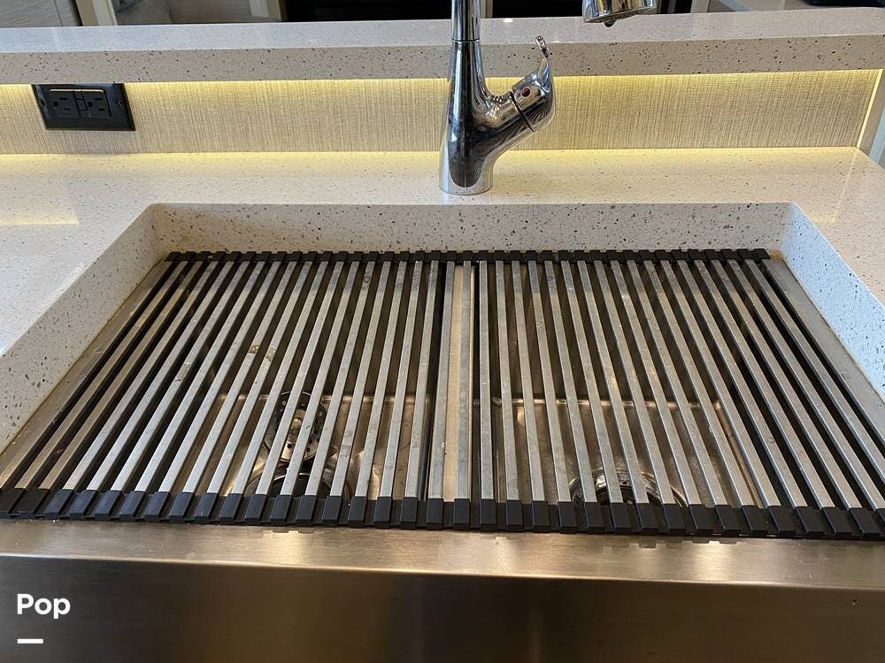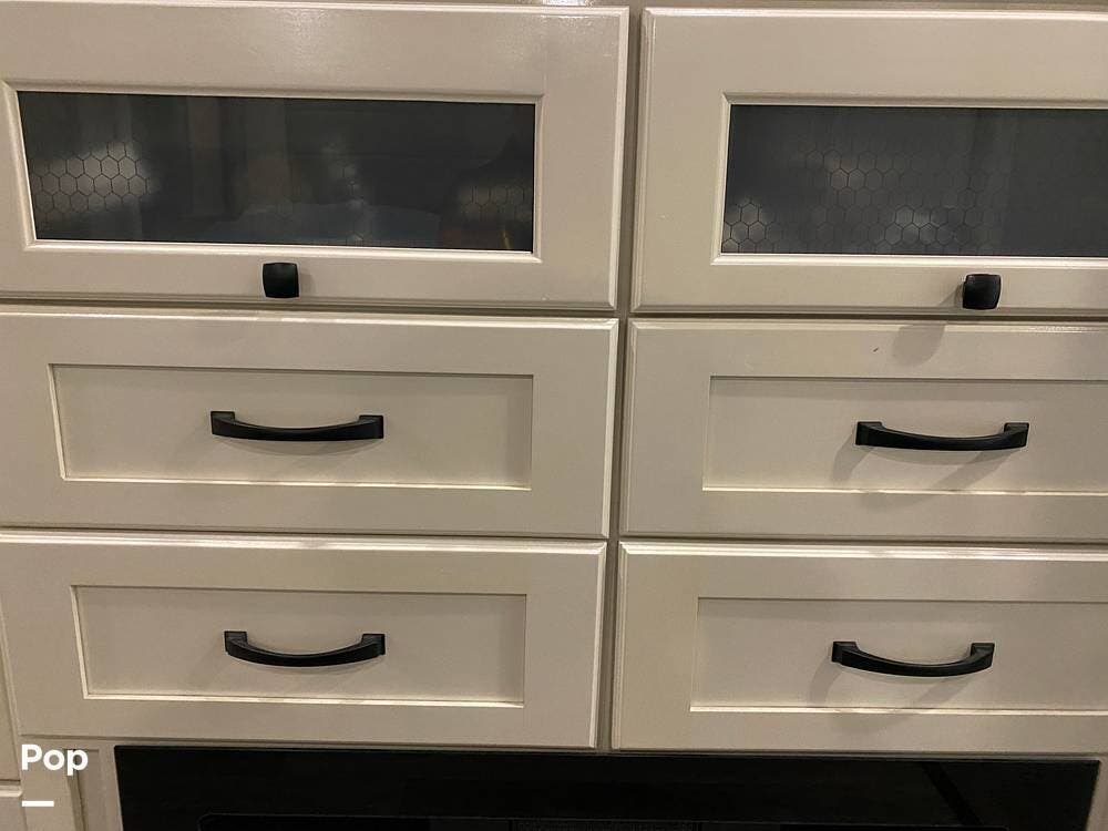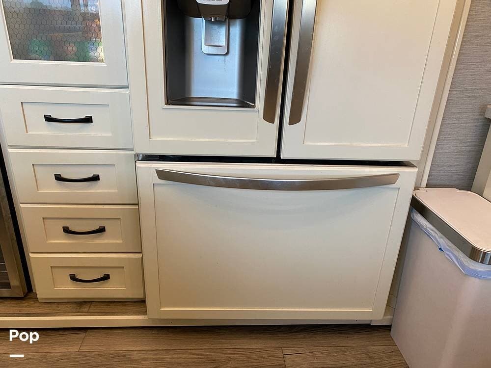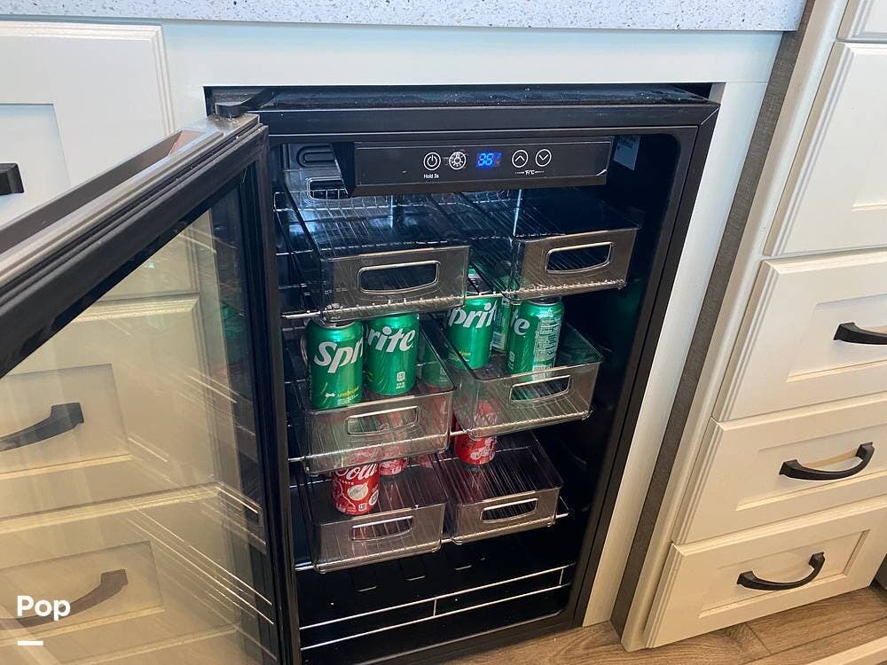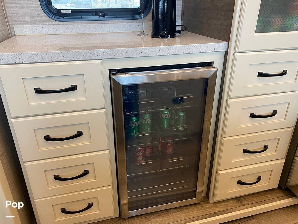 The rear of the RV has the kitchen and dining area, complete with solid surface countertops, a refrigerator/freezer with an ice maker, a built-in drink refrigerator, a four-burner cooktop with a built-in oven, a convection microwave, a farmhouse double sink, a built-in dishwasher, a large pantry, and plenty of storage.