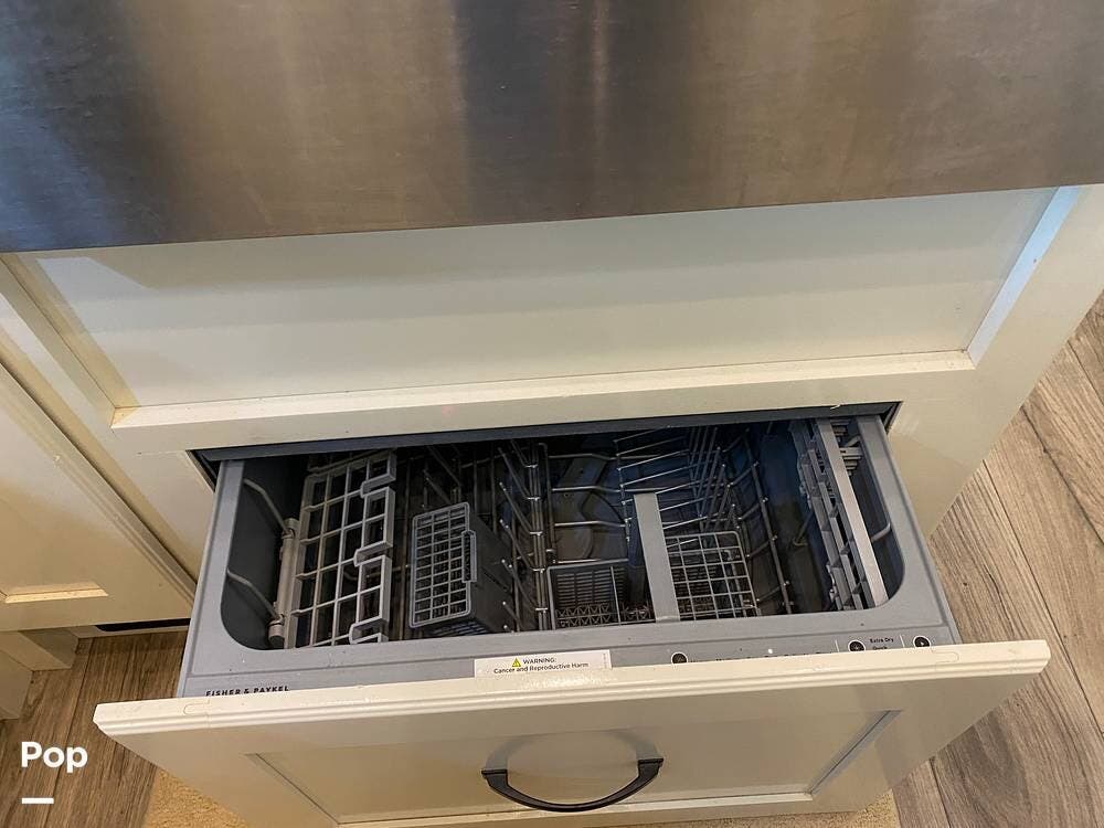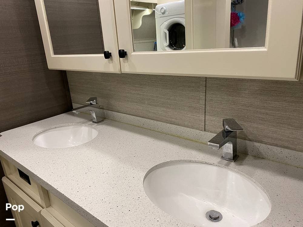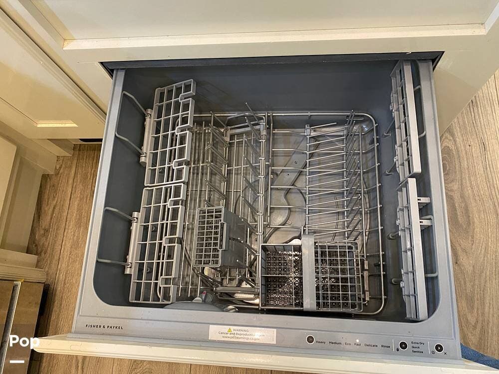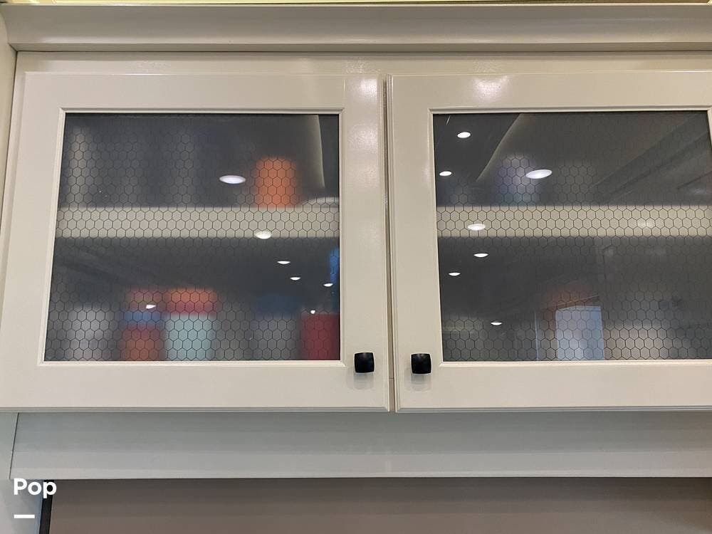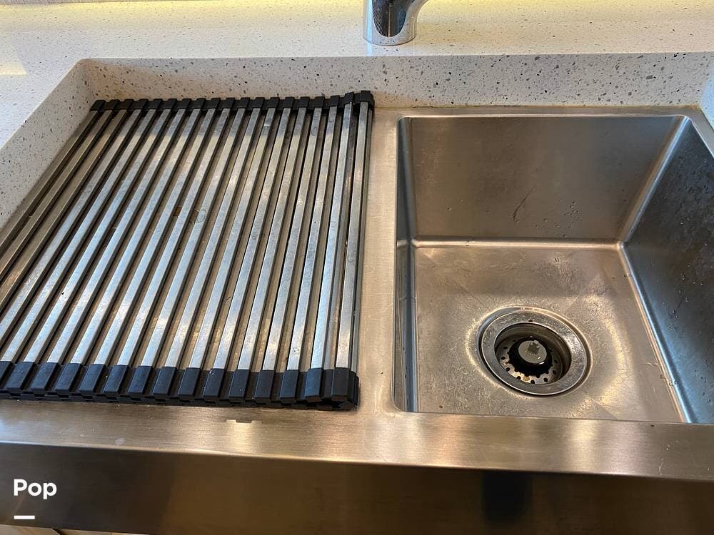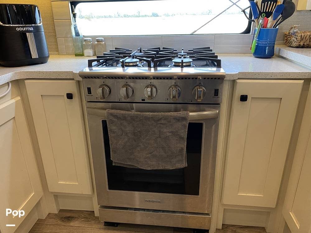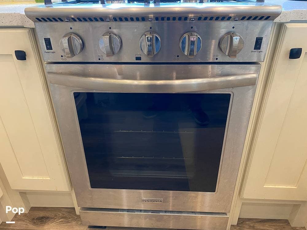 The rear of the RV has the kitchen and dining area, complete with solid surface countertops, a refrigerator/freezer with an ice maker, a built-in drink refrigerator, a four-burner cooktop with a built-in oven, a convection microwave, a farmhouse double sink, a built-in dishwasher, a large pantry, and plenty of storage.