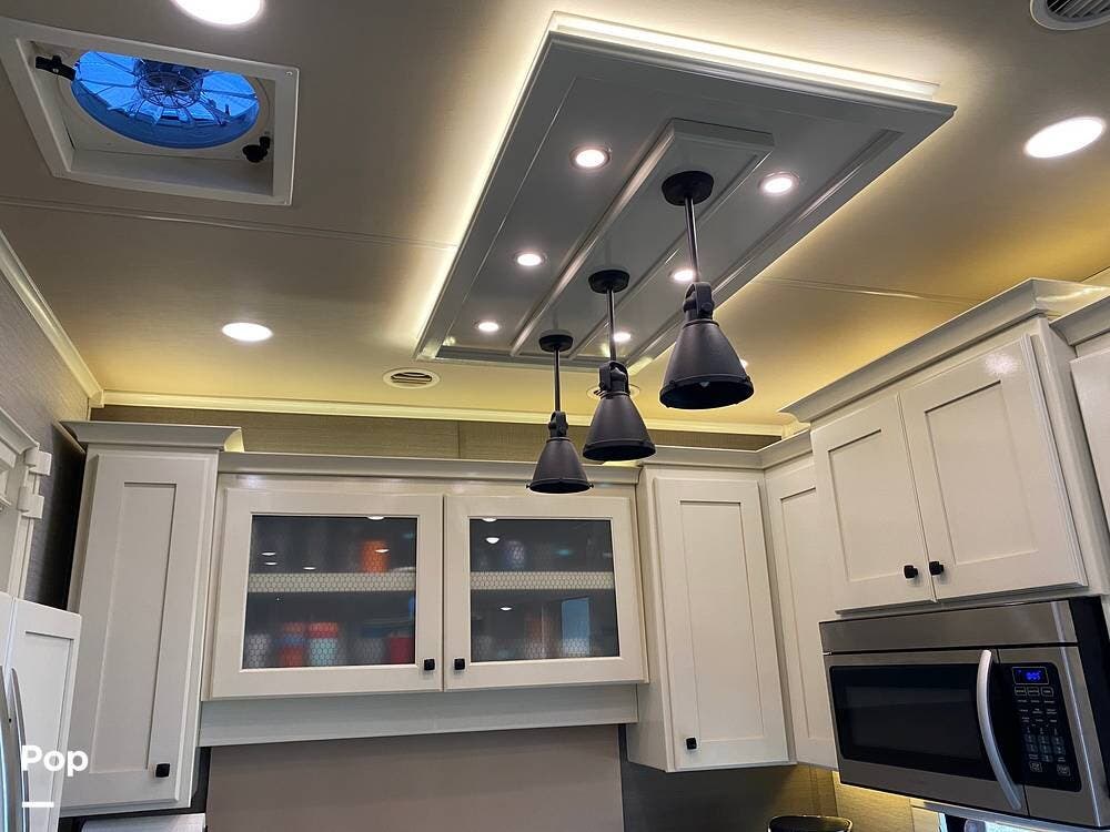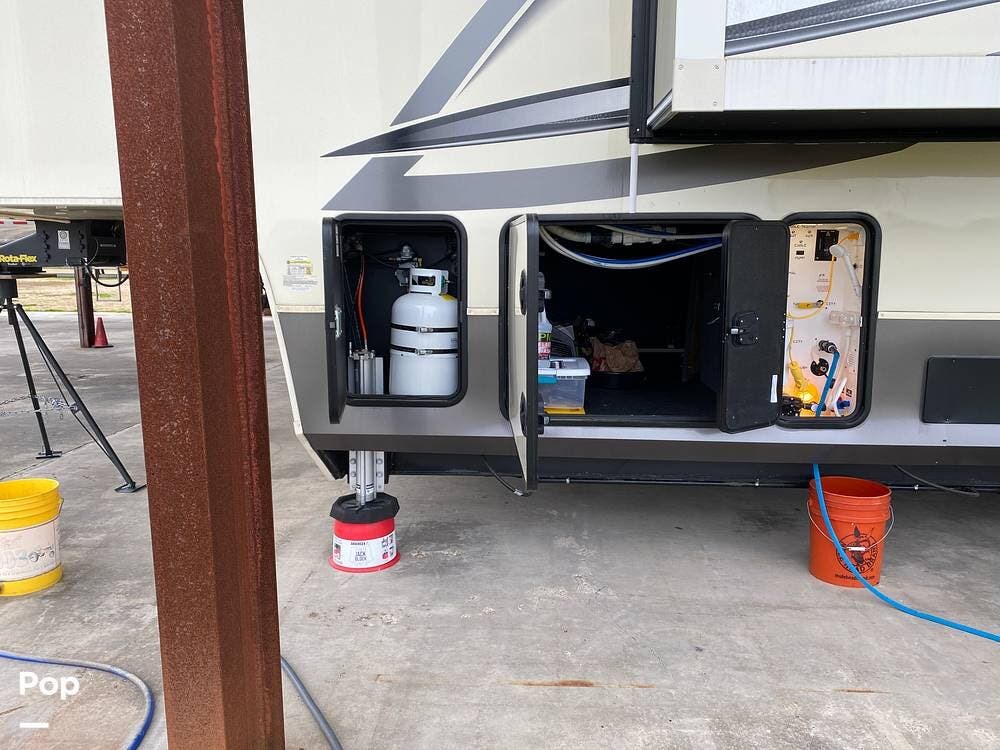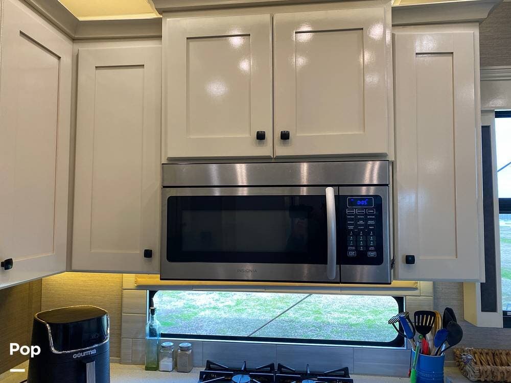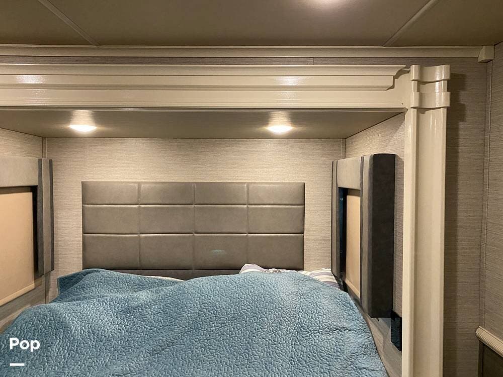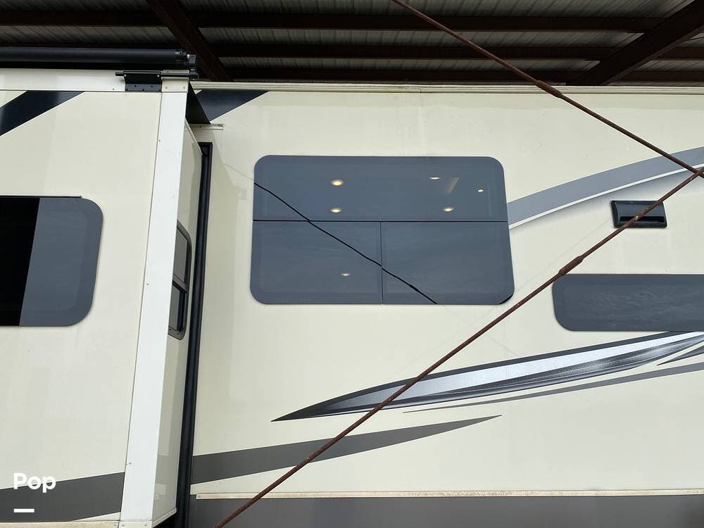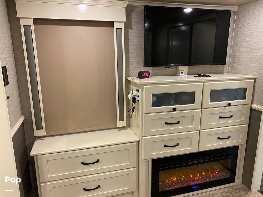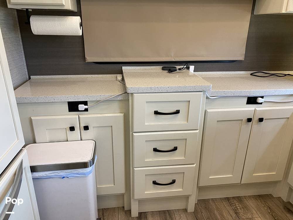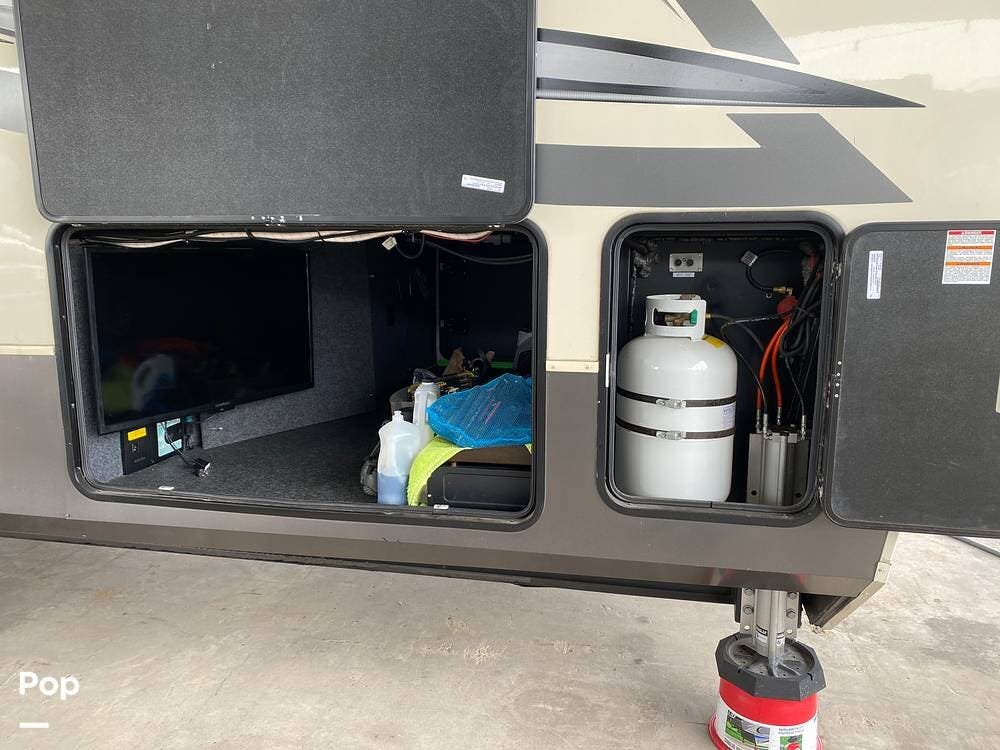 This RV is spacious and comfortable, with four slides with slide awnings and two power awnings. You'll never have to worry about extreme weather conditions as the RV comes with three 15,000 BTU AC units, including a Heat Pump, offering a whopping 45,000 BTU of cooling power. The RV also has a fully enclosed, heated underbelly with heat return and 12V Electric Tank Heaters, making it a four-season RV.