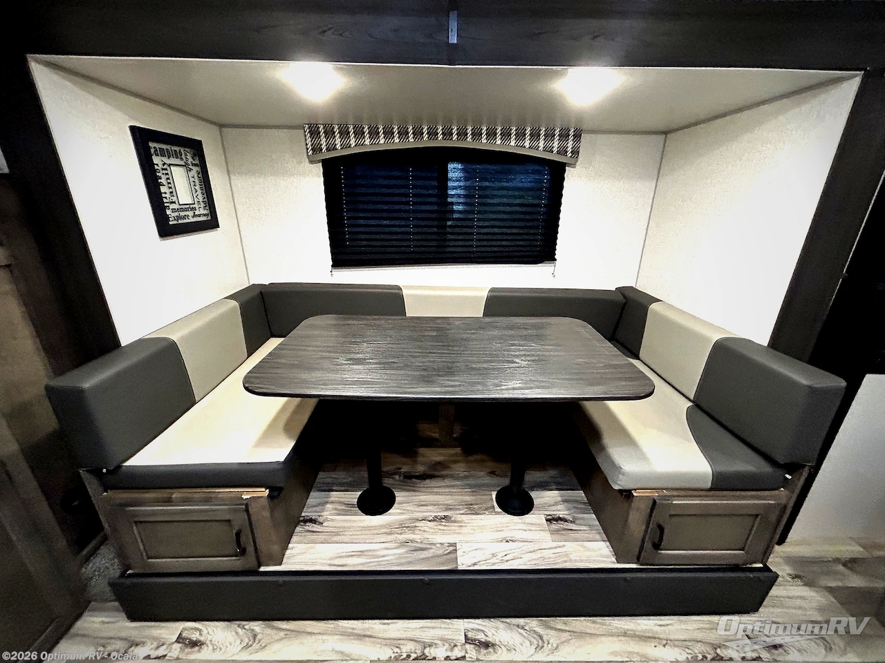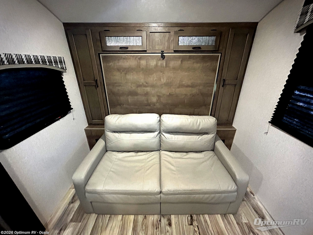 A cook will love this trailer with the choice to make meals inside with full amenities including an 8 cu. ft. refrigerator and a pantry, or outside while using the campfire cafe which offers a griddle and refrigerator, plus counter space to prepare and serve meals. There is sleeping space for four when you utilize the U-shaped dinette slide out that also provides more interior floor space along with the versatile Murphy bed and sofa up front. You will also find a privacy curtain that will section off this area that also features StorMore bedside nightstands with a 110V outlet and USB charging, and two wardrobes.