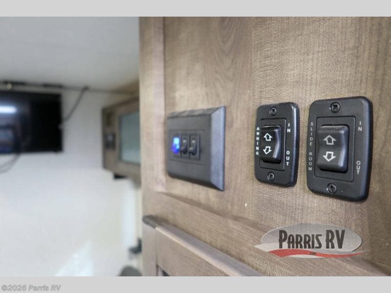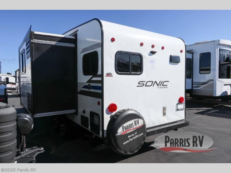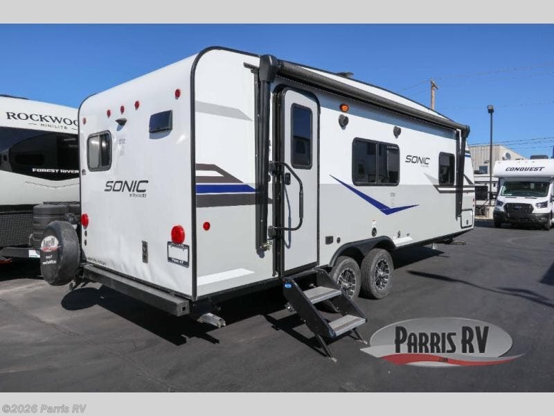 Looking to hike the trails, fish the lake, cook indoors and relax while visiting with other RVers? This Sonic offers the perfect home-base to accomplish all of that plus some! Beginning with the rear kitchen, the cook will love the counter space to prepare and serve meals, and it provides an easy way to grab your food as you head outside to relax under the 17' power awning when dining outdoors. The single slide out provides more interior walking around space, and you can stretch your legs out while enjoying the jiffy sofa or the 65" x 48" booth dinette. The convenient walk-through bathroom offers easy access while in the main area as well as the front bedroom which includes an RV queen bed, StorMore bedside nightstands with a 110V outlet and USB charging, plus wardrobes. And, you can store your outdoor gear such as fishing poles, camping chairs and such in the exterior pass-through storage that includes a motion-activated light.