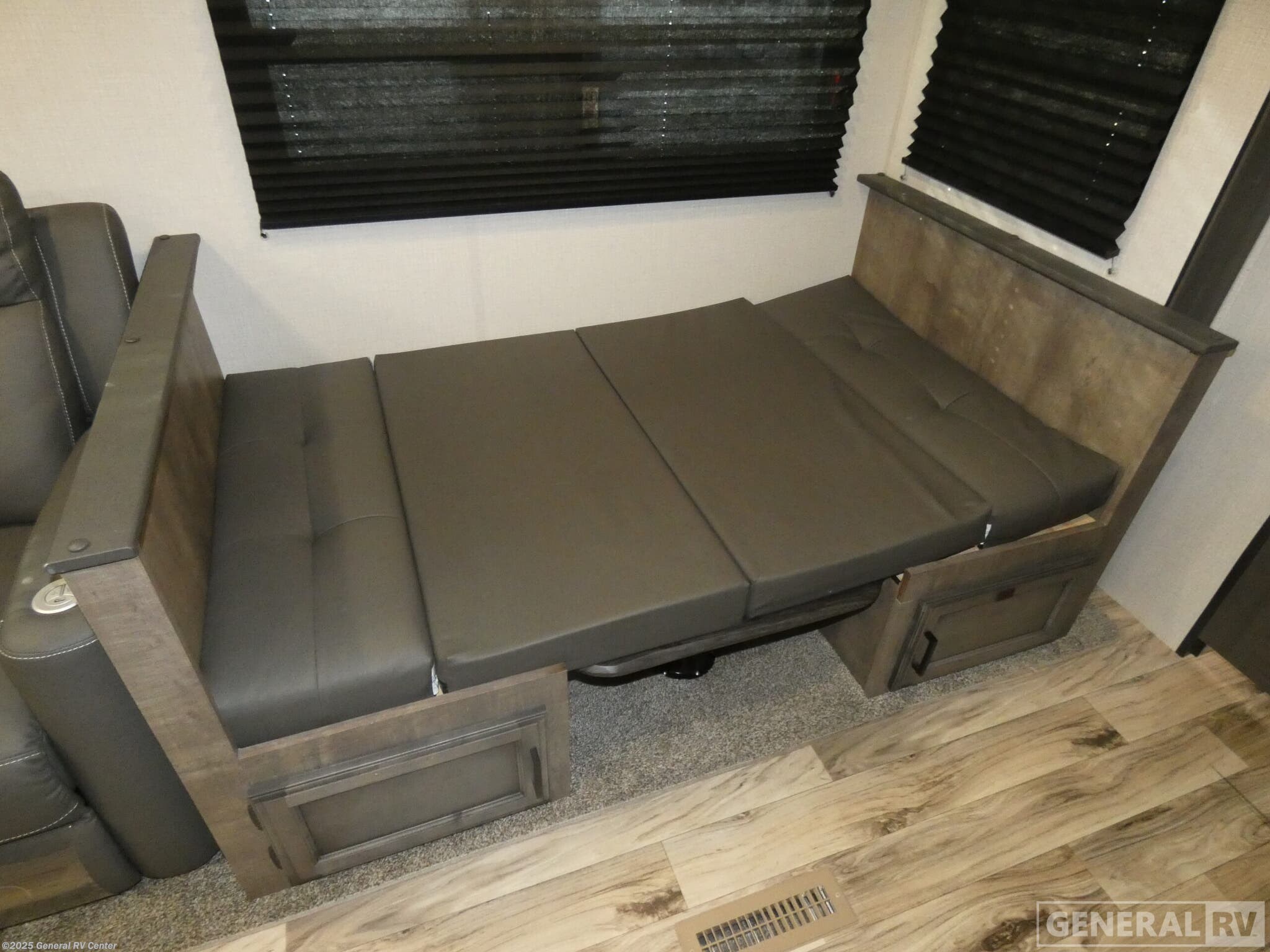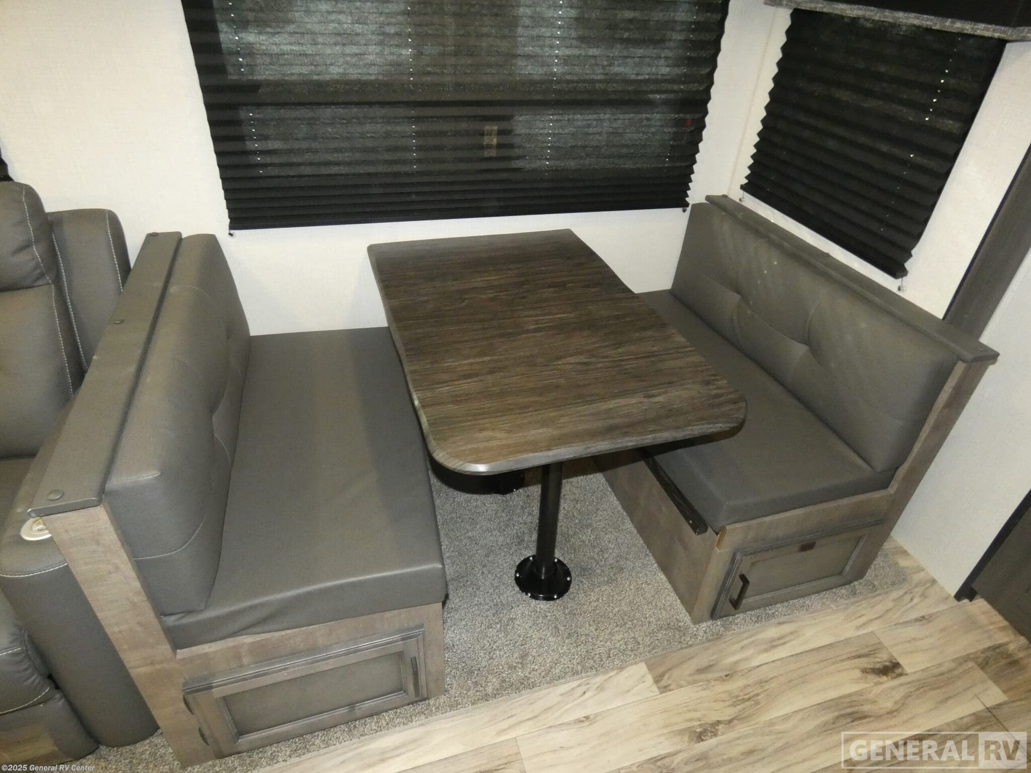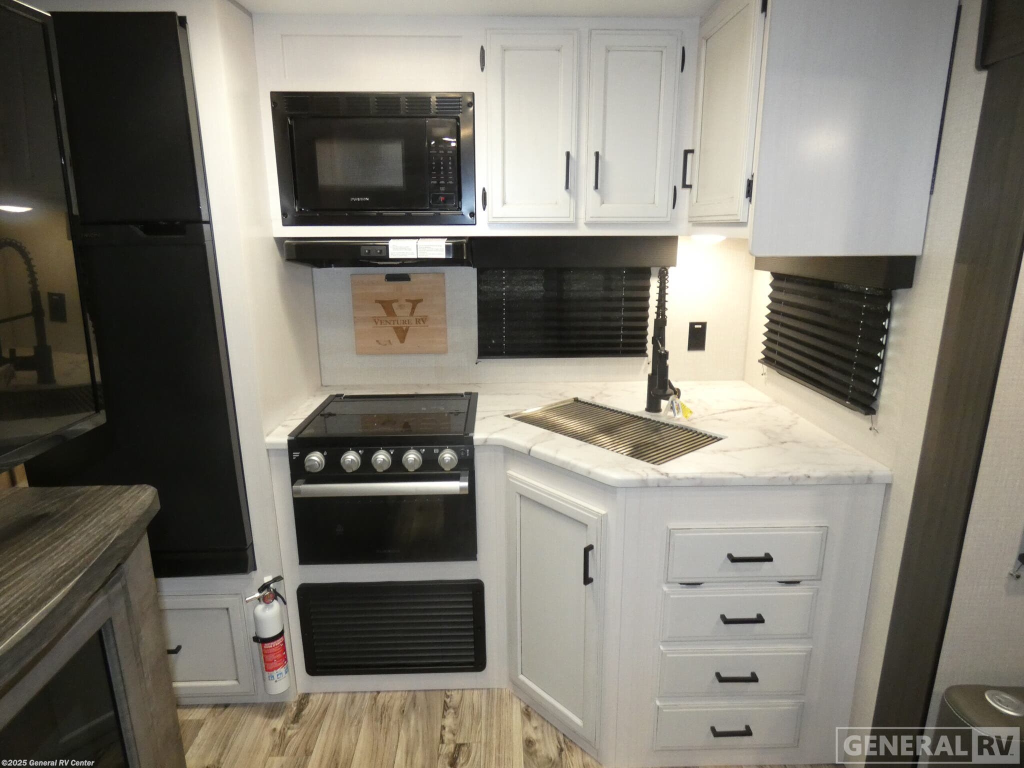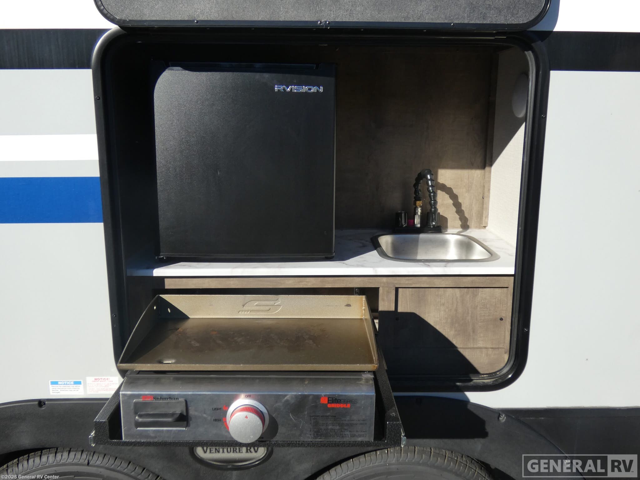 The chef will love the open rear kitchen area of this travel trailer! The 10 cu. ft. double door refrigerator is big enough to hold your perishables. You can even cook outside with the campfire café that has a refrigerator, a sink, and a griddle to grill some burgers while breathing in fresh air. Just be sure to grab your coat hanging on the coat hooks in the walk-in pantry before heading out the door. A 70" sofa and 42" grand dinette slide adds more walking around space, as well as comfortable places to eat, relax, and even sleep once converted. Everyone can freshen up in the full bathroom with the 34" radius shower and even have their towel close by thanks to the linen closet next to it! Every Venture RV SportTrek lightweight travel trailer is constructed to offer peace of mind and the comforts home! Their purposeful residential kitchens are packed with handy features like a recessed gas cooktop with glass cover for more countertop space, a sink cover to drain food and dishes which can be rolled out of the way for sink use, and continuous countertops. You will find plenty of storage throughout with unique areas like the under-seat removable storage tubs below the dinette cushions, the oversize, deep heavy-duty pot and pan drawer, and the StorMore nightstands on either side of the bed behind the full-length closets. The magnetic slam-latch baggage doors to the spacious pass-through storage area will hold your outdoor gear in place. They even come with a hot and cold exterior shower and SporTrek's Weather Shield which includes a radiant foil barrier, forced heat, enclosed underbelly, enclosed gate valves, and a reflective PVC roof membrane. What more could you want, come find your favorite model today!