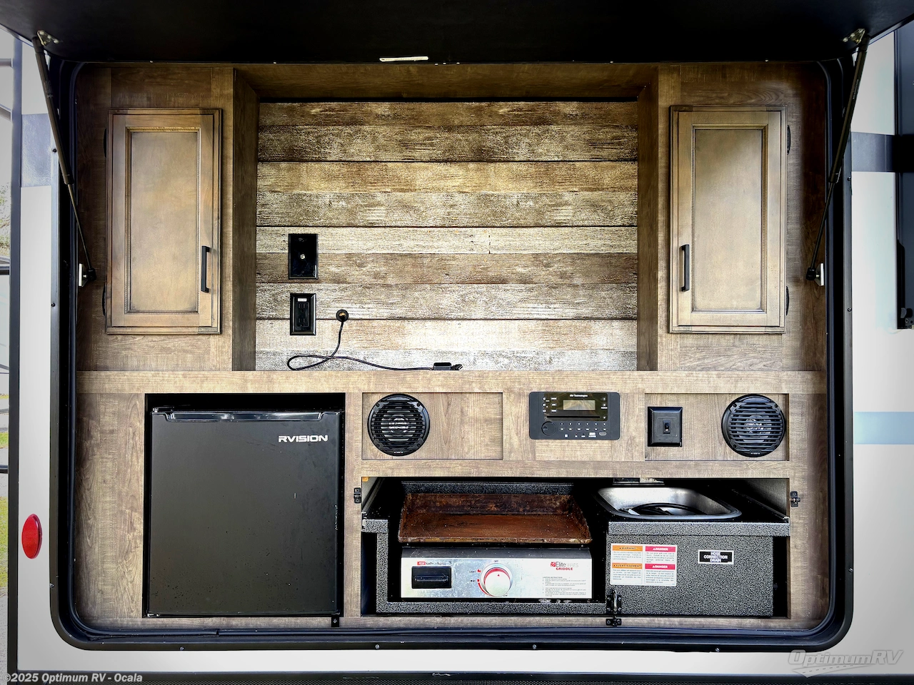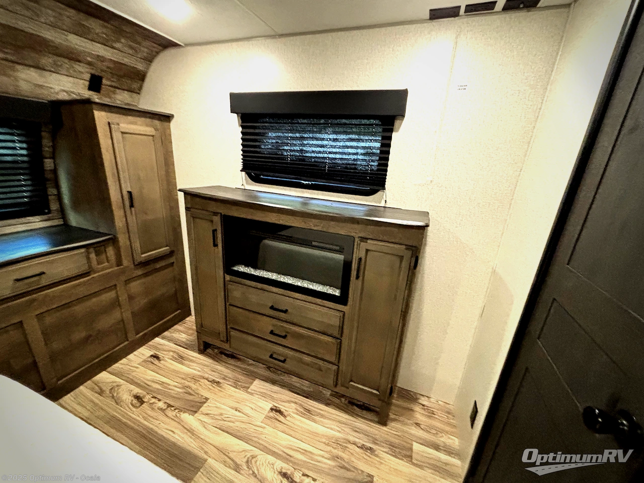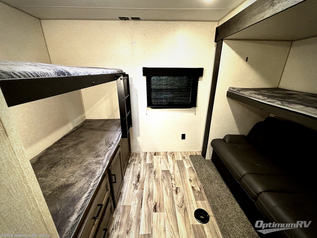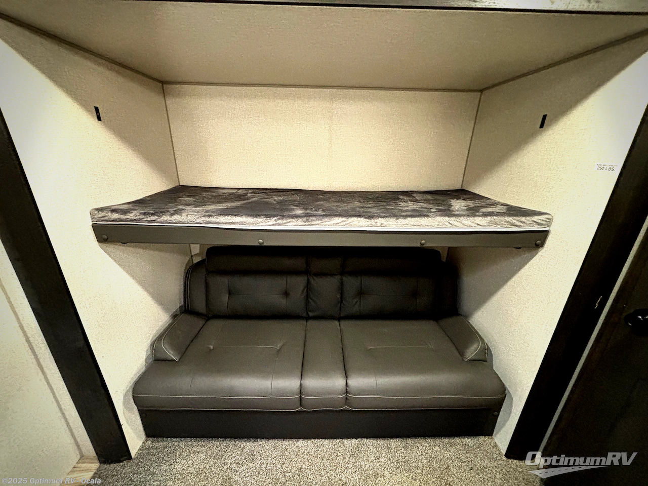 The whole family can camp together in this travel trailer! It features a rear private bunkhouse with a 28" x 70" top bunk above a 40" x 70" bottom bunk, a closet, and a 28" x 73" flip up top bunk above a 70" sofa with table slide. One of the dual entry doors leads directly into the half bathroom with fold-out aluminum steps so you can get back to having fun faster. The chef can prepare their best meals for the crew either indoors with the three burner cooktop or at the exterior campfire café with a 40" TV/DVD/speakers to entertain them while they cook. Everyone can gather together at the 42" grand dinette and 70" tri-fold sofa across from the entertainment center with a fireplace for a cozy evening. The dual entry bathroom is easy to access, especially for those staying in the front private bedroom. You even have a coat closet next to the main entrance to limit the clutter!