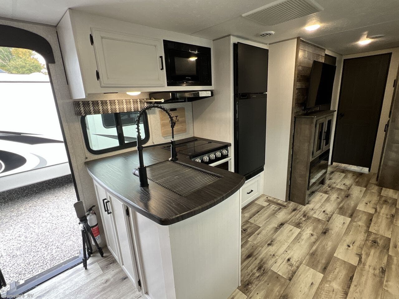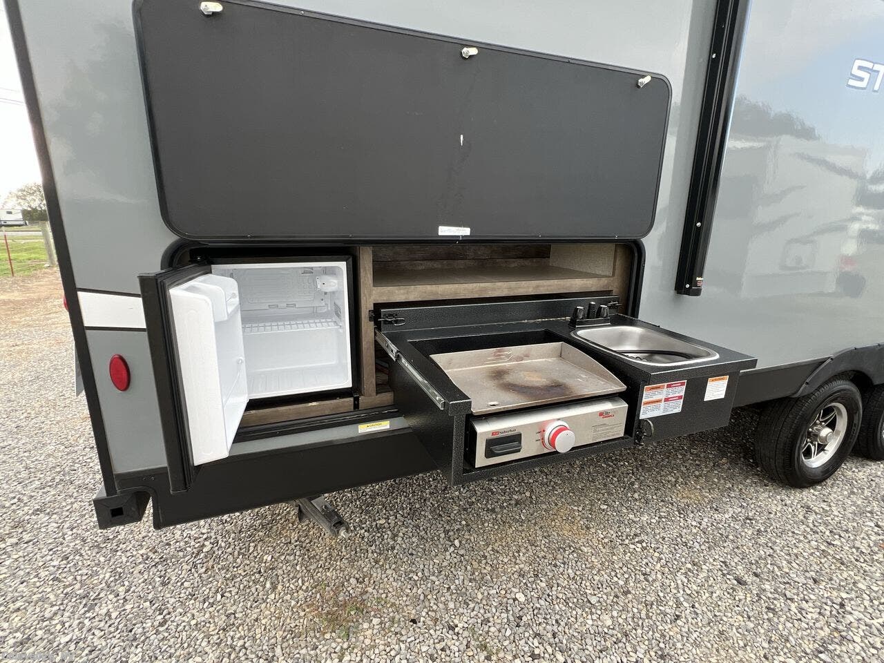 Enjoy your RV travels in style with this 2022 Venture RV Stratus SR291VQB. By owning this 2022 Venture RV Stratus SR291VQB, you’re joining the Venture RV family! If you’re looking for a family RV, you’ve found it: this rig sleeps 10. Setup is a breeze thanks to one roomy slide. Cook up the best camping meals with appliances like the fridge, oven, stove. With the booth dinette, you’ve got the perfect place for family meal times. Comfort is important when RVing, and you’ll find just that with the queen bed. You’ll never get too hot or too cold inside your rig thanks to the A/C option. The 45 gallon fresh water tank is just right for easy RV traveling. Outside, you’ll find awning, exterior speakers, external shower, hitch, ladder, leveling jacks, outside kitchen, skylight, slideout and spare tire kit. An outside shower makes it easier to keep your adventure rig clean. This rig is perfect for enjoying meals outside on warm summer nights thanks to the outside kitchen.