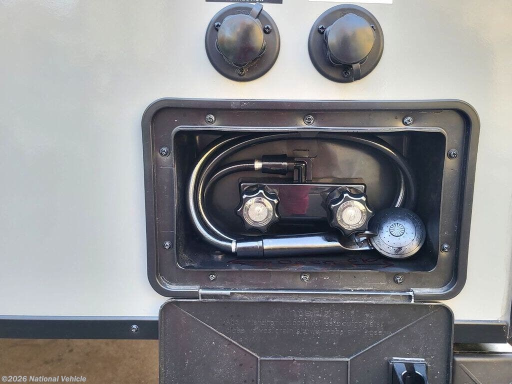 Premium Exterior Package includes: Tension screen door and tension exterior door w/darkening blind - Folding inside door aluminum steps - 13 ft power awning w/LED lighting - Outside kitchen w/cooktop grill and refrigerator - Outside shower - Outside speakers - Large side to side outside storage compartment - Wired for back up camera - Power Ton jack for raising and lowering trailer - On/Off light @ jack - Level Pro mobile app - ON/OFF knob for Deep Cycle battery - 30 ft/30 amp power cord - Four attached stability jacks - Wide heavy duty tires - Spare tire w/ Patriotic cover - Equalizer Sway Control Hitch {Value = $850}