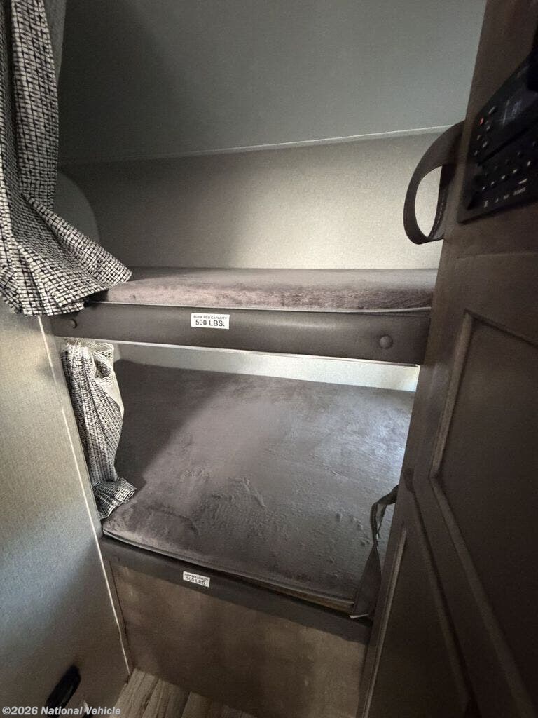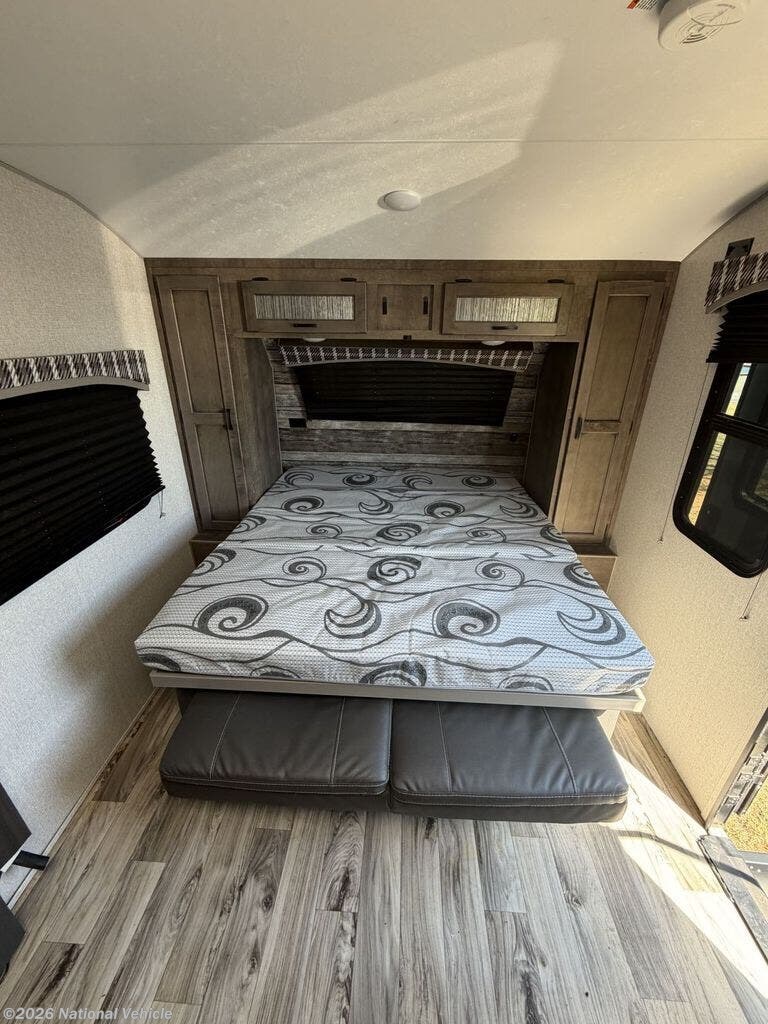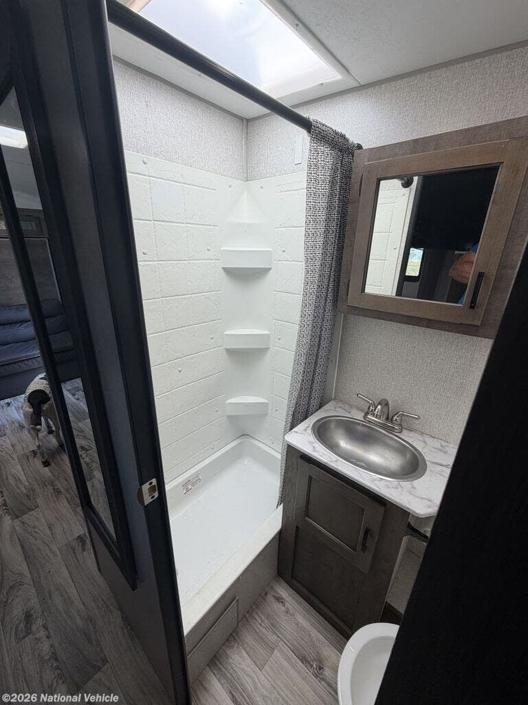 The versatile rear bath delivers a residential feel with a large shower, vanity, motion-activated lighting, and smart storage. The booth dinette provides a cozy spot to dine or unwind and converts easily into extra sleeping space. Up front, the private queen bedroom offers a walkaround layout, overhead storage, and wardrobe space?creating a true retreat wherever the road takes you.