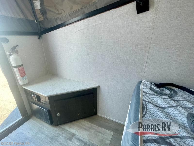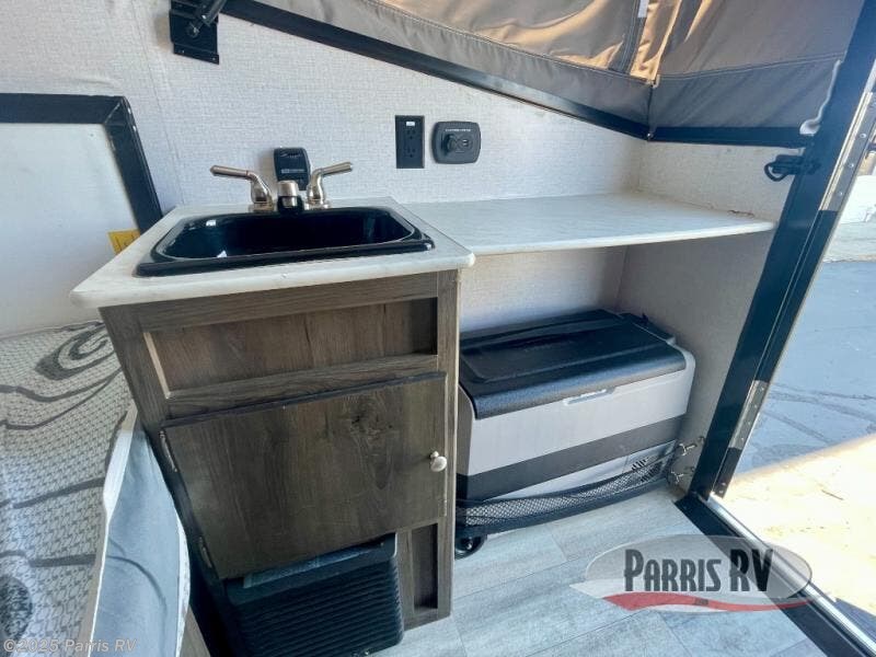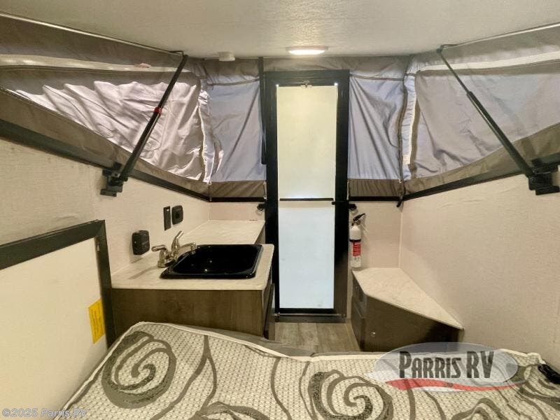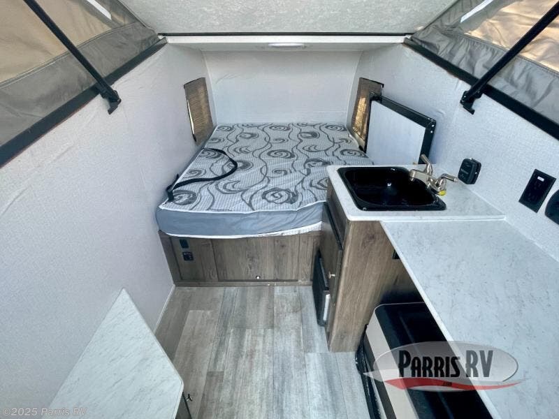 If you want to keep your camping trips on the minimal side, check out this Express Series folding pop-up camper! You can stay warm with the furnace, and you can wash your hands or your produce in the sink. There is a bench seat directly to your left when you enter, so you can sit down to tie your shoes. The countertop to your right when you walk in the door is able to hold items, or you can use it as a preparation area. The 54" x 74" bed will allow you to sleep in comfort each night without having to sleep on the cold, hard ground.