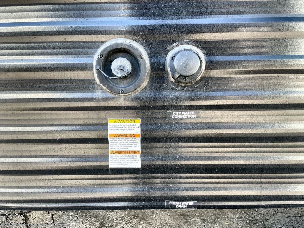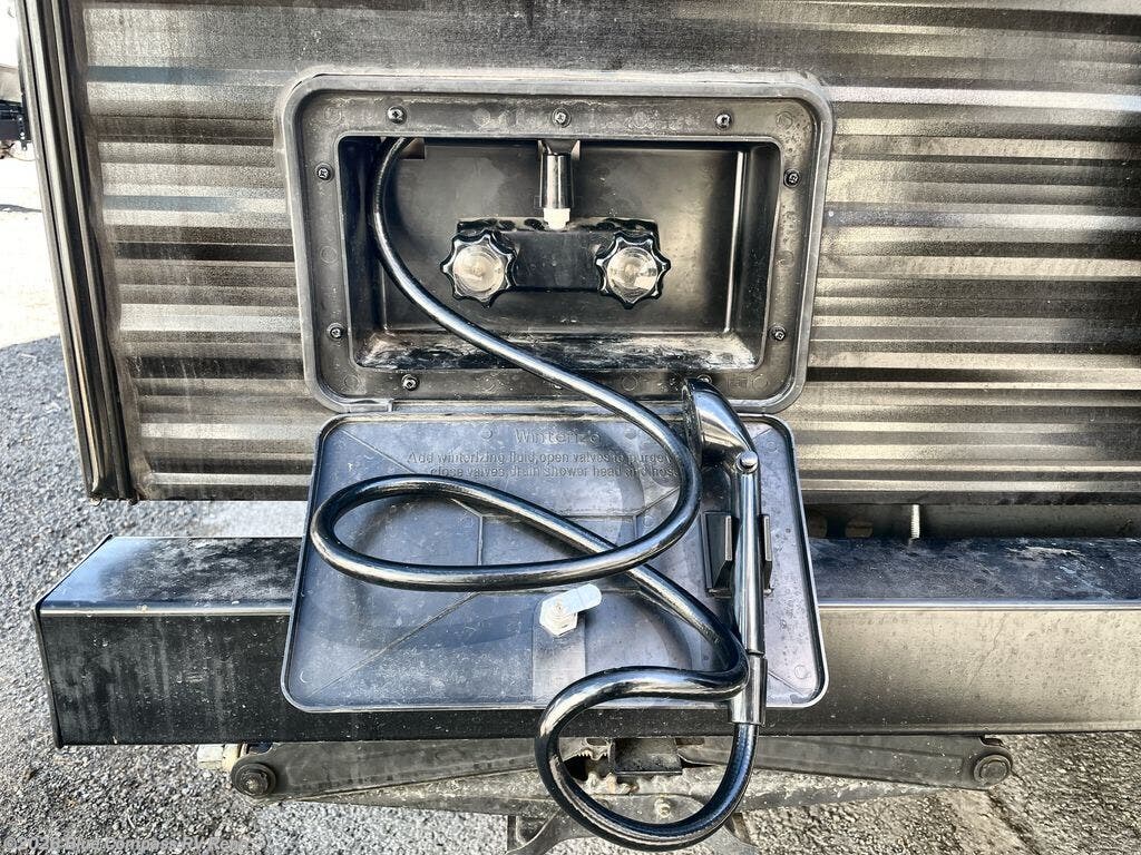 You and your family or friends will experience versatile living with a front Murphy bed located behind the U-shaped dinette with a free-standing table, and the bed can be pulled down after you have enjoyed your dinner and played a few card games at the dinette. And the kids or your guests will love the bunk beds! There is a private shower and toilet room which includes a linen closet to keep your towels, plus the vanity is just outside of the bathroom for your convenience. The kitchen offers full amenities, plus a pantry with upper bunk storage, and the cook can make meals using the outside kitchen as well.