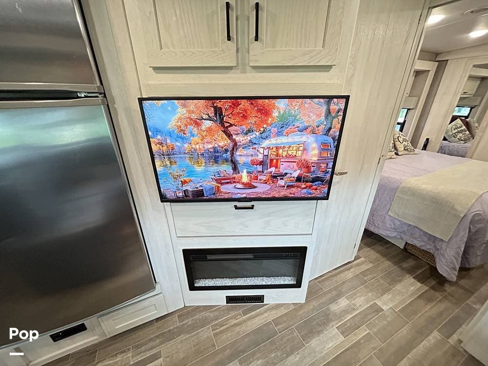 Entertainment options are everywhere, with three TVs, including one outside, paired with an entertainment center--perfect for movie nights under the stars. Dual air conditioners keep the entire cabin cool and comfortable no matter the season, and an electric fireplace adds a cozy, inviting touch.