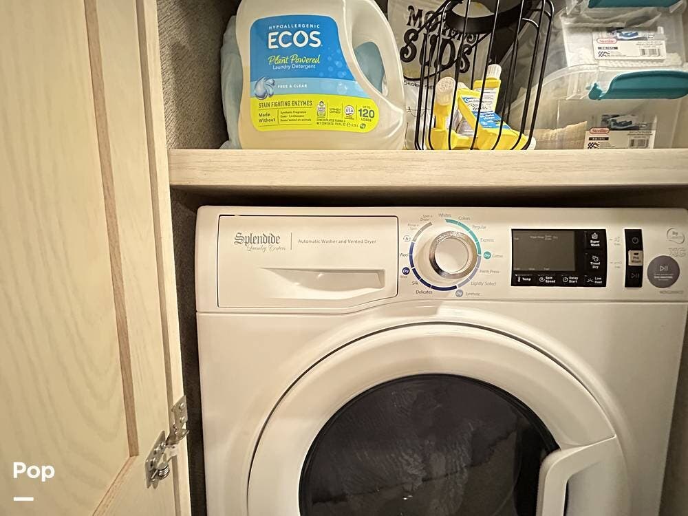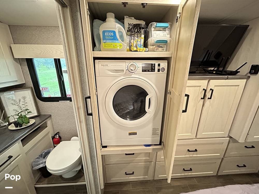 Inside, you'll find two full bathrooms, offering added privacy and convenience for larger groups or families. A washer/dryer combo makes life on the road even more practical.